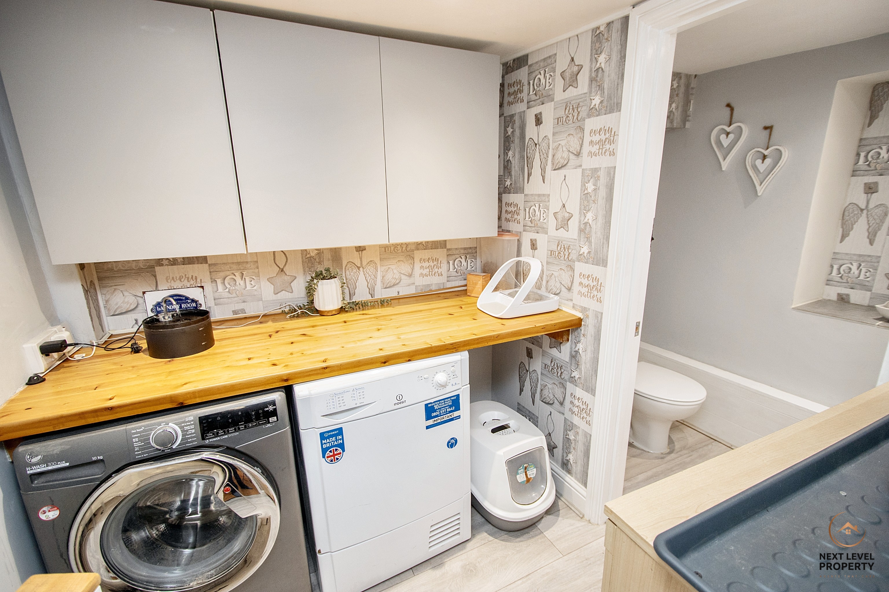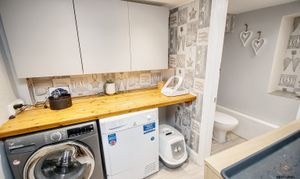 A well-planned laundry room fitted with wall cupboards for storage and a butcher’s block style work surface, with space provided for both a washing machine and tumble dryer. Off this room is a convenient cloakroom, fitted with a low-level WC and a pedestal hand basin