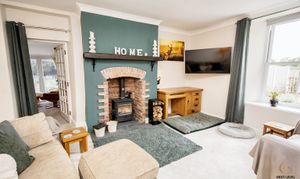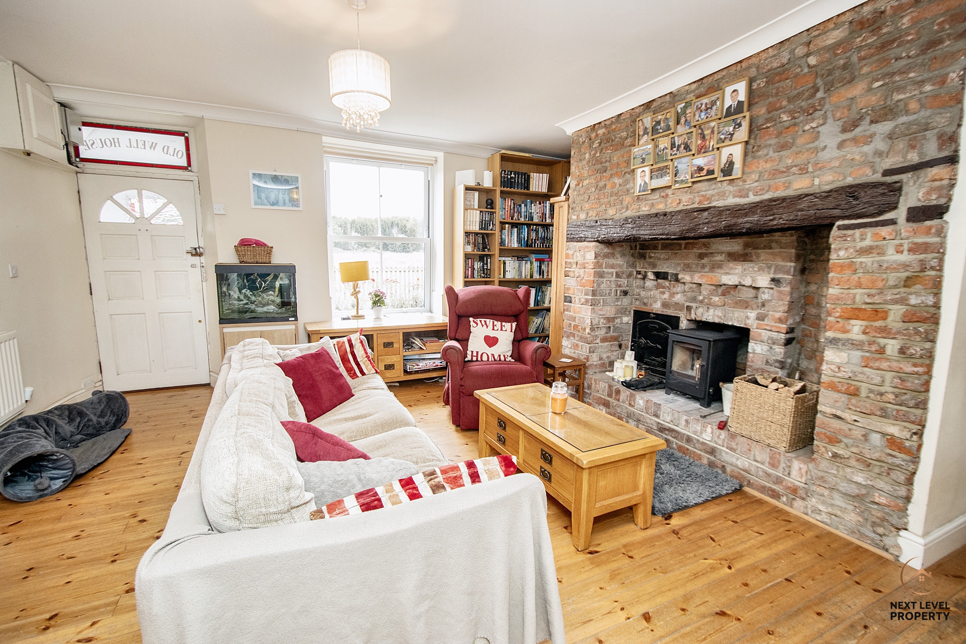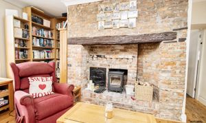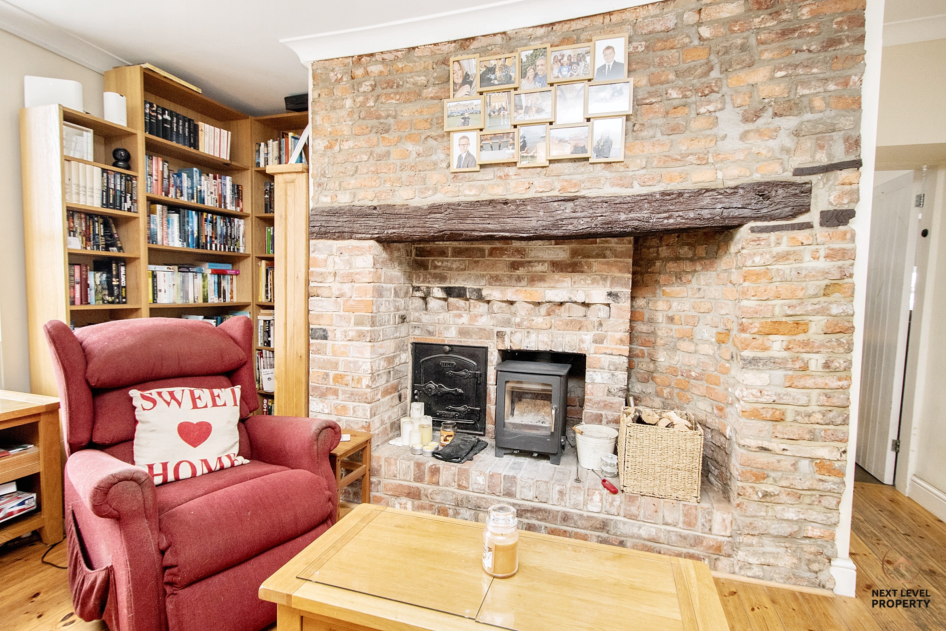 The sitting room enjoys a traditional feel, with a charming latched door and a brick fireplace housing a fitted wood burner — perfect for creating a cosy atmosphere. A sash window to the front adds natural light, while a walkway connects effortlessly into the living room, giving the space an easy flow