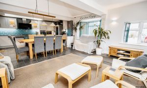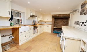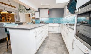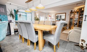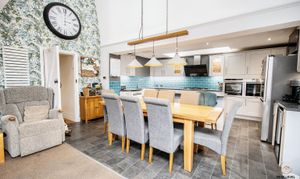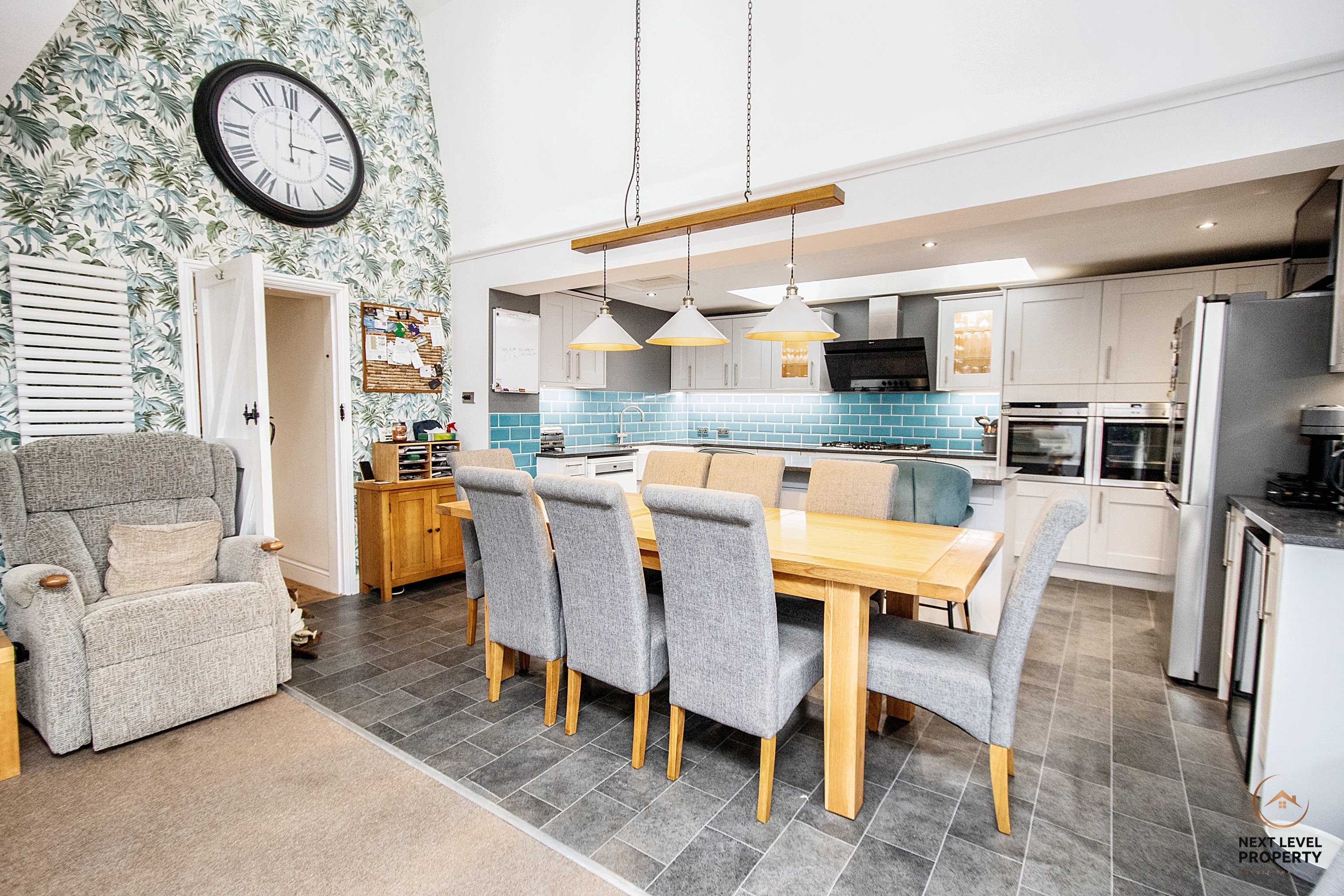 A truly stunning kitchen and dining space, recently refitted to an exceptional standard. The kitchen is equipped with a 5-ring gas hob, twin ovens and extractor hood, with a full range of base, drawer and wall units, complemented by display cupboards with feature lighting. A central island with granite worktops provides both style and practicality, while spaces are in place for a dishwasher and wine cooler. The vaulted ceiling, complete with Velux windows, floods the room with natural light, and the dining area comfortably accommodates a large table and chairs — perfect for family gatherings and entertaining. A bay window to the side adds further charm, with doors leading to the boot room and a walk-in pantry