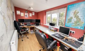 A thoughtfully designed home office with a fitted bench incorporating storage beneath and additional shelving, creating an organised workspace. Ample power points make it ideal for modern working needs, while a window overlooking the rear garden provides a pleasant outlook. A further door leads through to the boiler room