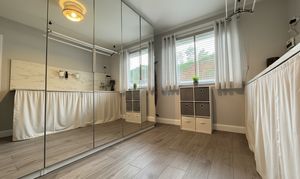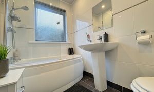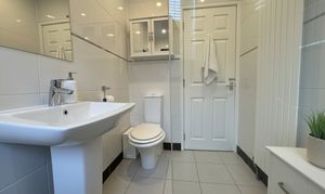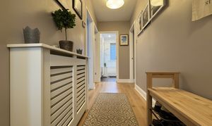 Bedroom Three is conveniently located on the ground floor and enjoys full-length mirrored wardrobes. The room also features a traditional Glasgow Tenement Pulley, and the current owner has utilised this space as a practical utility area. Completing the ground level is a luxurious, fully tiled three-piece bathroom with mains shower over the bath.
