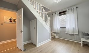 A formal dining room provides a superb space for entertaining, complete with a storage cupboard and staircase leading to the upper landing.