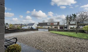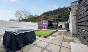 Externally, the property sits within generous garden grounds. The front features a lawn bordered by a garden wall, stone chips, and a driveway running along the gable side to the garage, providing ample off-street parking. The south-west-facing rear garden is designed for low maintenance, offering a slabbed patio, lawned section, and a raised decked BBQ area attached to a large timber shed, ideal for outdoor dining and relaxation.