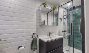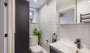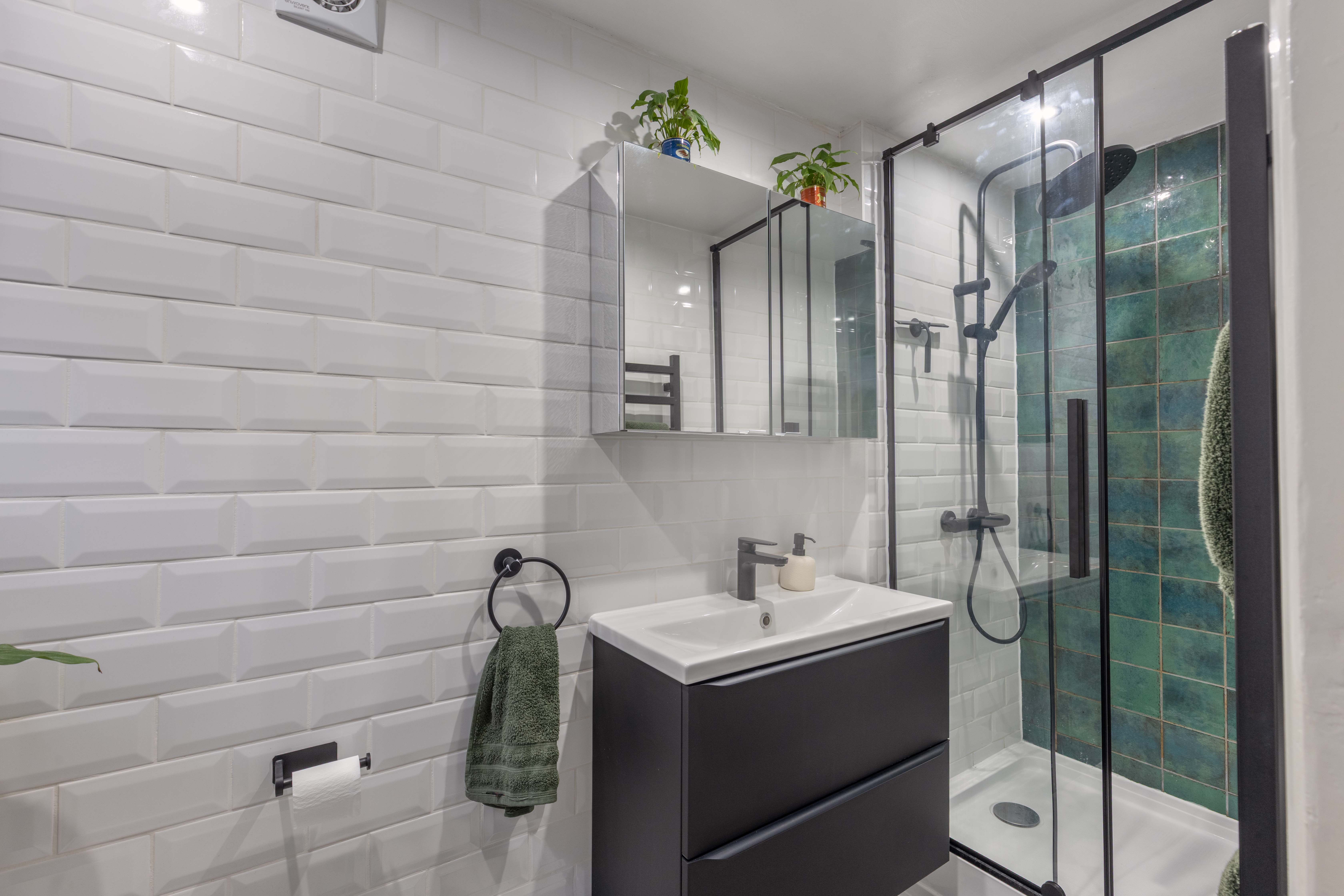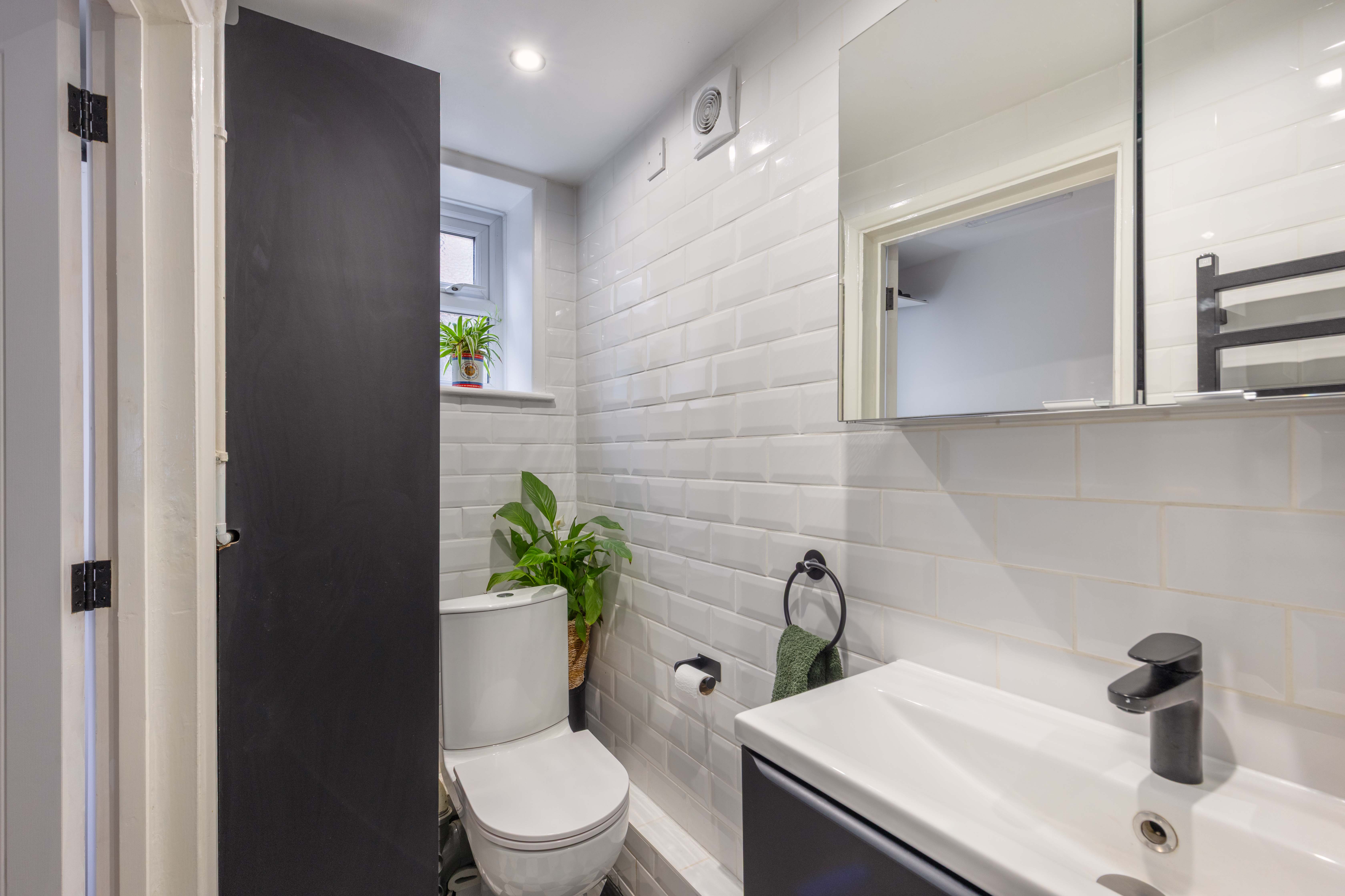 To the left, the contemporary bathroom has been finished to a high standard, featuring modern white tiling complemented by striking black metal fittings, and benefitting from a large walk-in shower, washbasin, and WC.