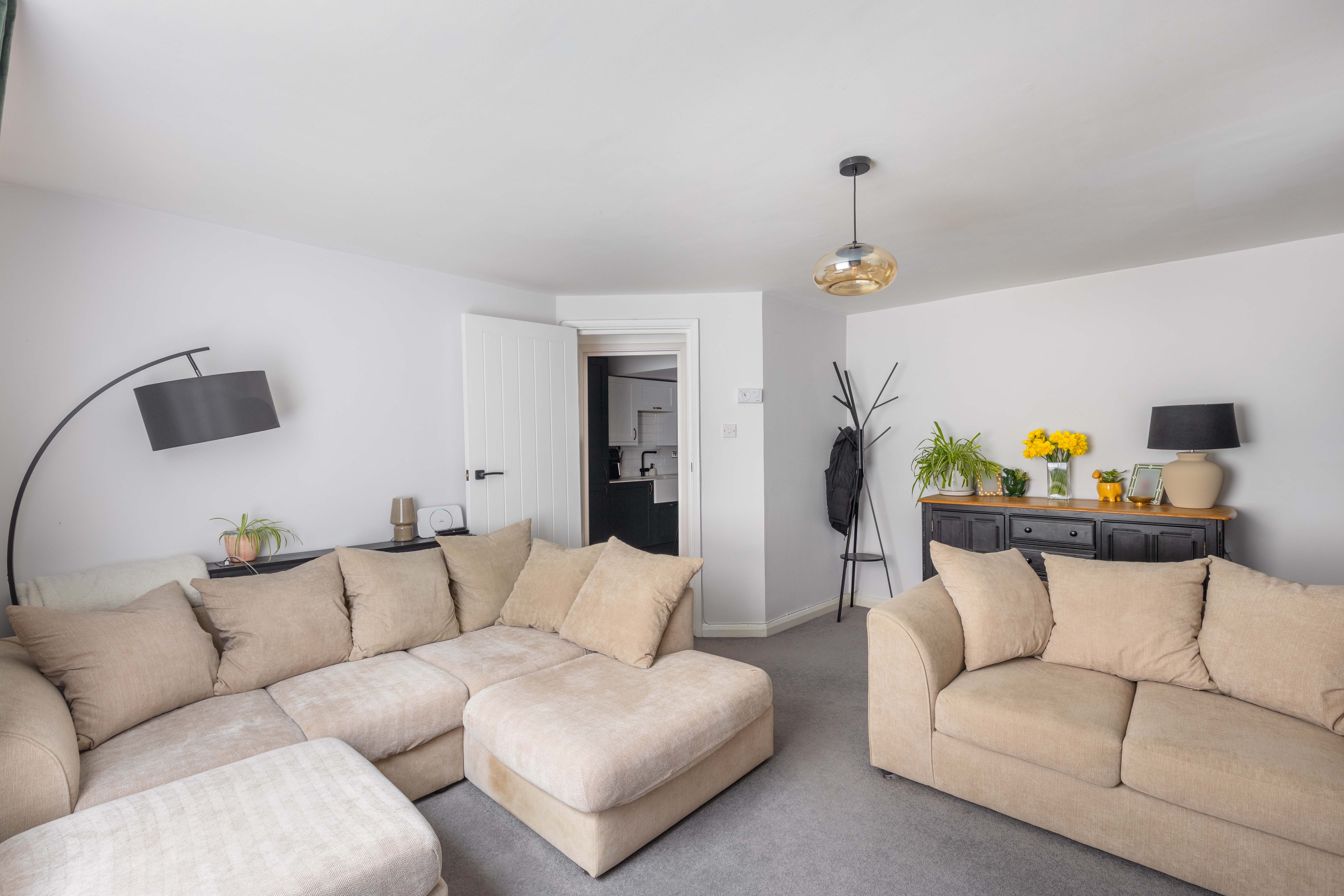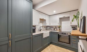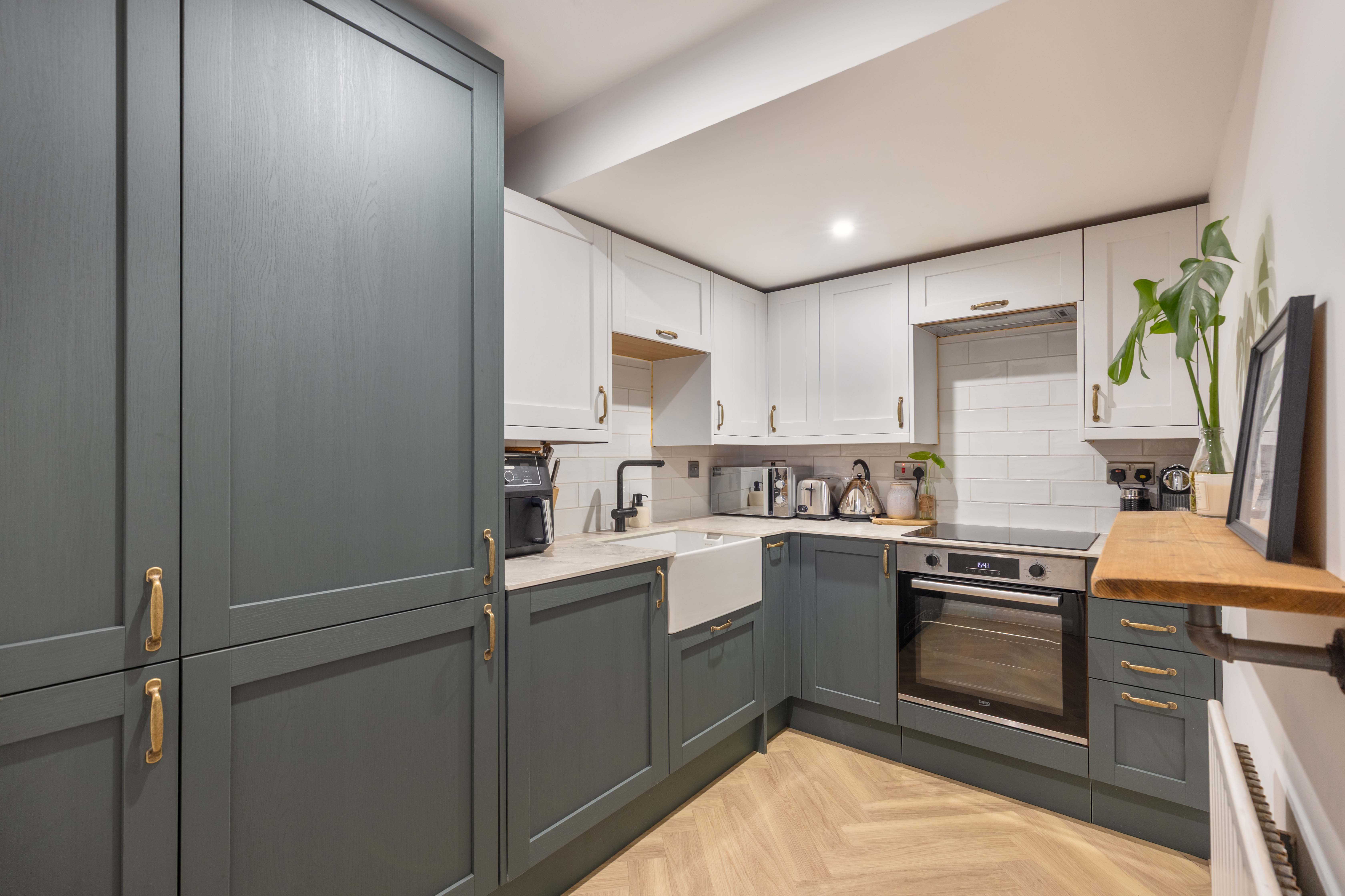 Further along, the kitchen has been thoughtfully designed to maximise both space, with bespoke cabinetry, durable composite worktops, a classic butler sink, and integrated appliances—all seamlessly brought together in a stylish and practical layout.