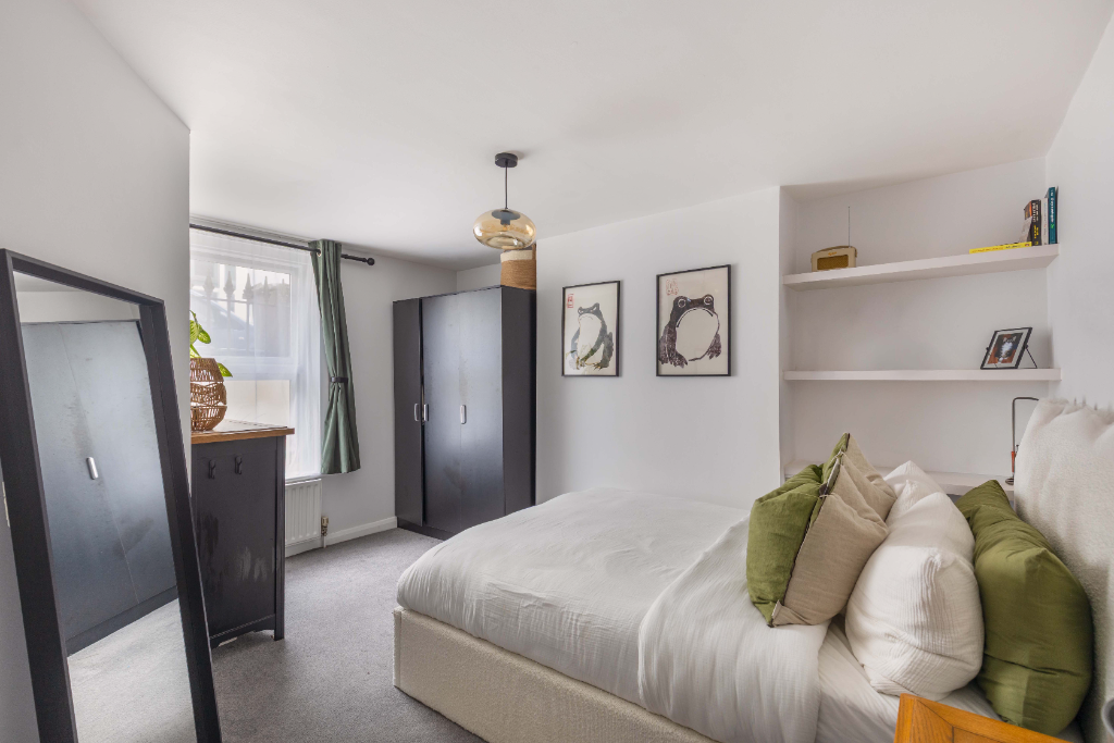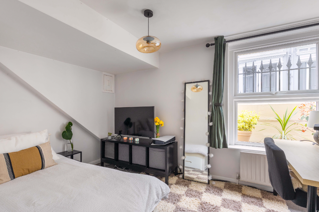 At the far end of the apartment are the two bedrooms, both benefiting from natural light via a charming lightwell. The principal bedroom is spacious and tranquil, while the second bedroom offers versatility—ideal as a guest room, nursery, or home office.