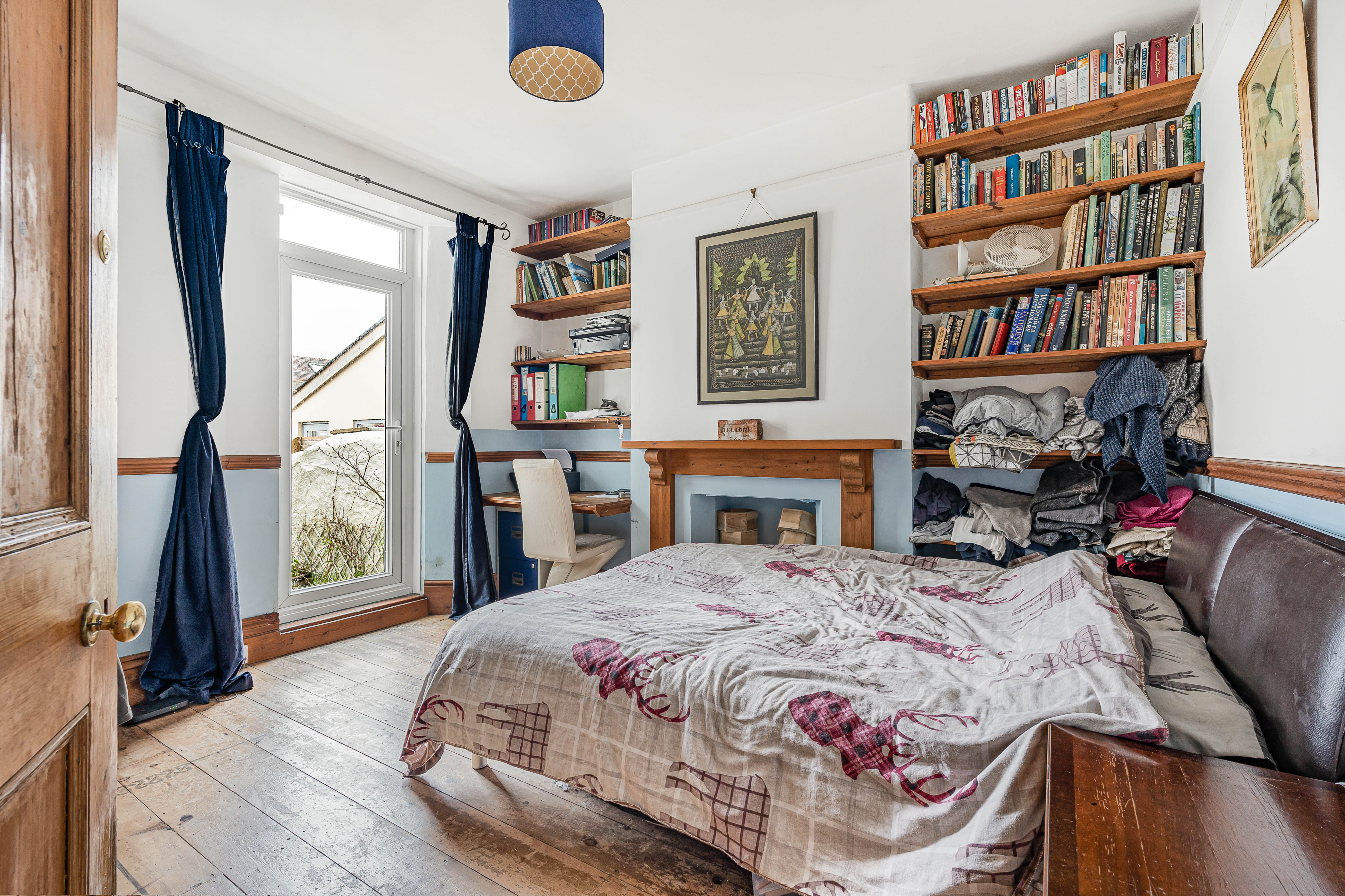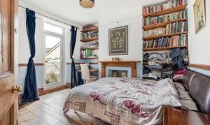 DINING ROOM/BEDROOM FIVE: Picture rail. Dado rail. Radiator. Stripped timber flooring. Fireplace recess with timber surround. Replacement uPVC double glazed door with matching panel over, leading onto the rear courtyard-style gardens. Built-in recesses to either side of the chimney breast with timber shelving.