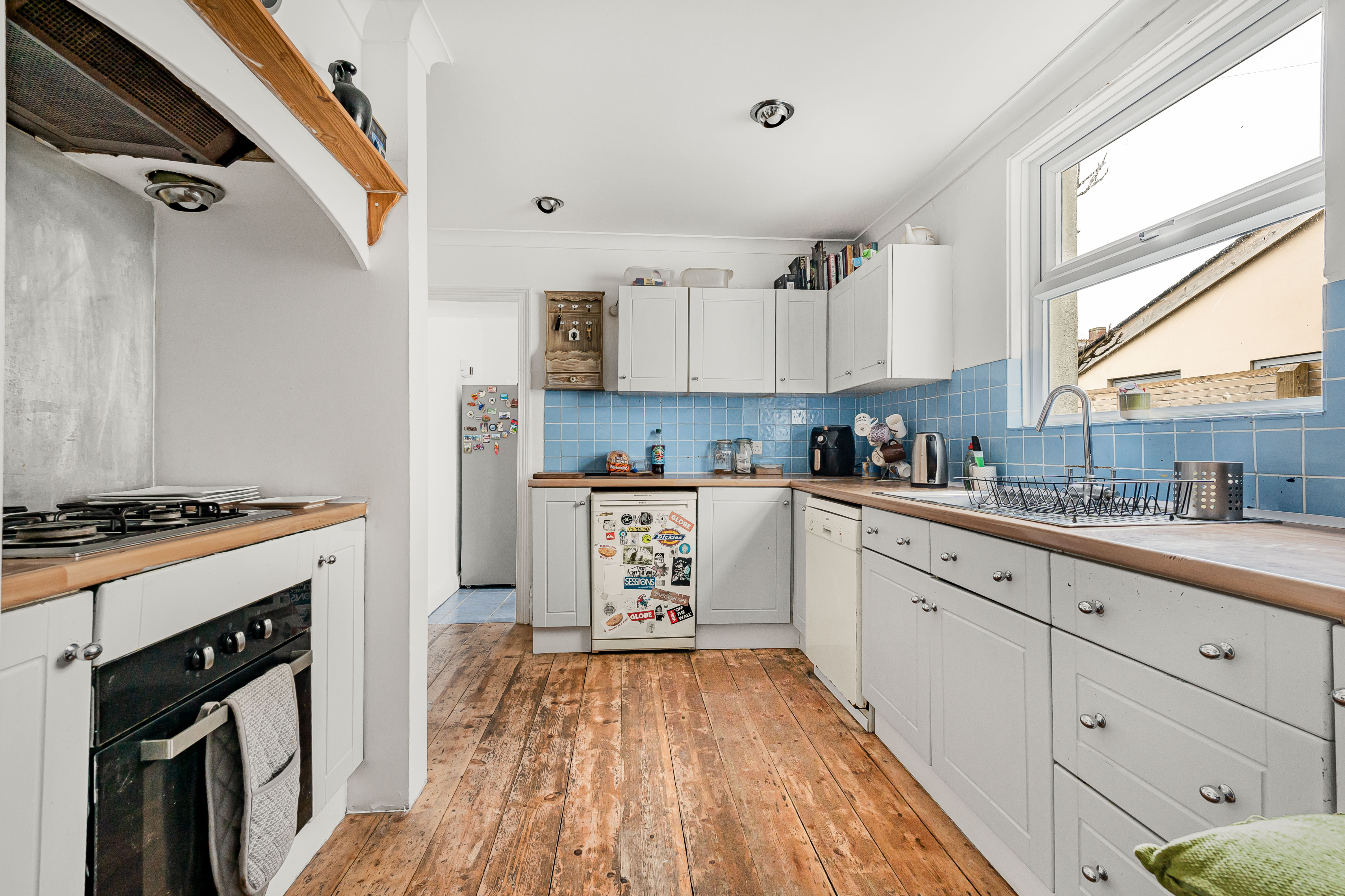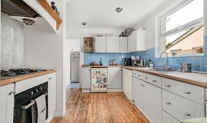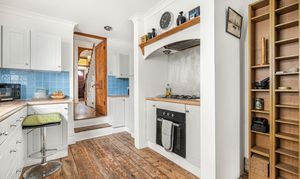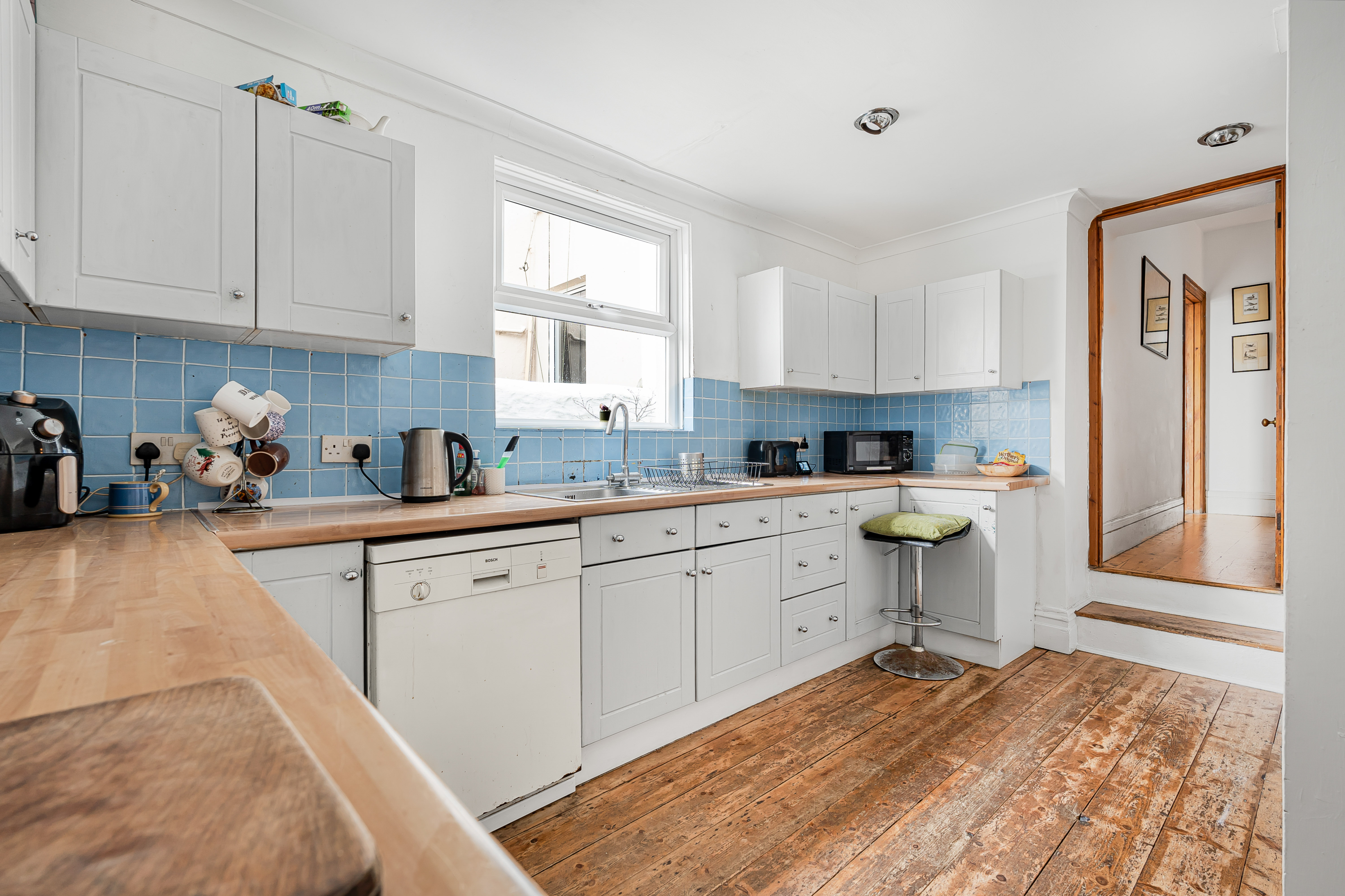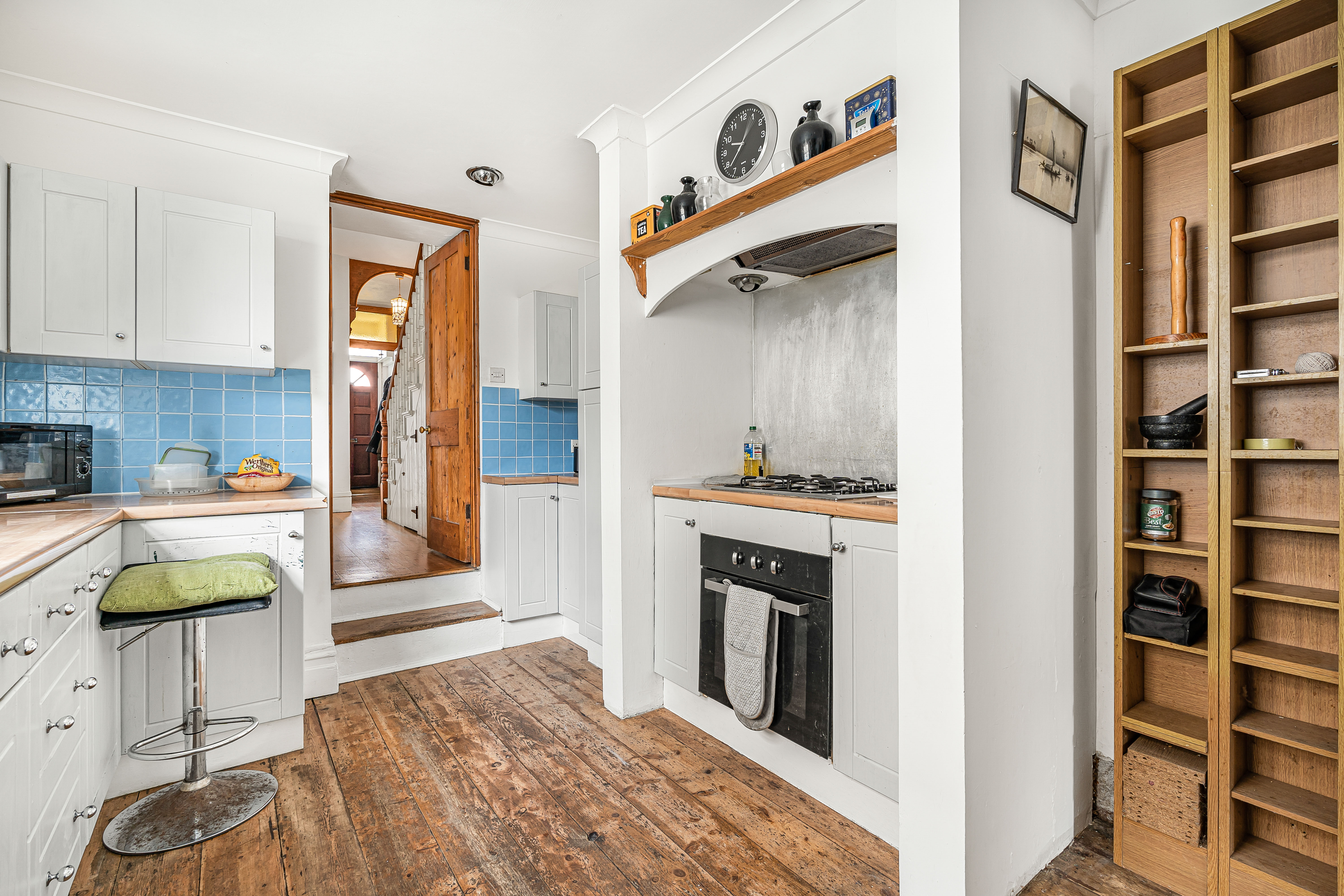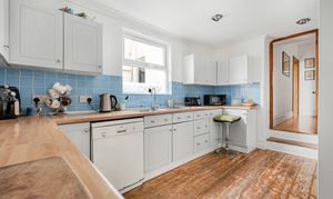 KITCHEN: Roll-top timber block-effect worksurfaces with cupboards and drawers under, matching wall units with tiled splashbacks in between. Inset stainless steel sink and drainer with mixer tap. Recess with inset four-ring gas hob with oven and cupboards under, extractor hood and light over with timber shelf. Space and plumbing for dishwasher and space for fridge. Coved ceiling. Inset ceiling down-lighters. Stripped timber flooring. Replacement uPVC double glazed window to the side elevation. Doorway leading to the:-