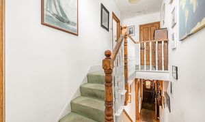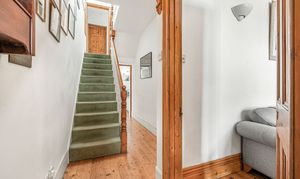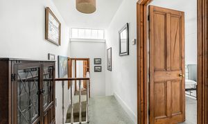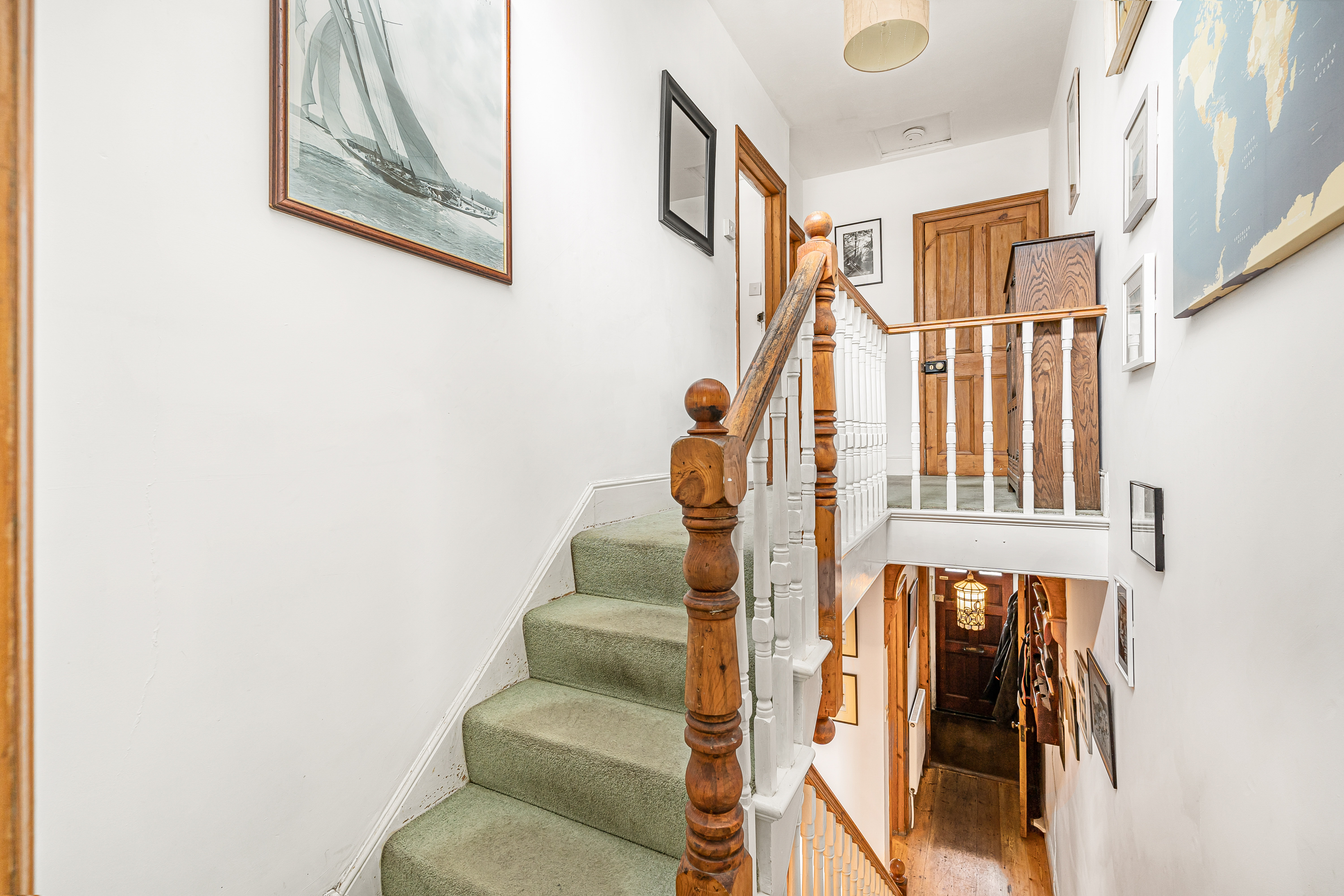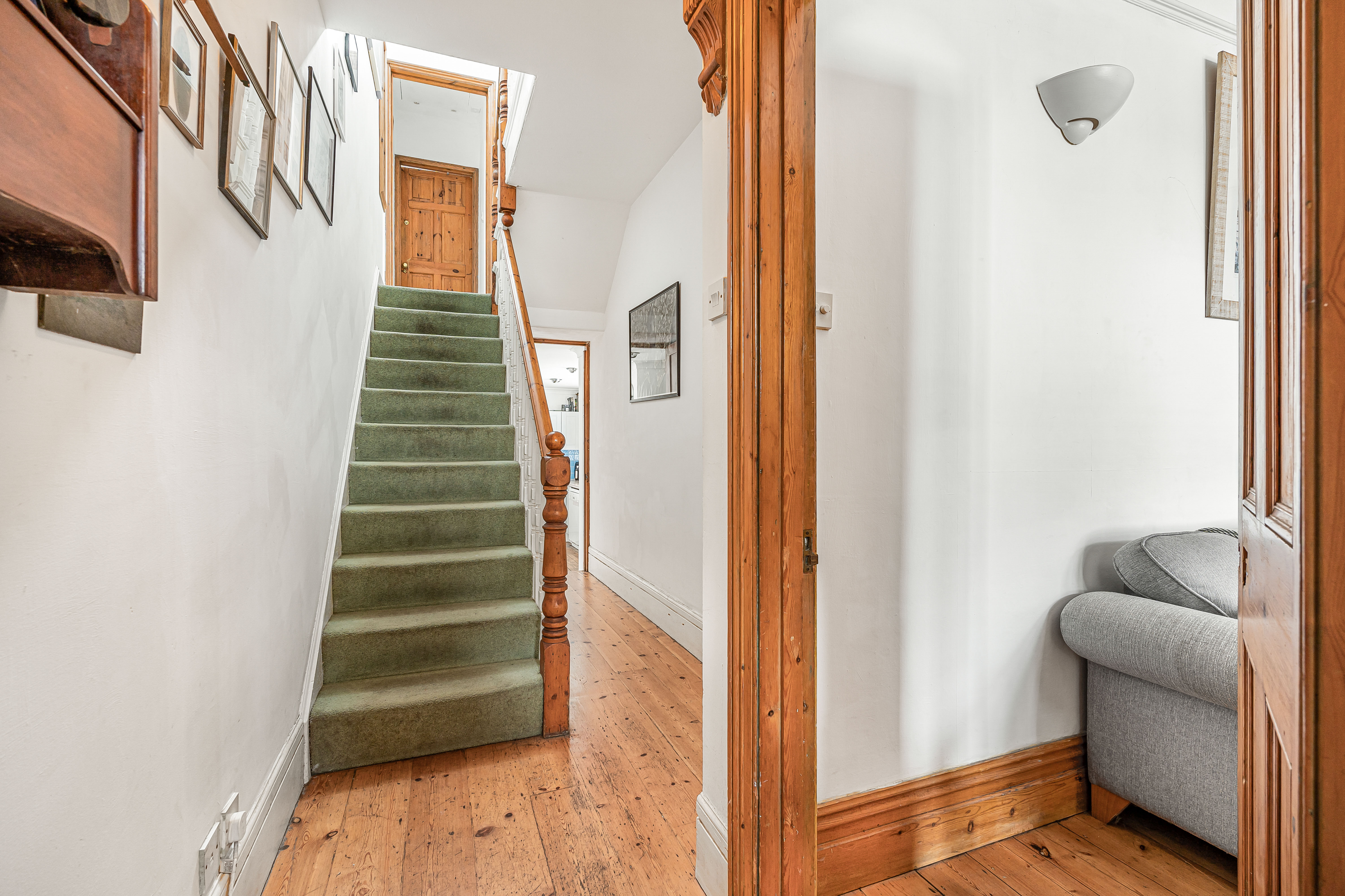 Staircase rising to the first floor split-level landing. Radiator. Stripped timber flooring. Door to under-stair storage cupboard with light. Panelled doors to kitchen, dining room/bedroom five and:-