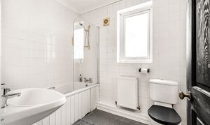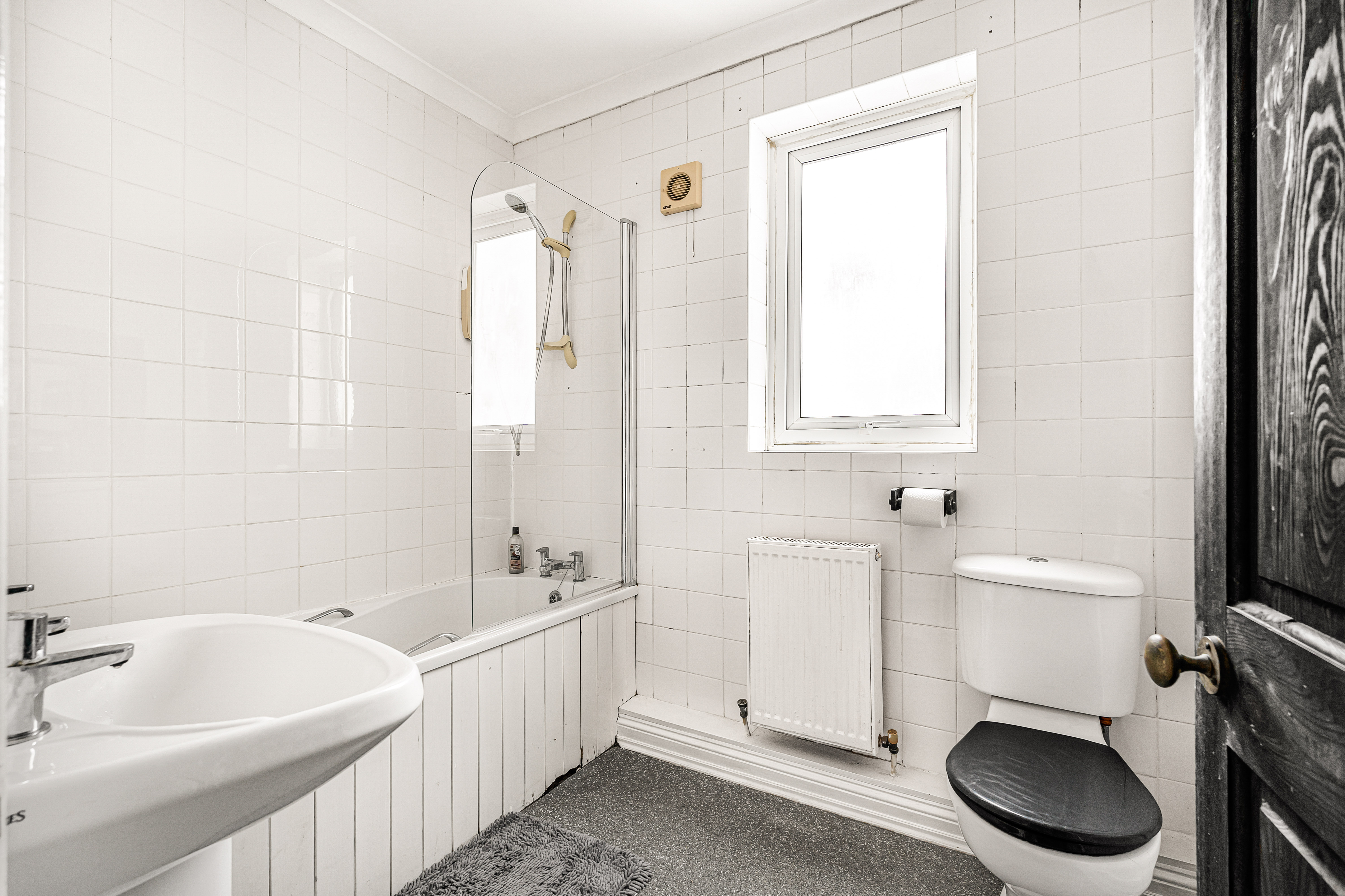 Three-piece suite comprising: low flush WC, pedestal wash hand basin and panelled bath with mixer tap and electric shower over, glazed shower screen. Fully tiled walls. Coved ceiling. Obscure replacement uPVC double glazed window to the side elevation. Recess with open shelf and cupboard under.