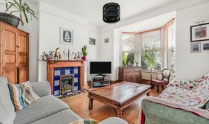 SITTING ROOM: Second measurement taken into the walk-in bay window to the front elevation, with replacement uPVC double glazing. Picture rail. Three wall light points. Timber skirting boards and stripped timber flooring. Gas coal-effect fire with tiled surround, hearth and timber mantel over. Radiator.