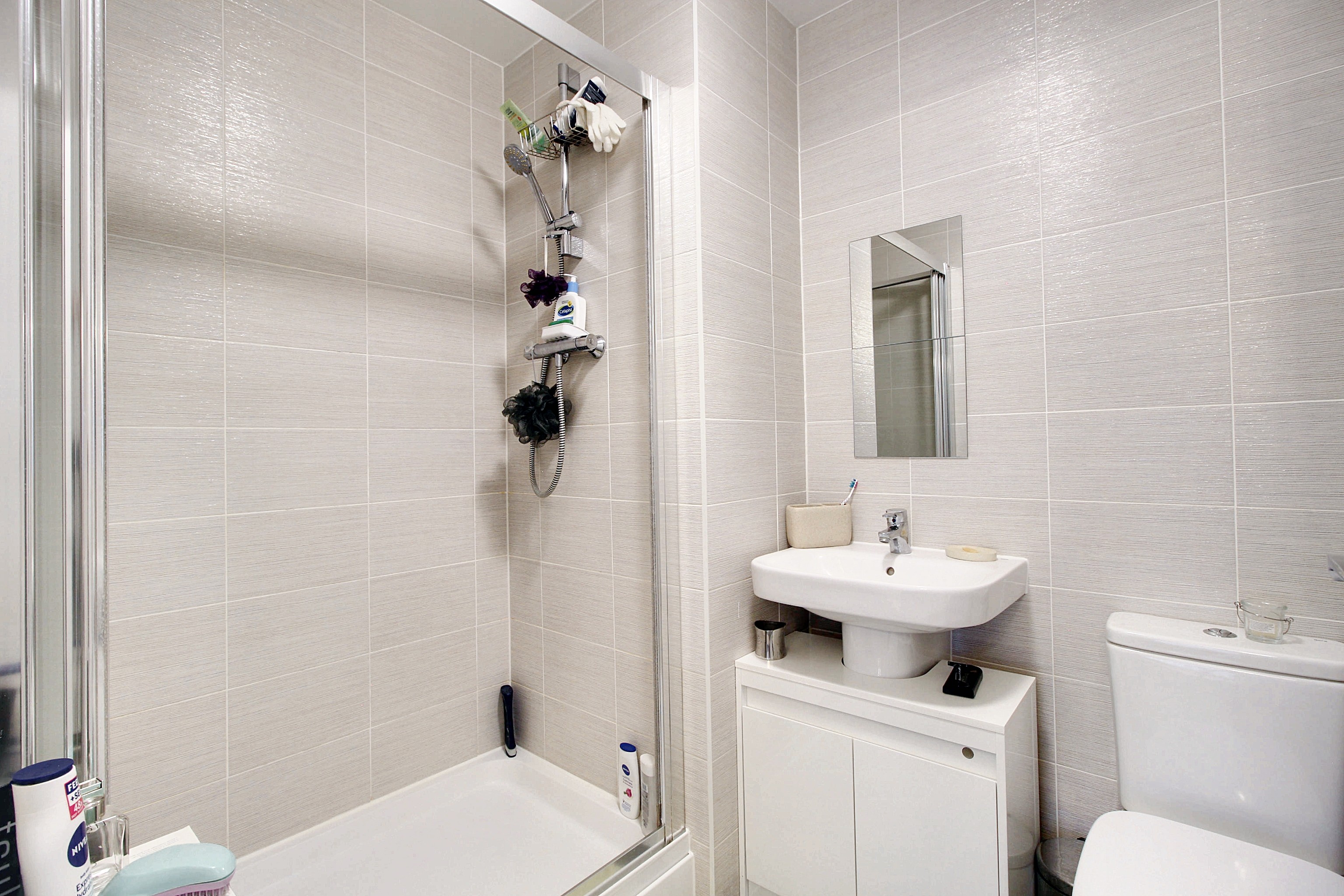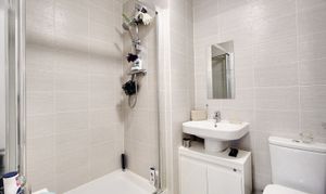 Comprising a rectangular shower enclosure with folding door and thermostatic shower, WC, wash basin, extractor fan, towel radiator, tiled walls and tiled flooring.