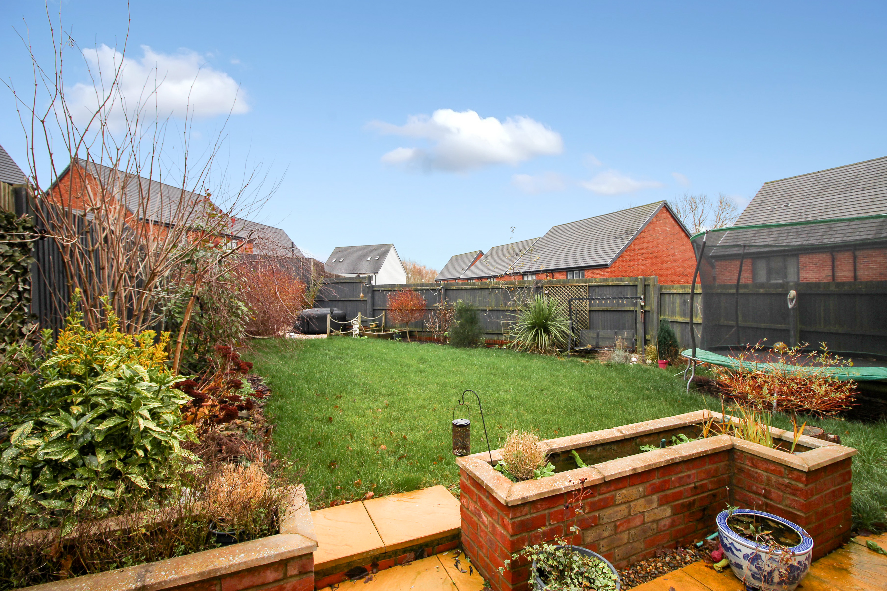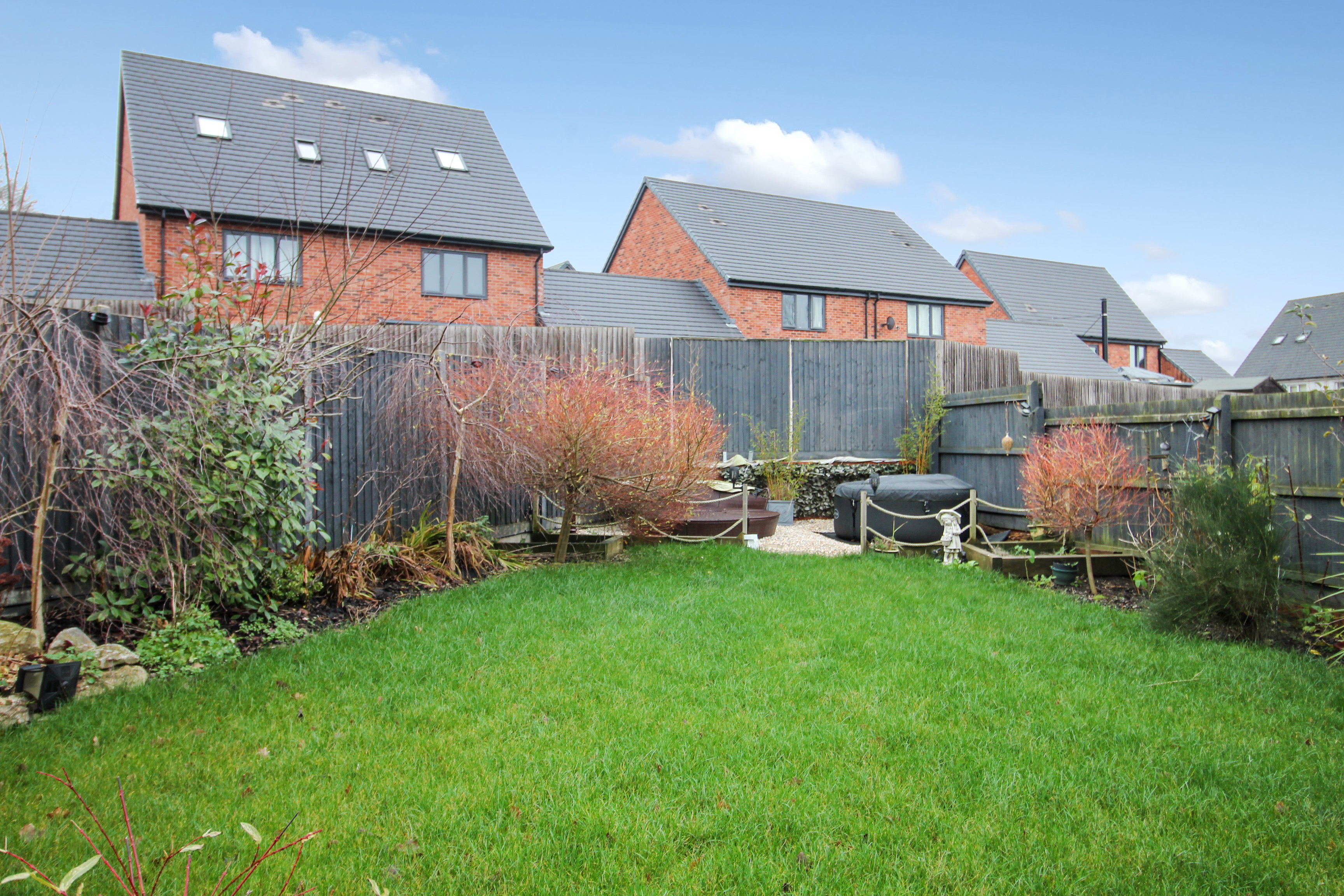 Landscaped garden with fenced boundaries. A patio space sits adjacent to the rear of the house with planted borders. There is a garden shed providing some useful storage and gated side access. To the rear of the garden is another seating area. External power, lights and water.