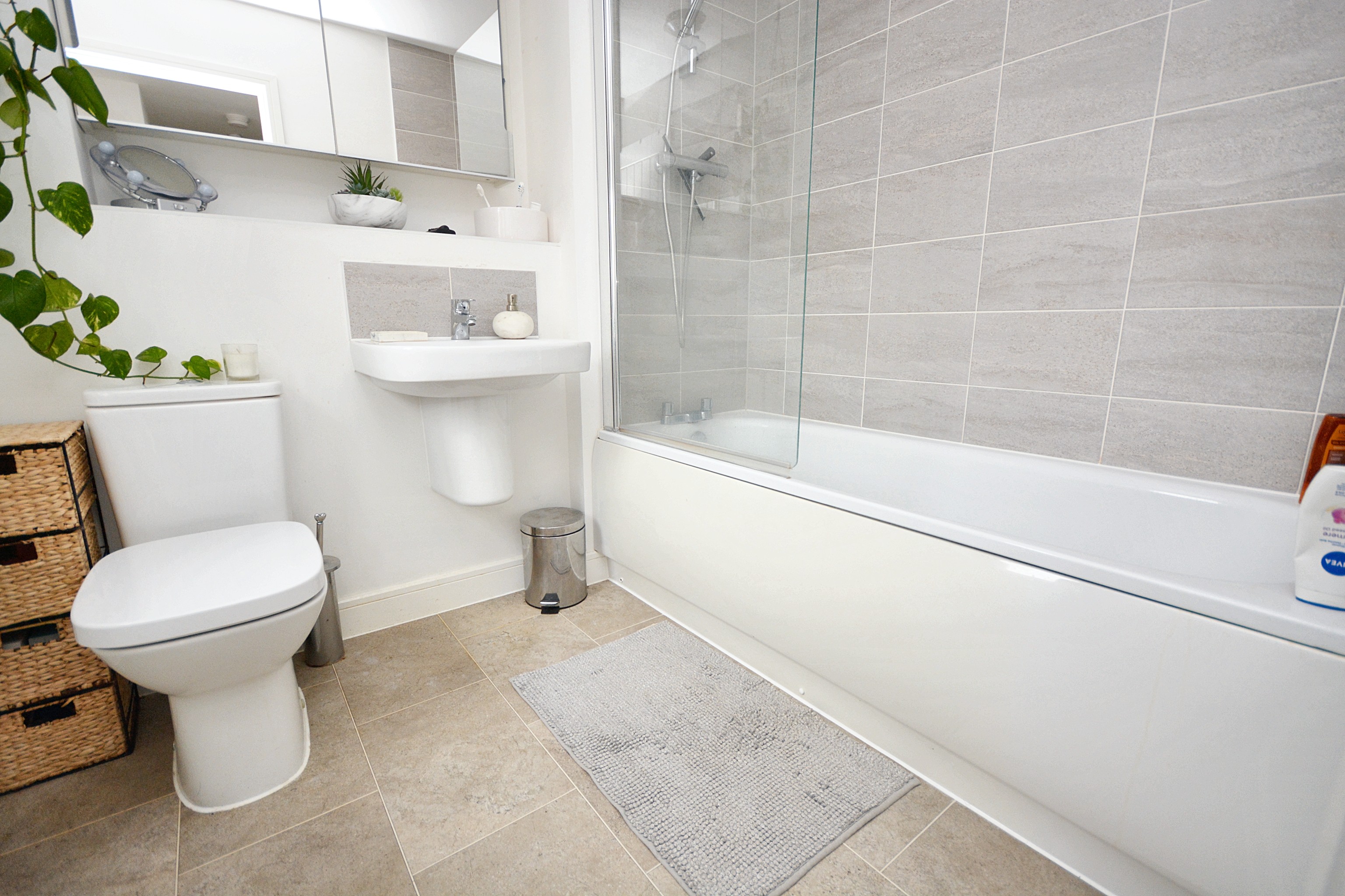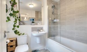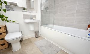 Comprising a bath with mixer tap and thermostatic shower over with glass screen, WC, wash basin, extractor fan, radiator, partly tiled walls and tiled flooring.