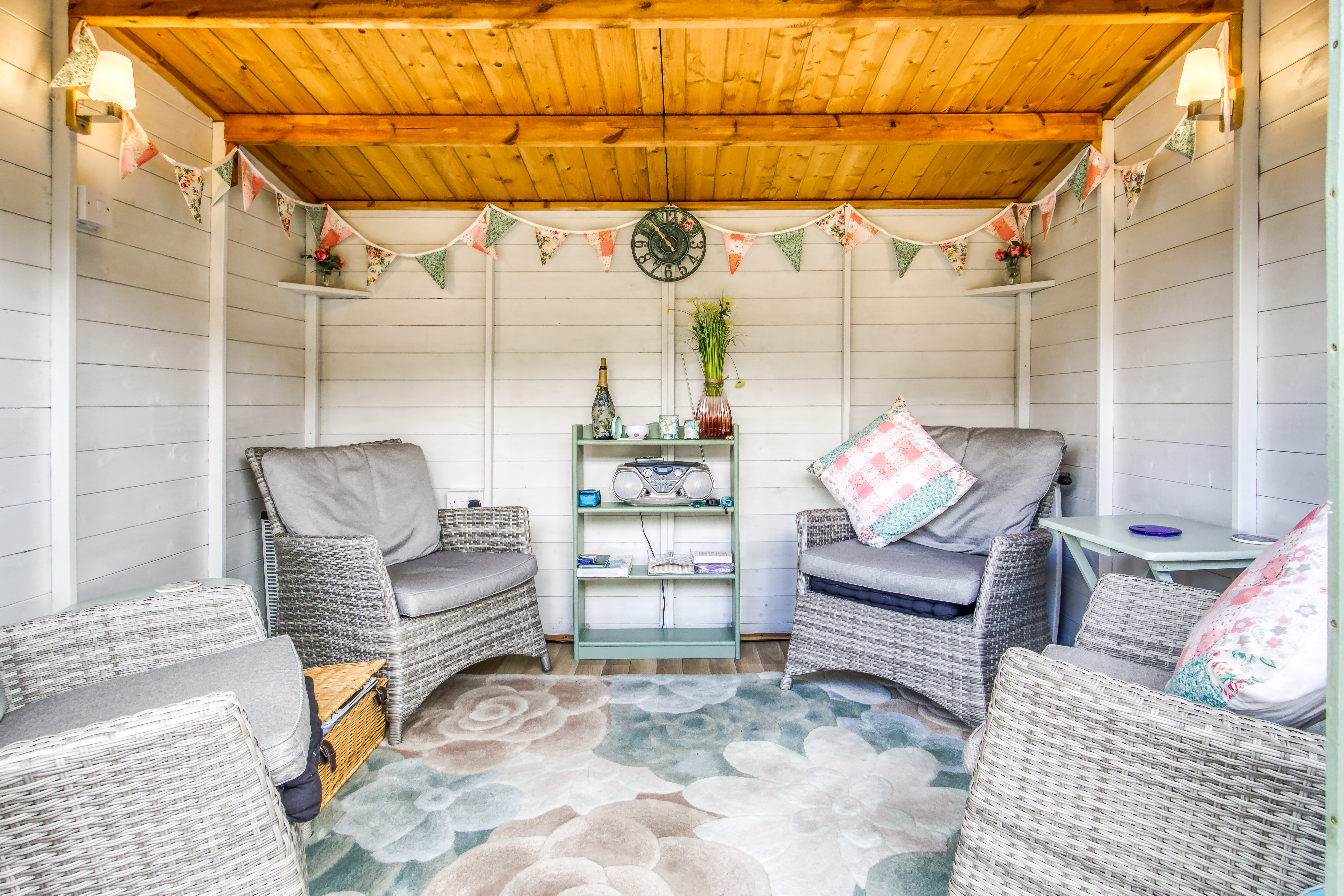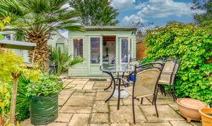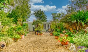 The outside space is equally impressive. The sizeable rear garden features a large sun terrace, exterior lighting, water supply, summer house, and storage shed, all enclosed within well-defined boundaries. To the front, a west-facing patio offers the perfect spot for evening sun, while the lower garden provides off-road parking for up to three vehicles, with convenient side access linking both areas.