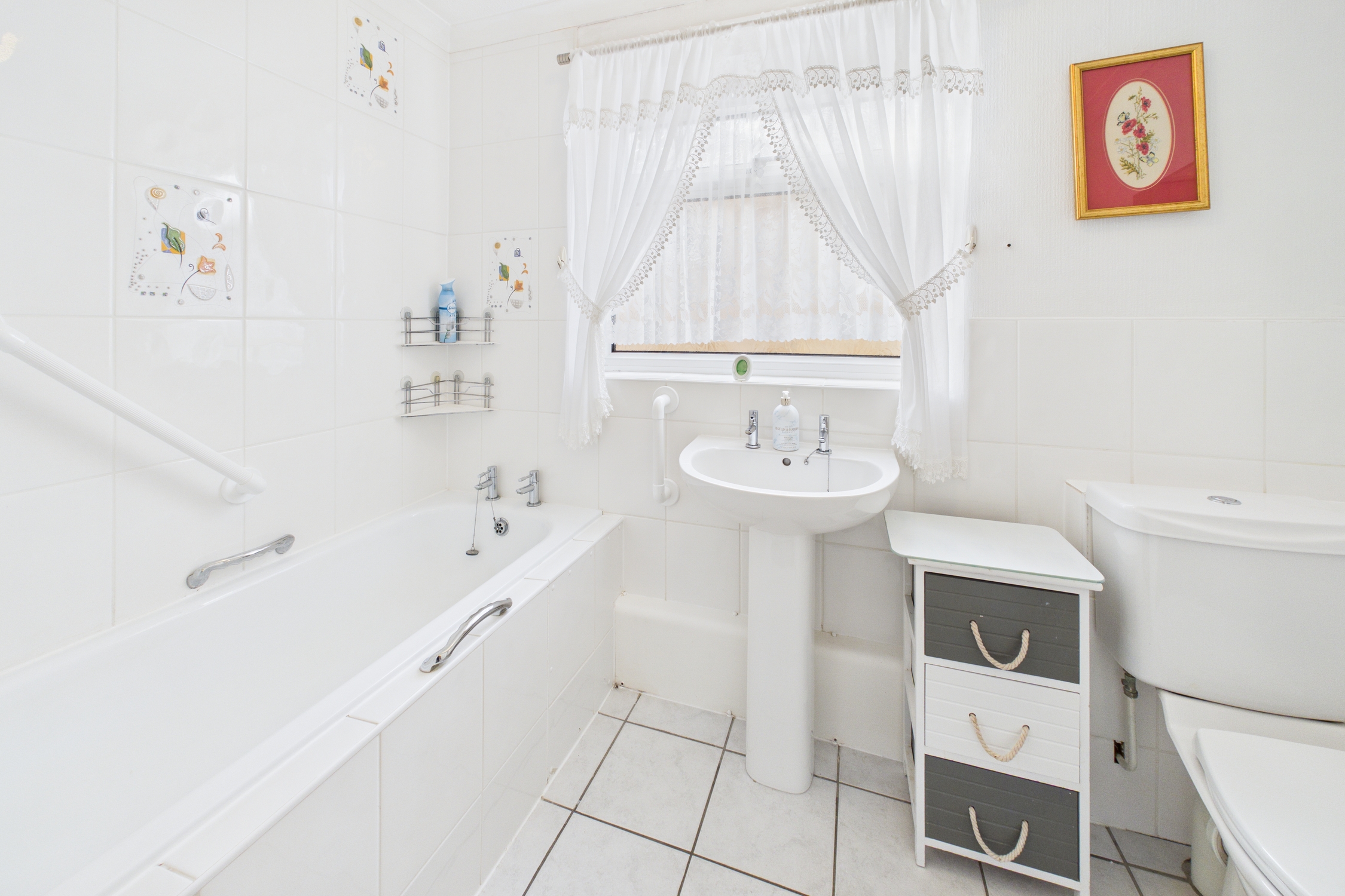 White bathroom suite with low level wc, pedestal wash hand basin and panel enclosed bath with separate shower unit over, glazed shower screen, part tiled walls and tiled flooring, double glazed window to side.