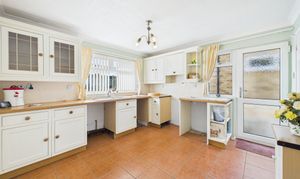 Dual aspect kitchen with double glazed windows to the front and side with glazed access door leading to the driveway, fitted with a range of base and wall mounted units glazed display cupboard and corner display units, roll edge work surface with inset single drainer sink unit and mixer tap, tiled splash backs, space for electric cooker with extractor hood over, space for under counter fridge and plumbing for washing machine, built in storage cupboard, tiled flooring, door to;