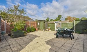 The rear garden mainly paved for low maintenance, timber shed, flower and shrub beds.