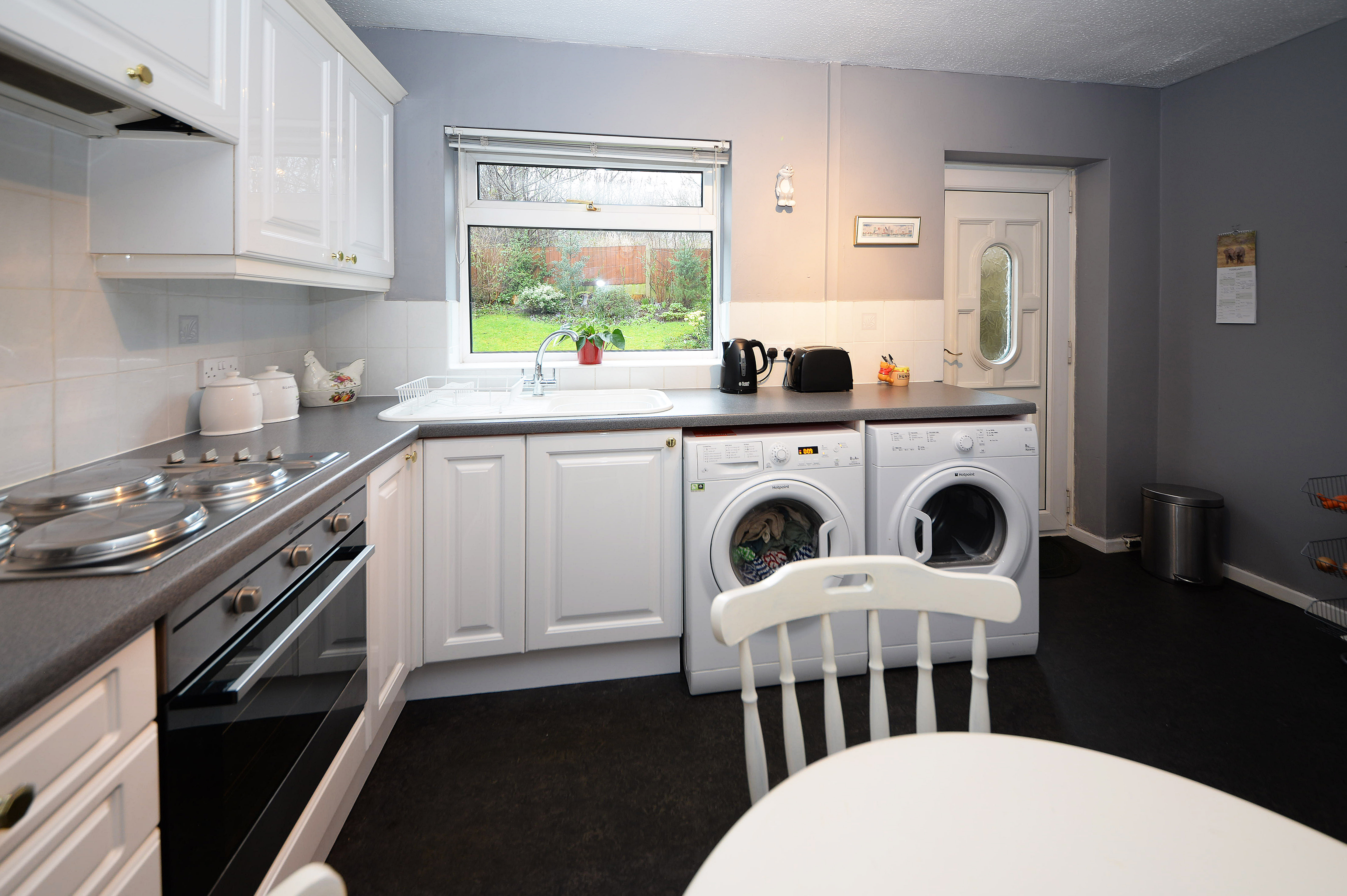 uPVC double glazed window and door to rear aspect, high and low level units with matching roll top work surfaces, integrated 4 ring electric hob with integrated extractor over, integrated oven grill, space and plumbing for washing machine, dryer and fridge freezer, integrated sink with drainer and mixer taps over, tiled splashbacks, electric points and radiator