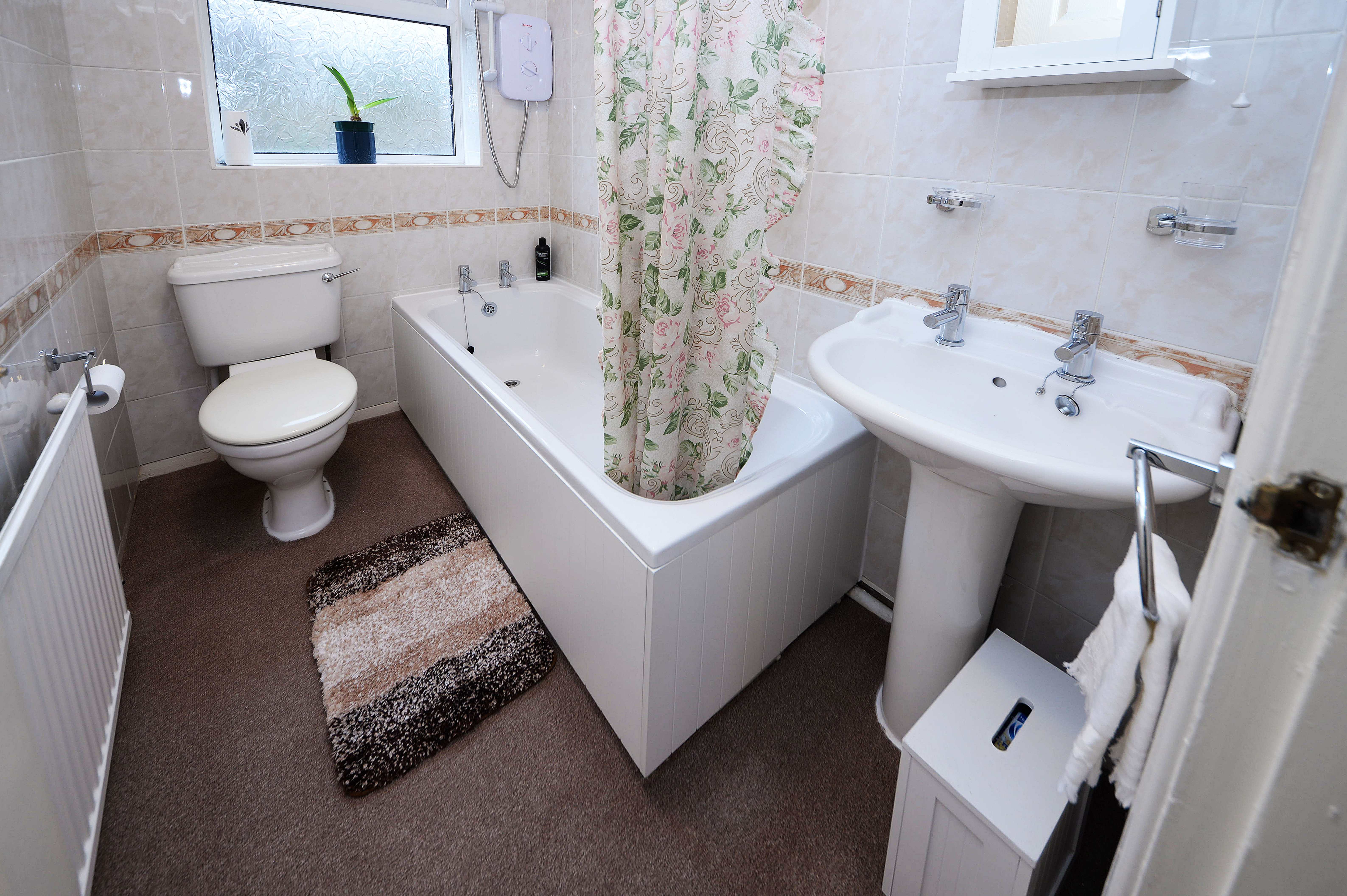 Obscure uPVC double glazed window to rear aspect, fully tiled bathroom, low level WC, panelled bath with electric shower over, wall mounted pedestal hand wash basin with taps over, radiator