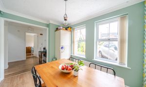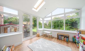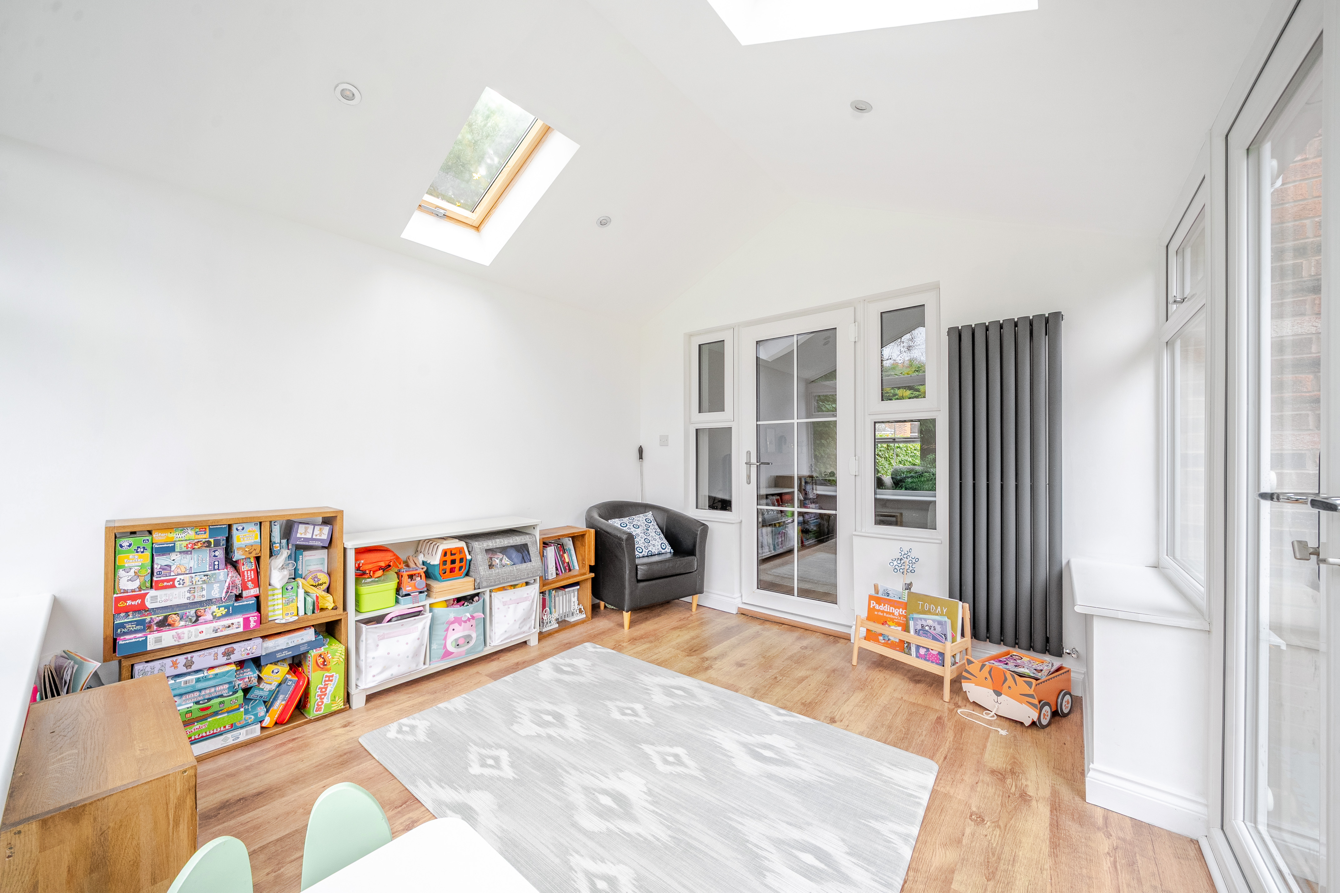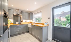 Fronted by an attractive garden with side driveway large enough for multiple vehicles in front of the detached single garage, the accommodation opens to the reception hall with guest w/c. To the front elevation there is a formal dining room which adjoins the stylish modern fitted kitchen with integrated appliances, solid wooden work surfaces and door leading out to the rear garden. The spacious sitting room is arranged around a feature fireplace and extends into the recently added garden room which adds a flexible dimension to the living space for use as a children's playroom or second sitting room. Double doors open out to the fully enclosed rear garden with new decked patio area stepping down to lawn with established planting to the boundaries. To the first floor the central landing branches to stylish house bathroom boasting contemporary furniture including over bath shower, and three well-proportioned bedrooms with the largest having a dressing area and en-suite shower room.