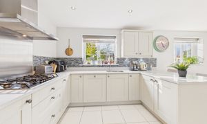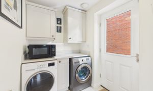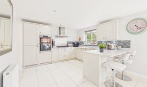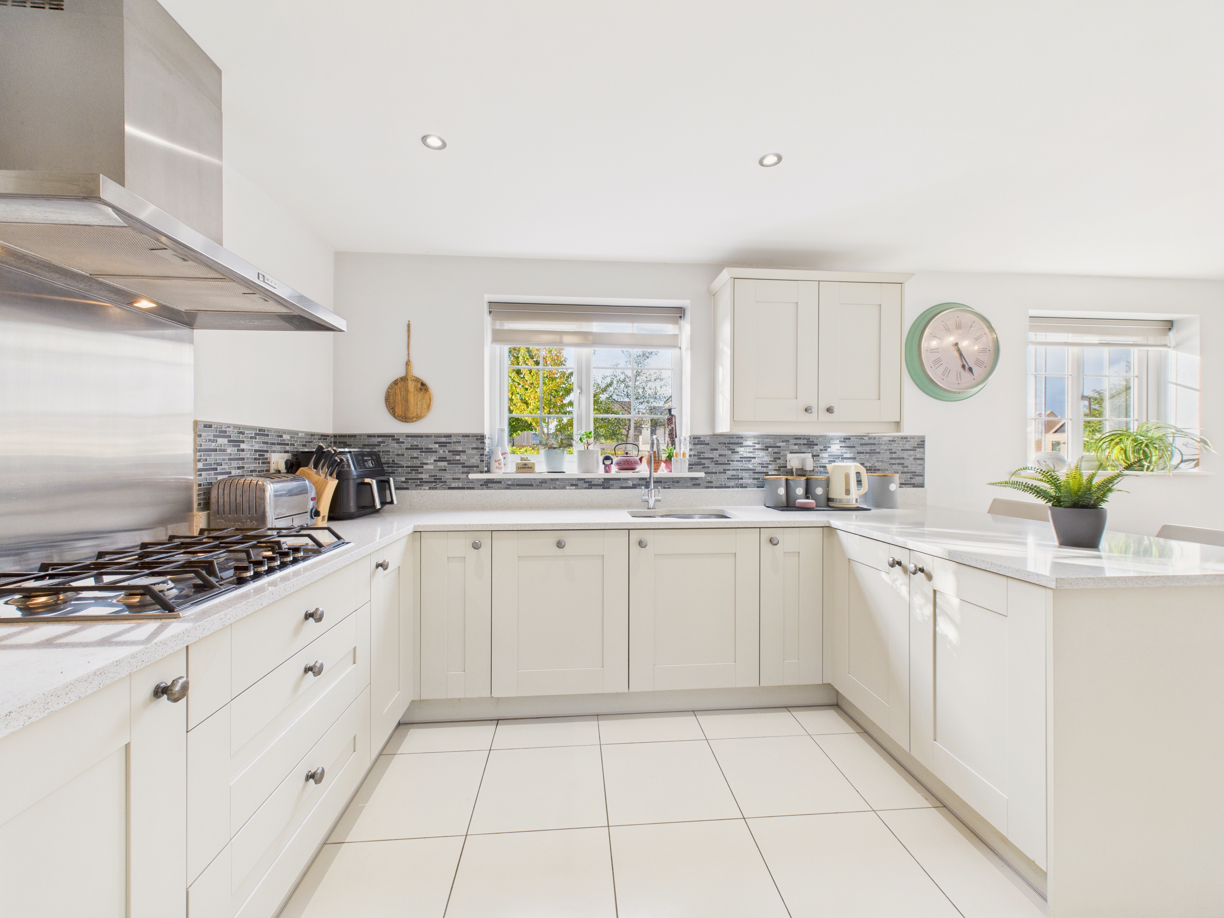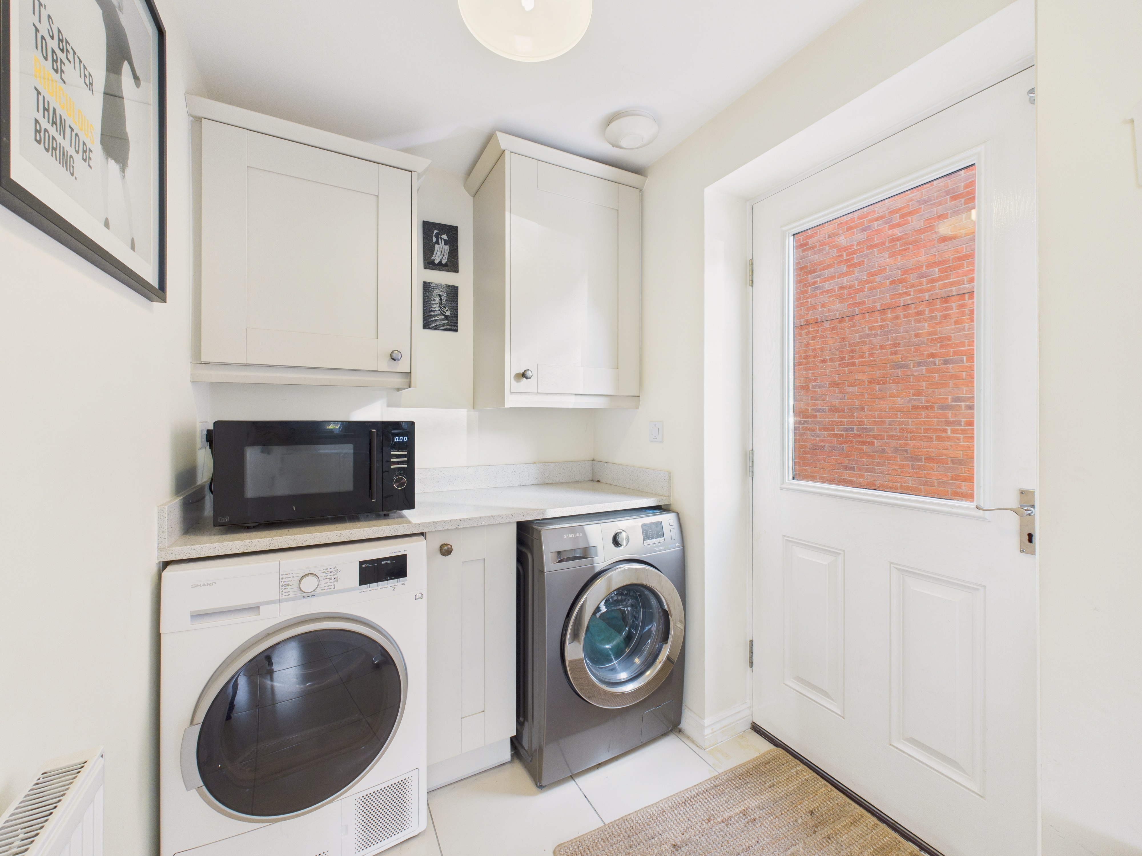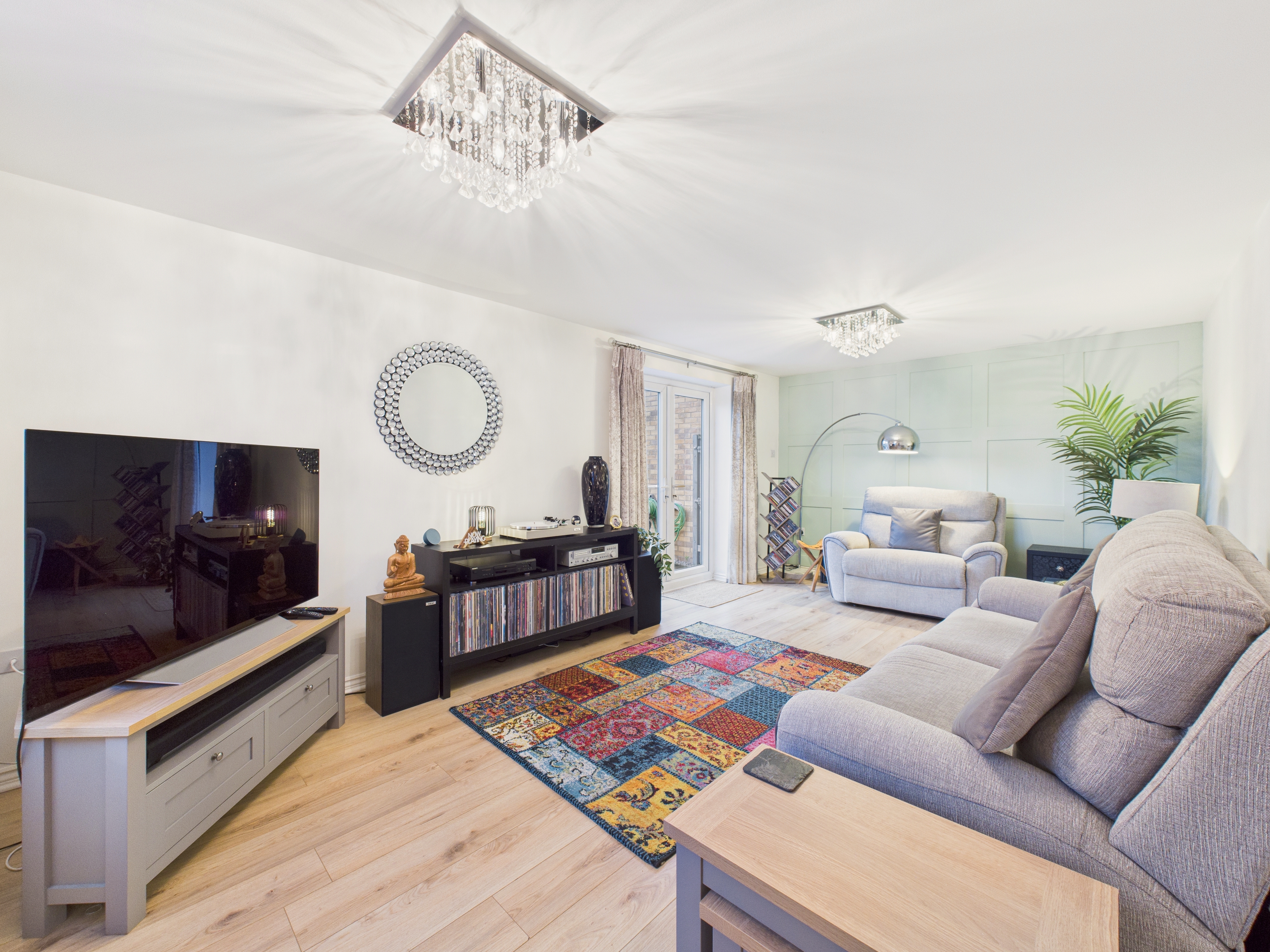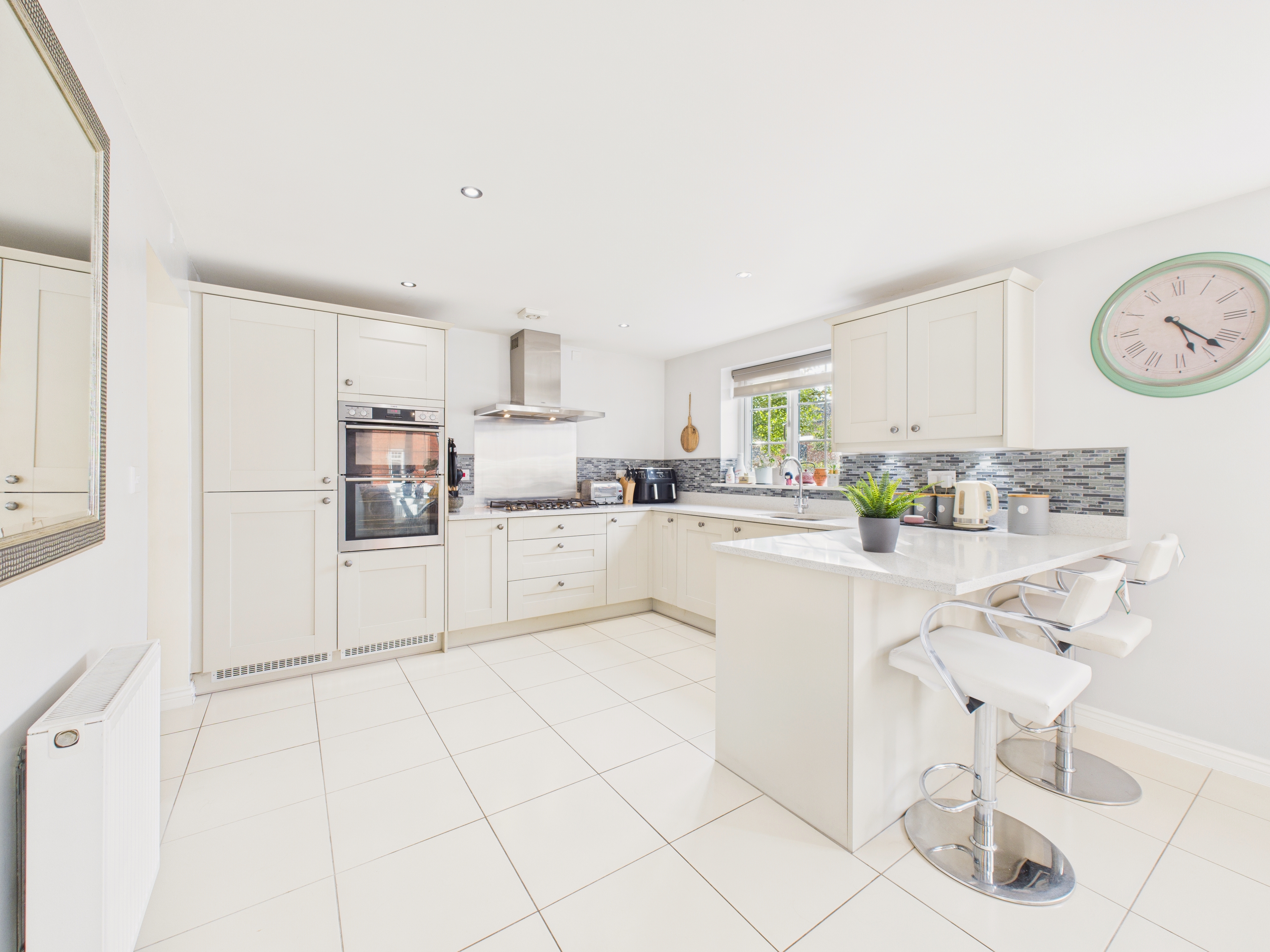 On the ground floor, a welcoming entrance hall with upgraded tiling gives access to a useful under-stairs storage cupboard and a downstairs WC, also finished with upgraded tiles. The generous living room sits to one side of the home, offering a bright and inviting space ideal for relaxing with family or entertaining guests with French doors leading out into the garden, extending the living area further. To the other side, the contemporary kitchen and dining area forms the stylish heart of the property. Fitted with sleek quartz worktops, a breakfast bar, an upgraded gas 5-ring AEG hob, AEG double oven, and integrated fridge freezer it combines practicality with modern design. An open-plan utility space flows seamlessly from the kitchen, adding further convenience without compromising the sense of openness.