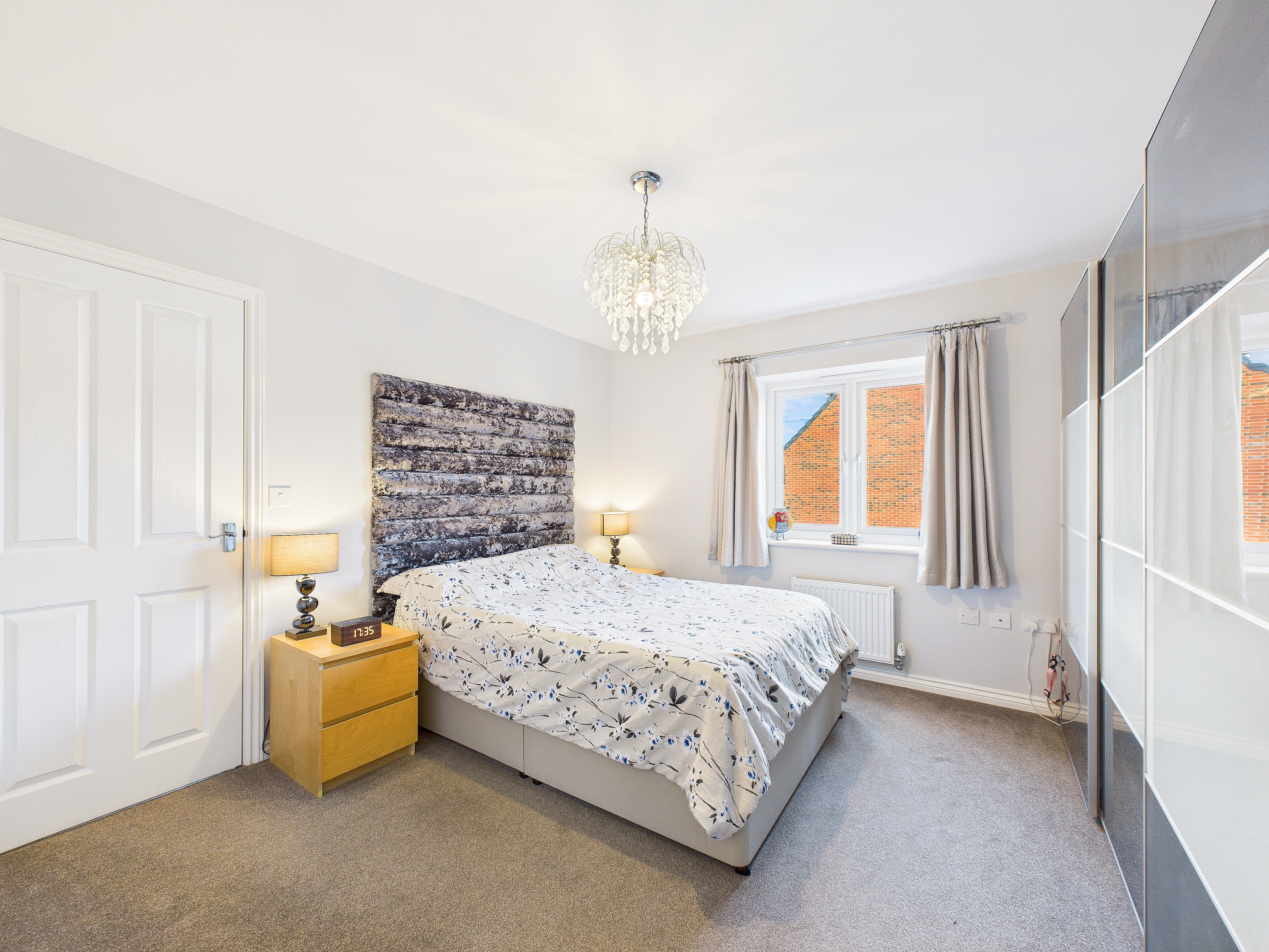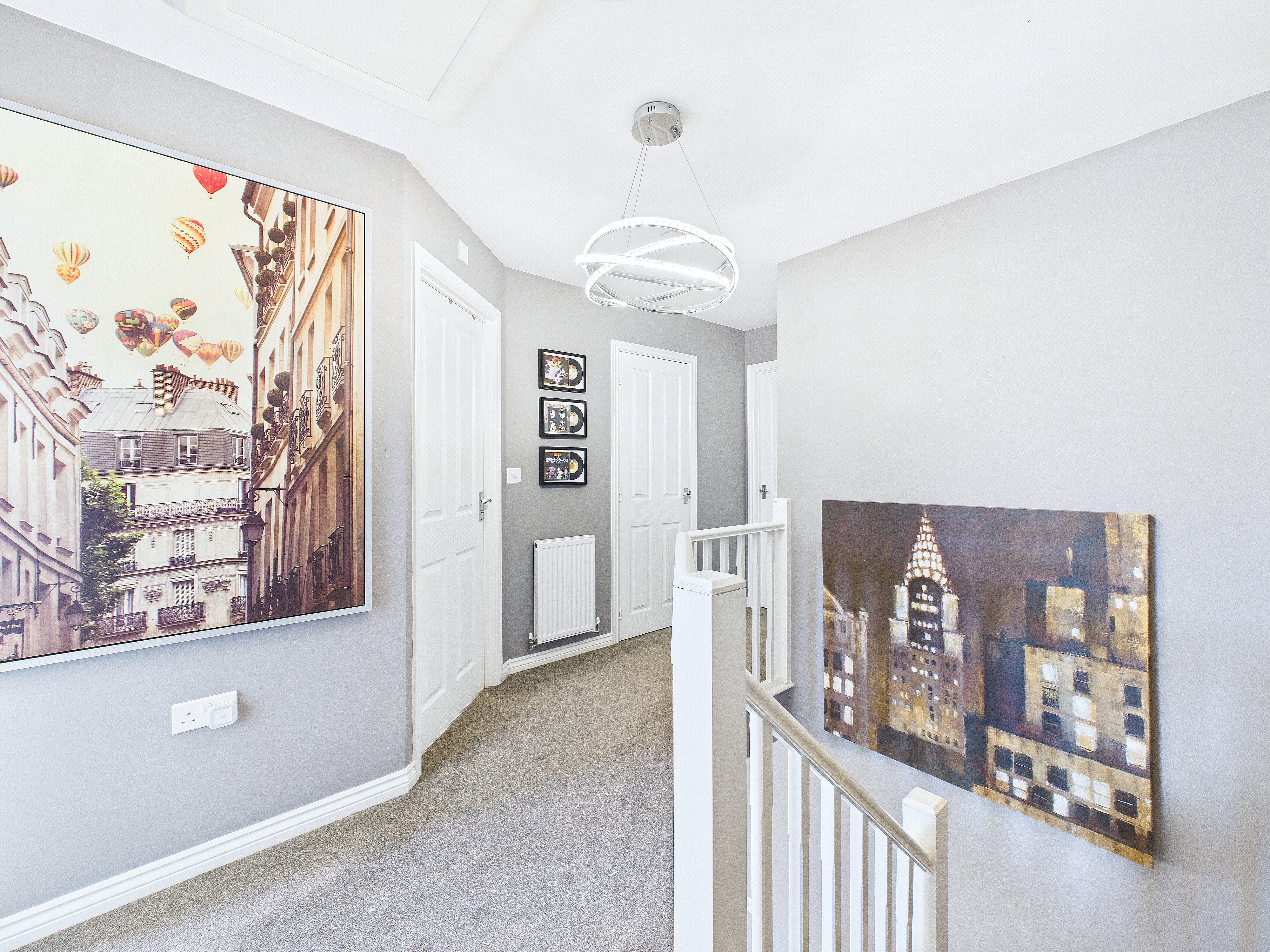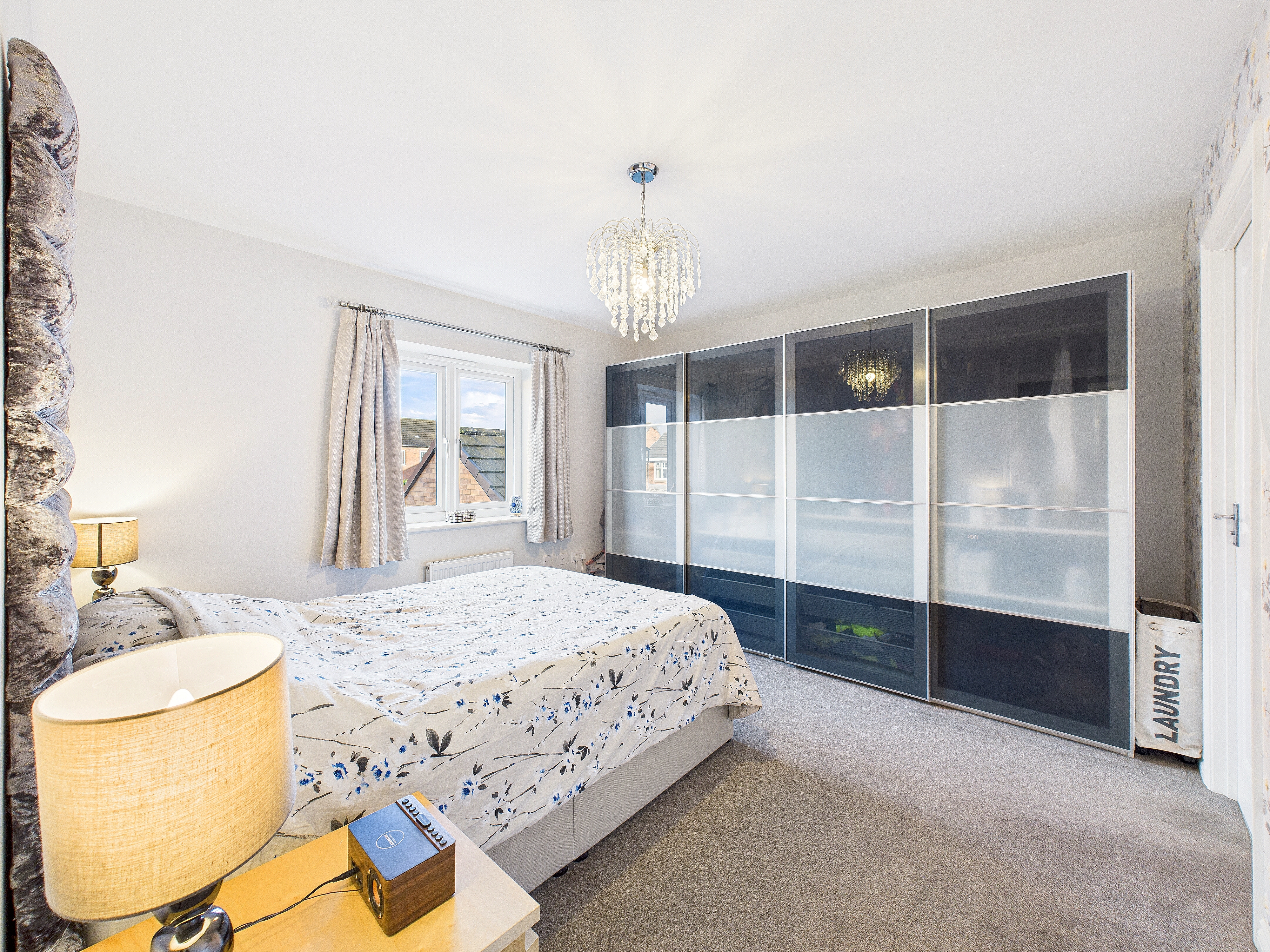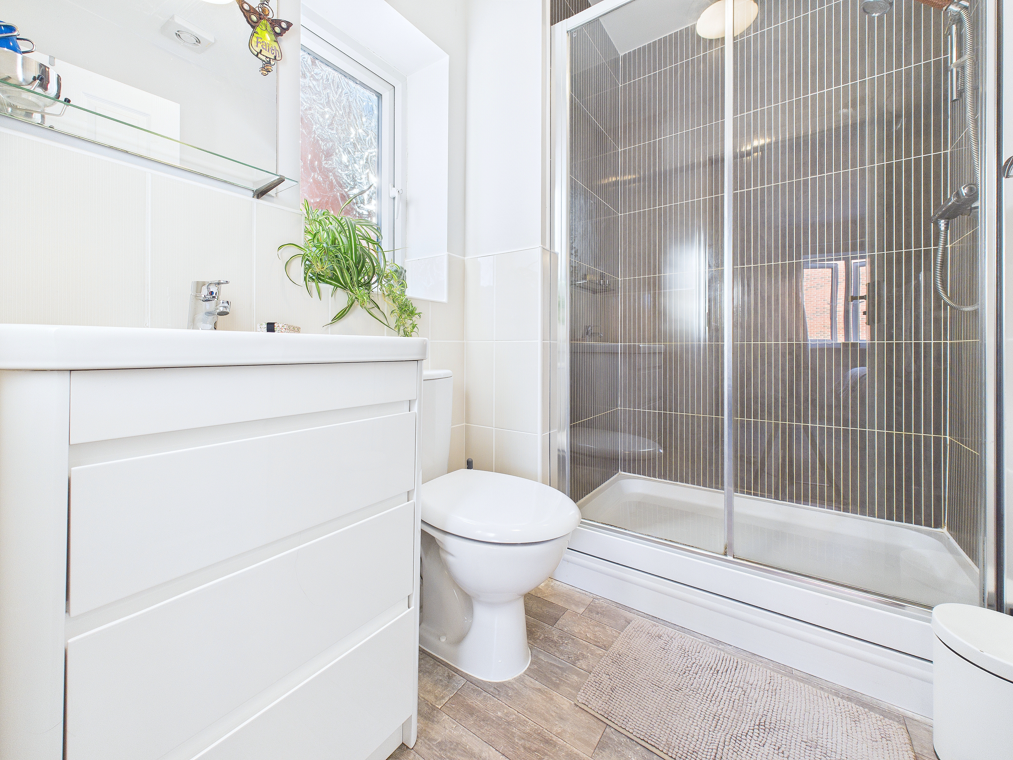 Upstairs, the main bedroom benefits from its own en-suite shower room, enhanced with upgraded tiling, while three further bedrooms provide flexibility for family living, guests, or home working. A modern family bathroom, also finished with upgraded tiles, completes the first floor along with a bright landing space and a useful store cupboard.