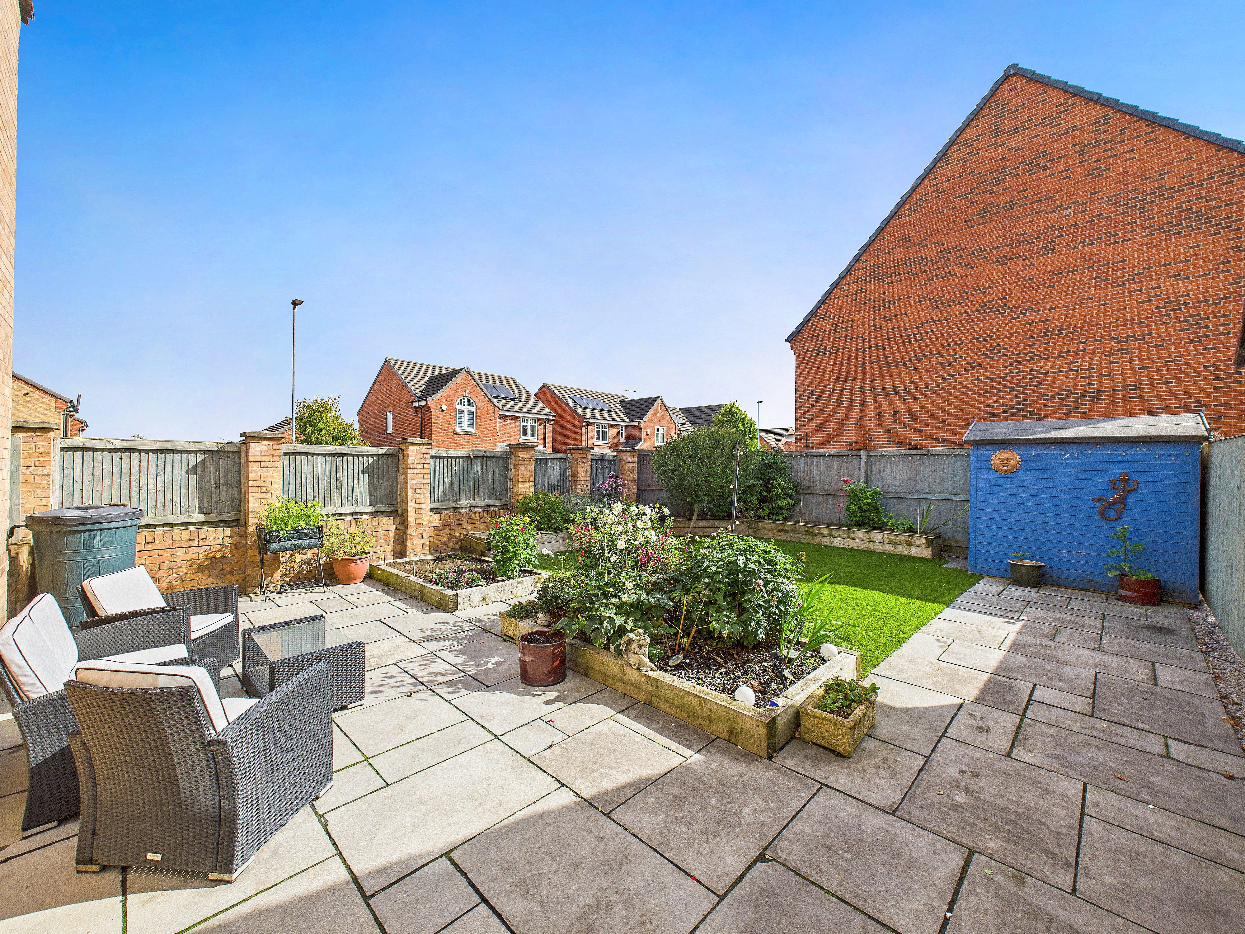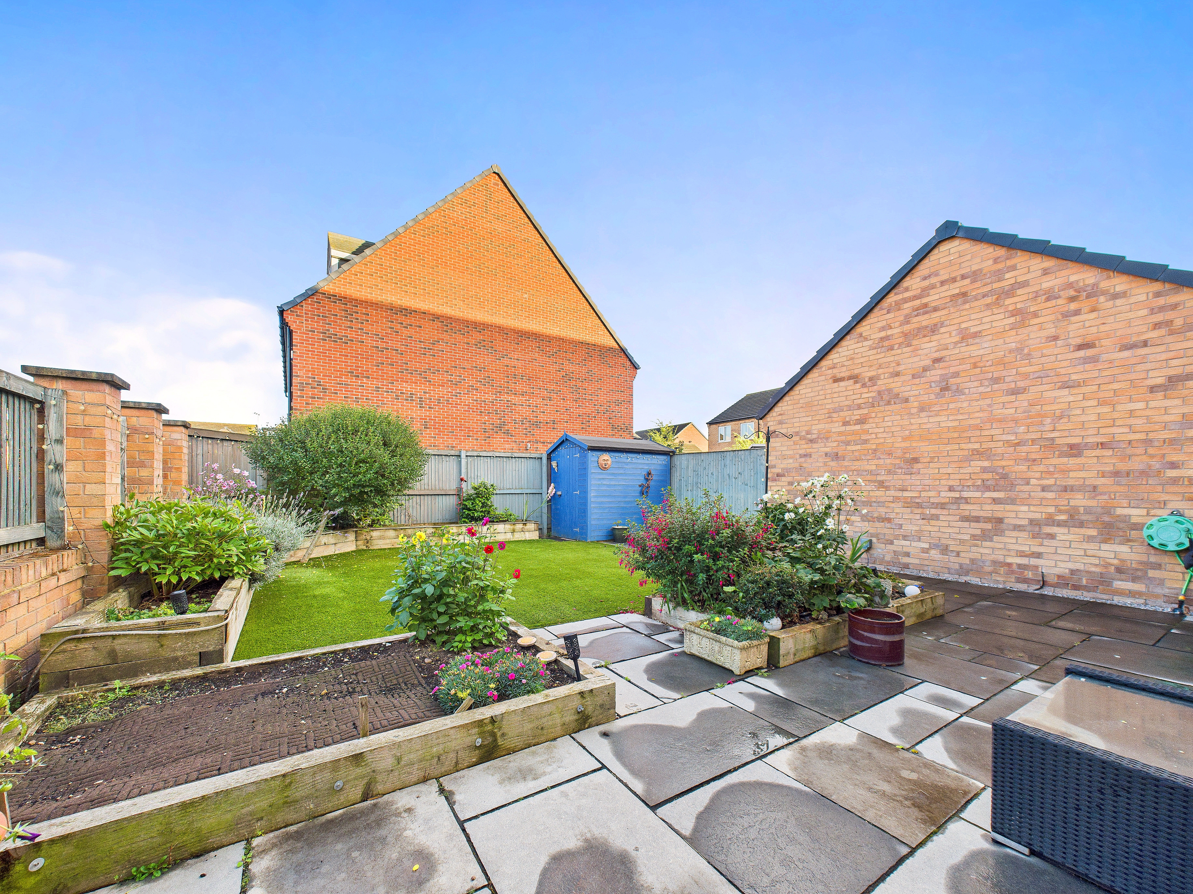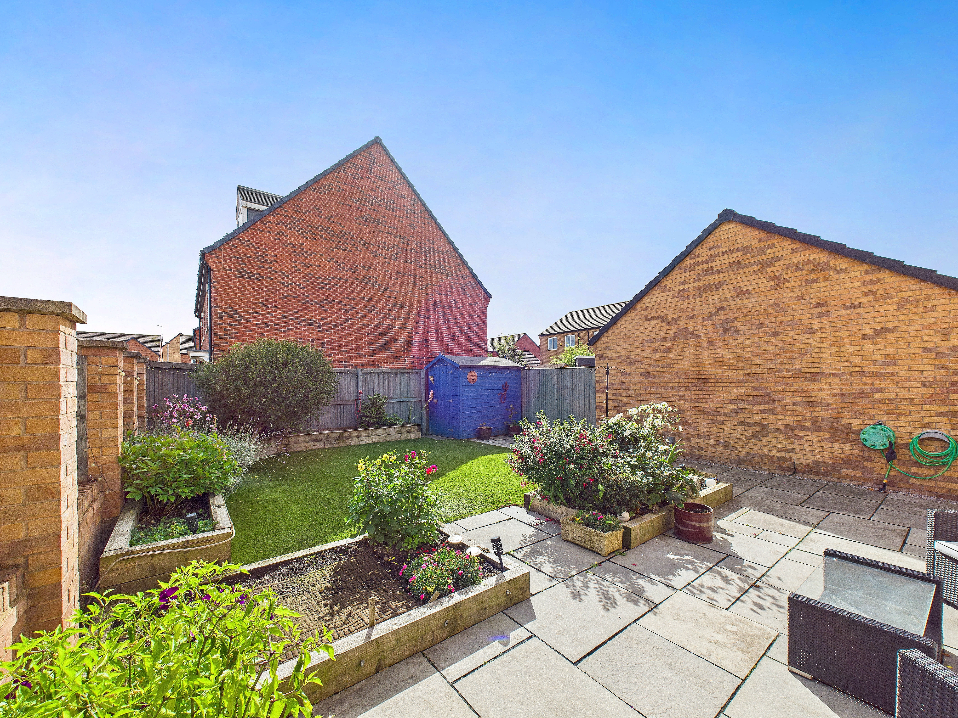 The landscaped rear garden has been thoughtfully designed for low-maintenance enjoyment, featuring Indian slate paving, an artificial lawn, raised borders planted with shrubs and flowers, a shed, and an outdoor electric point. To the front, neat shrub planting enhances the kerb appeal while remaining easy to maintain. The property also benefits from a garage with power and lighting, as well as a private driveway providing ample off-street parking for 3 vehicles.