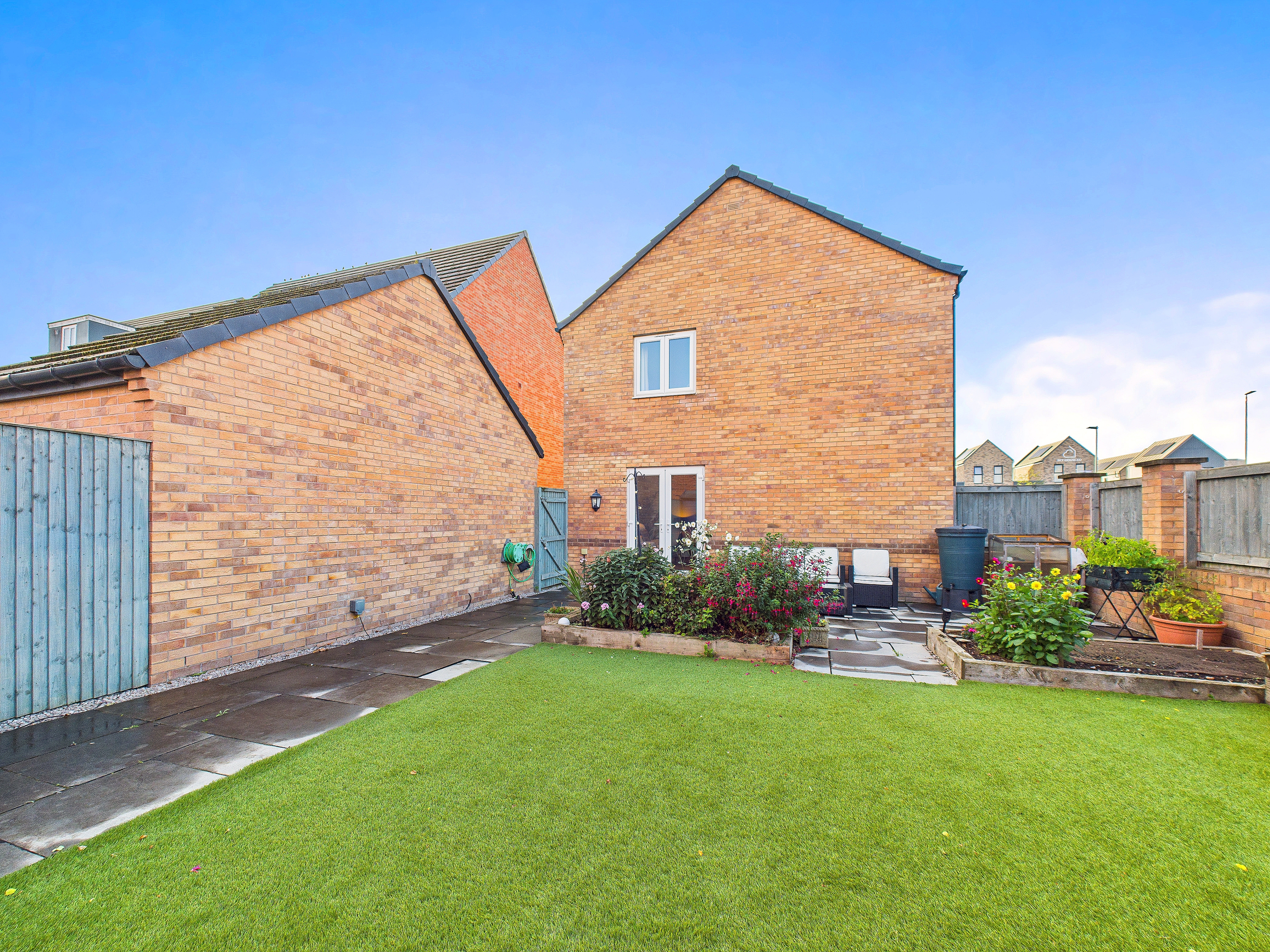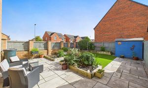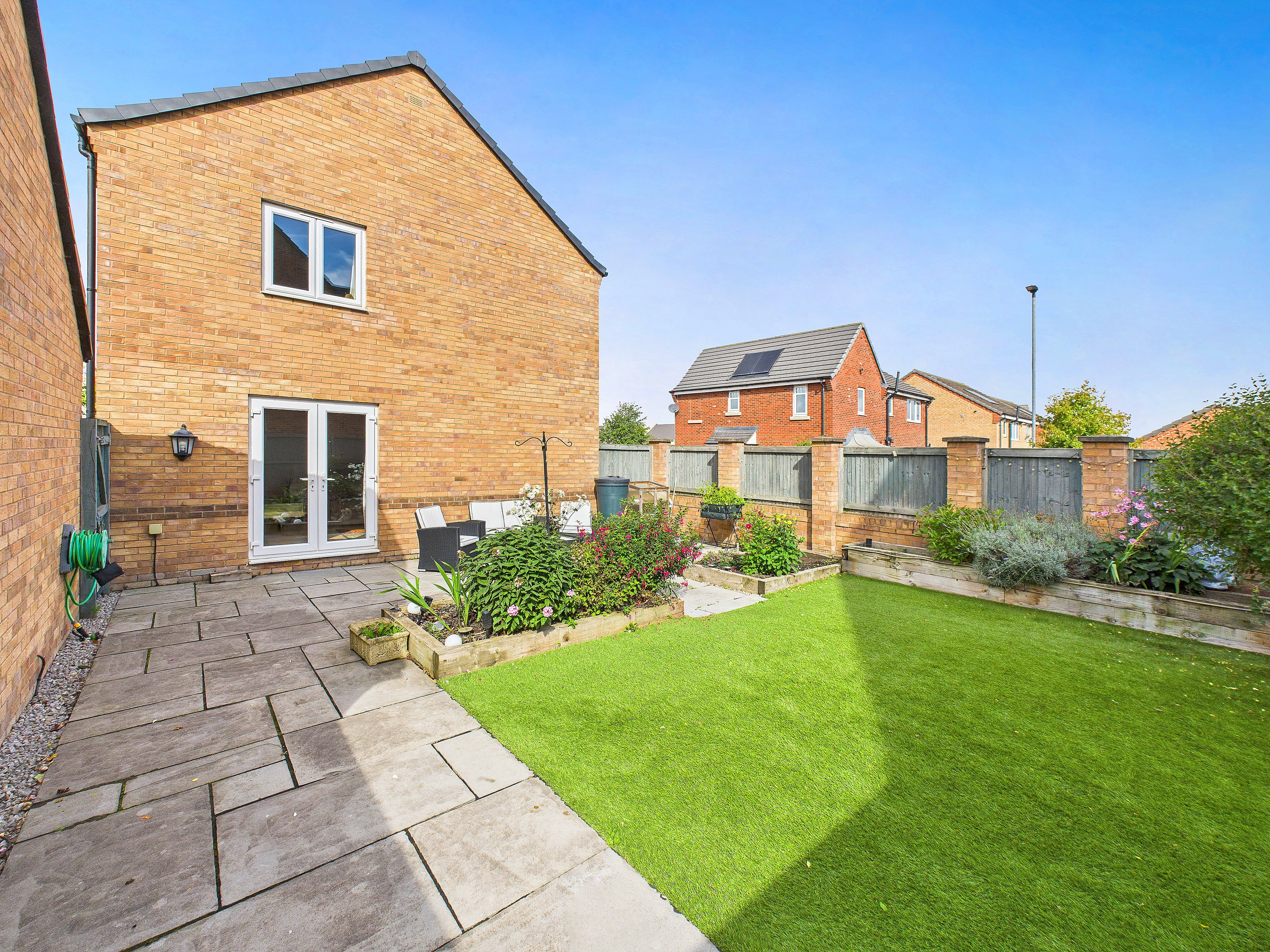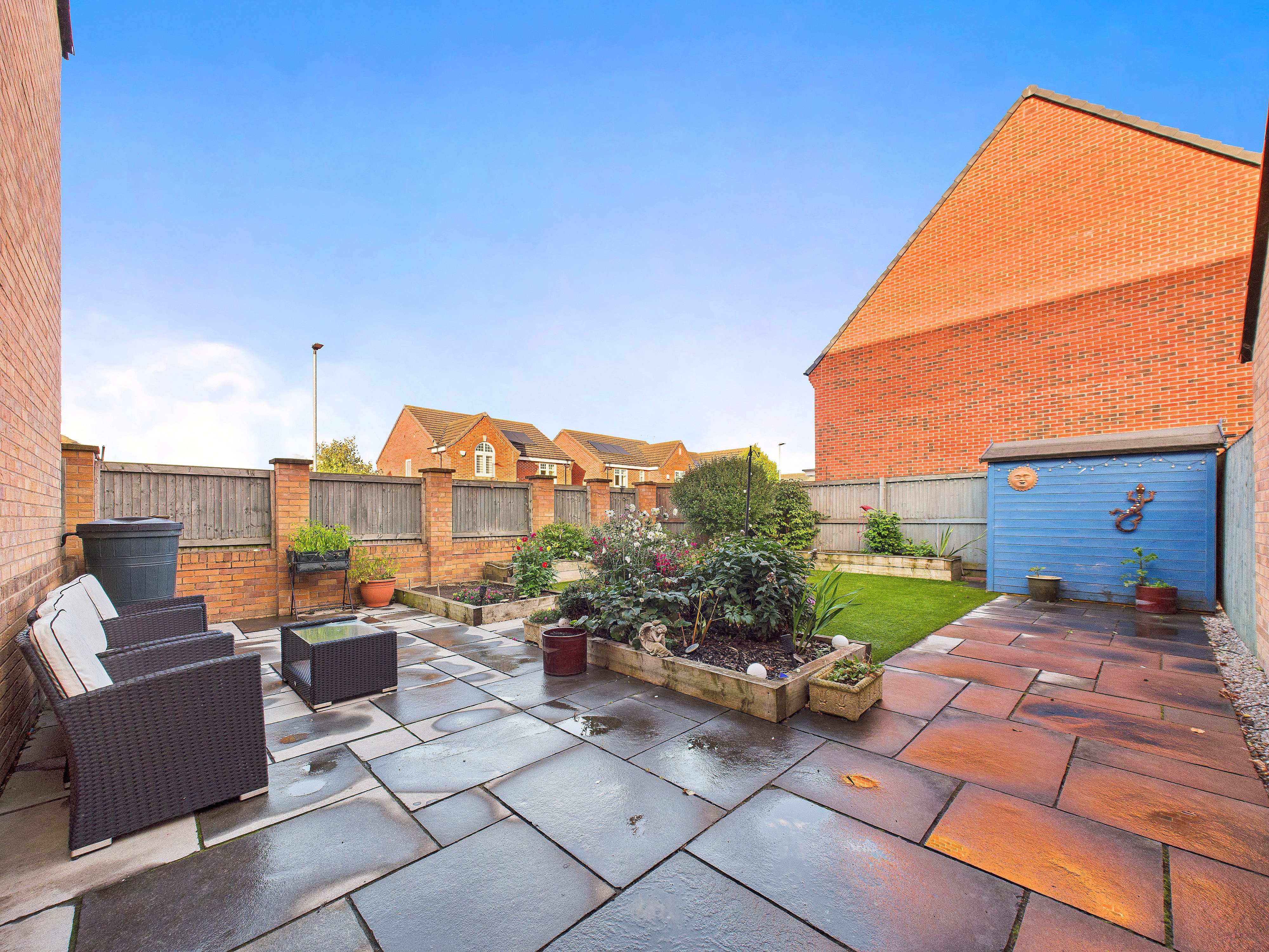 The landscaped rear garden has been thoughtfully designed for low-maintenance enjoyment, featuring Indian slate paving, an artificial lawn, raised borders planted with shrubs and flowers, a shed, and an outdoor electric point. To the front, neat shrub planting enhances the kerb appeal while remaining easy to maintain. The property also benefits from a garage with power and lighting, as well as a private driveway providing ample off-street parking for 3 vehicles.