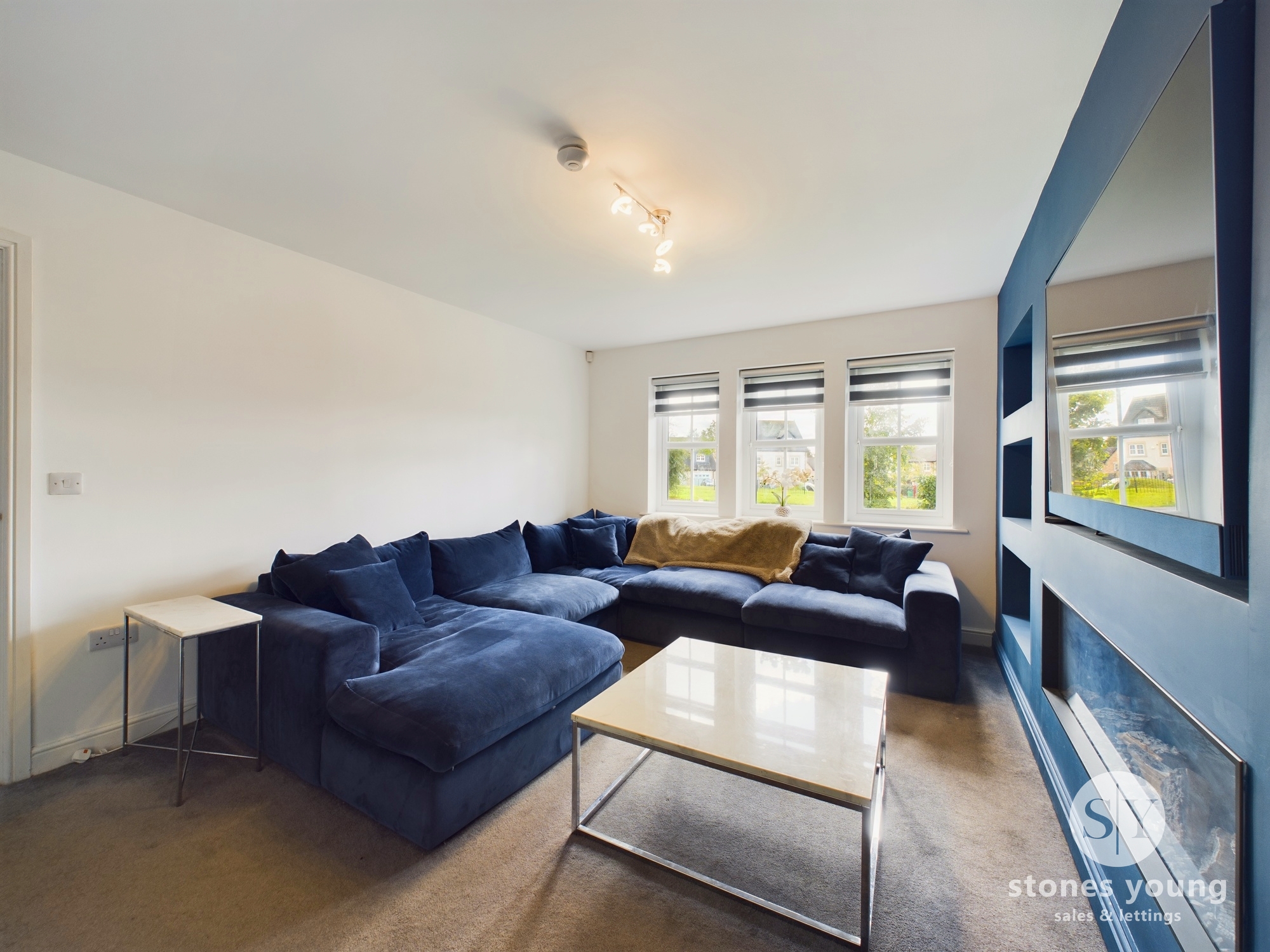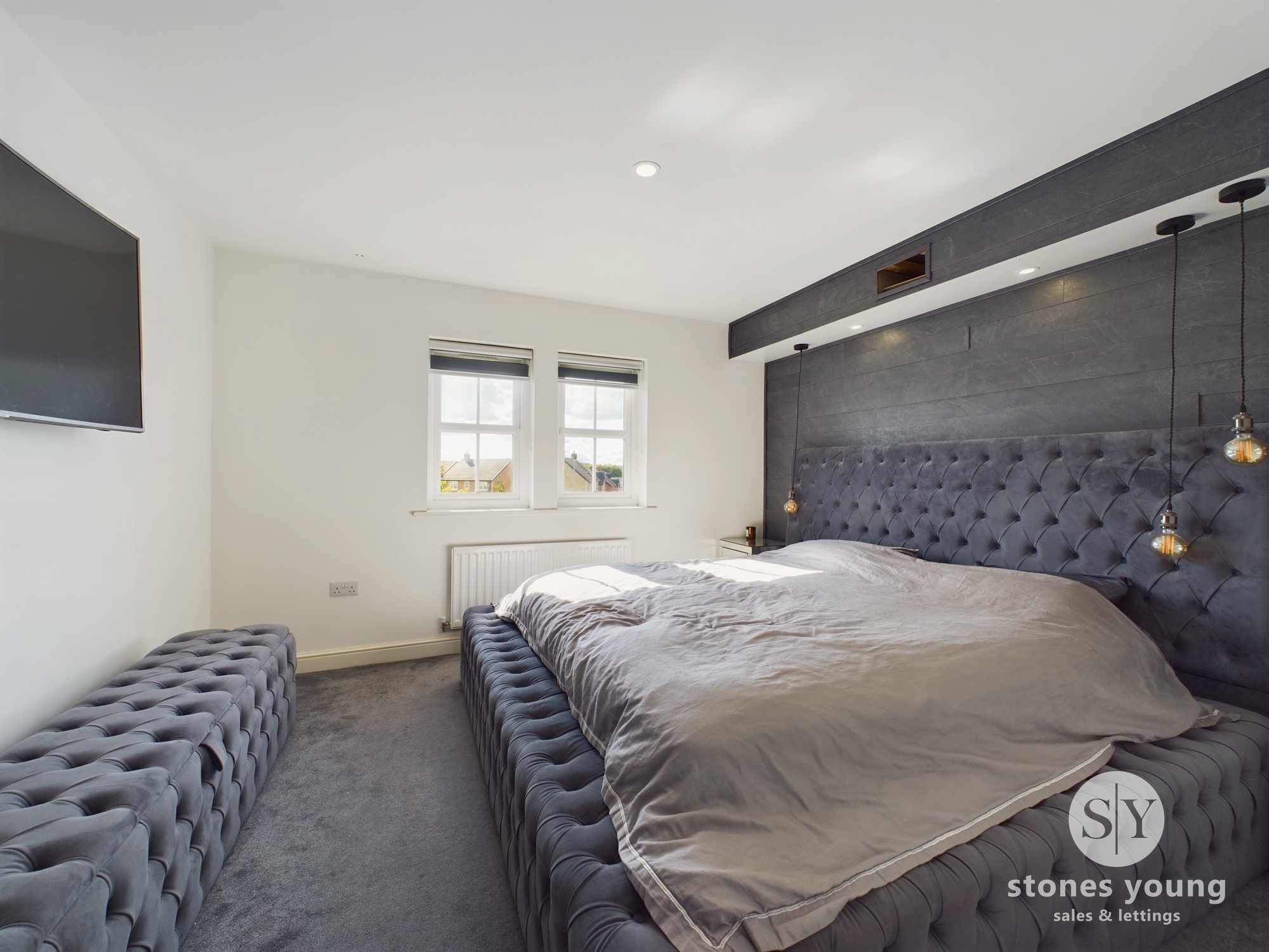 Feature media wall, panelled radiator, carpet flooring, uPVC double glazed windows.