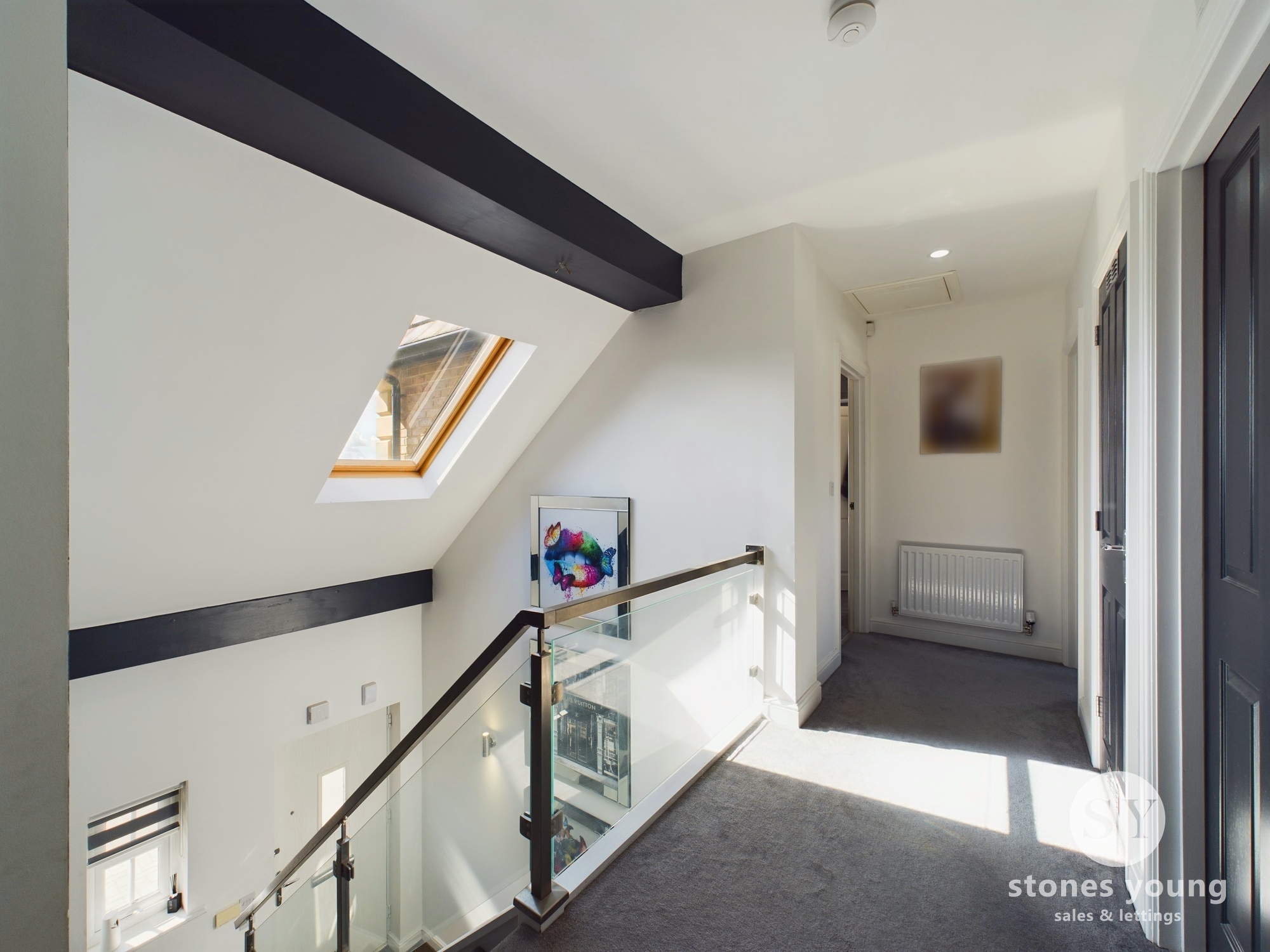 Light filled area with carpet flooring, recessed spotlighting, feature steel and glass balustrade, feature beam, loft access.