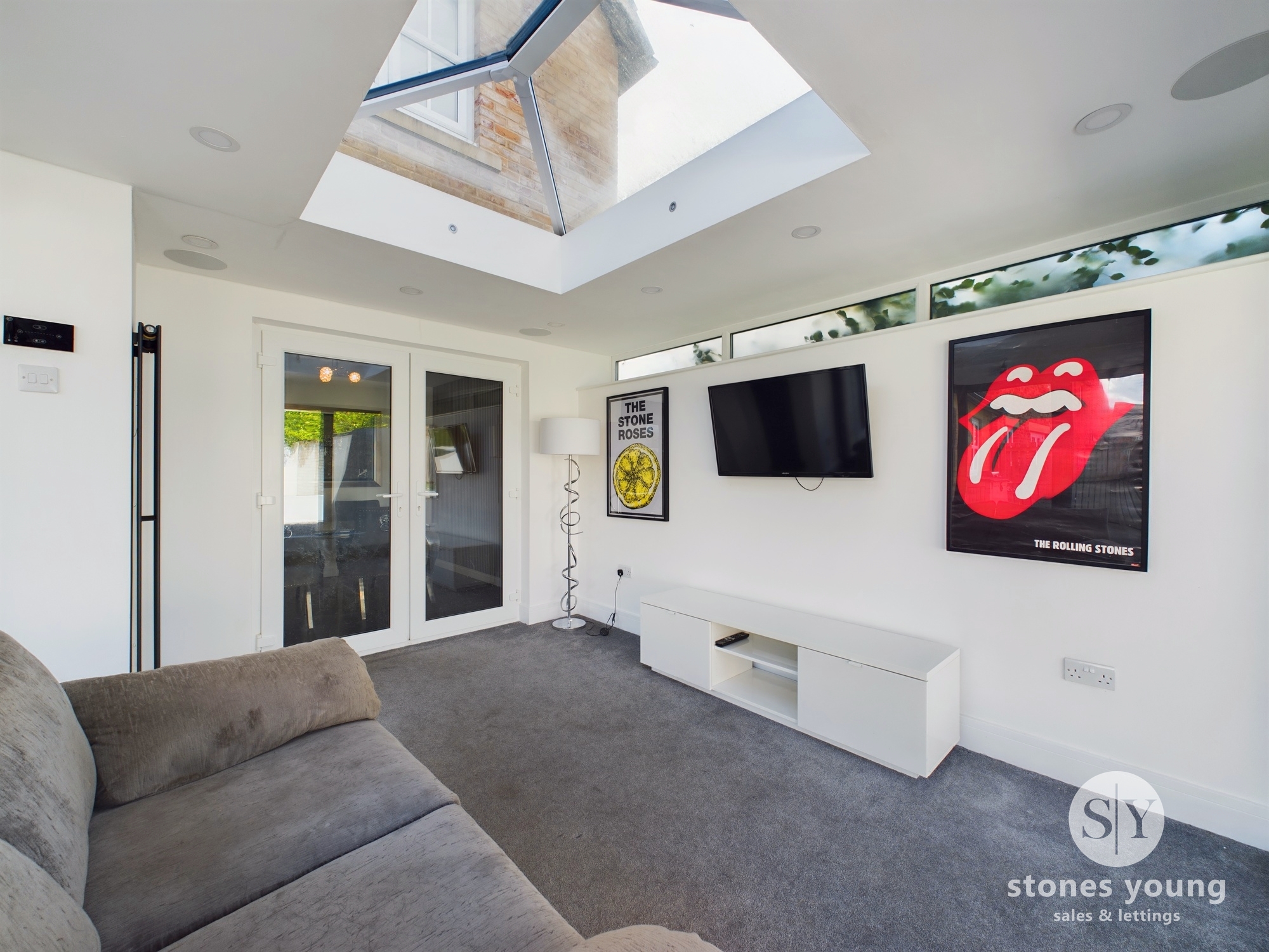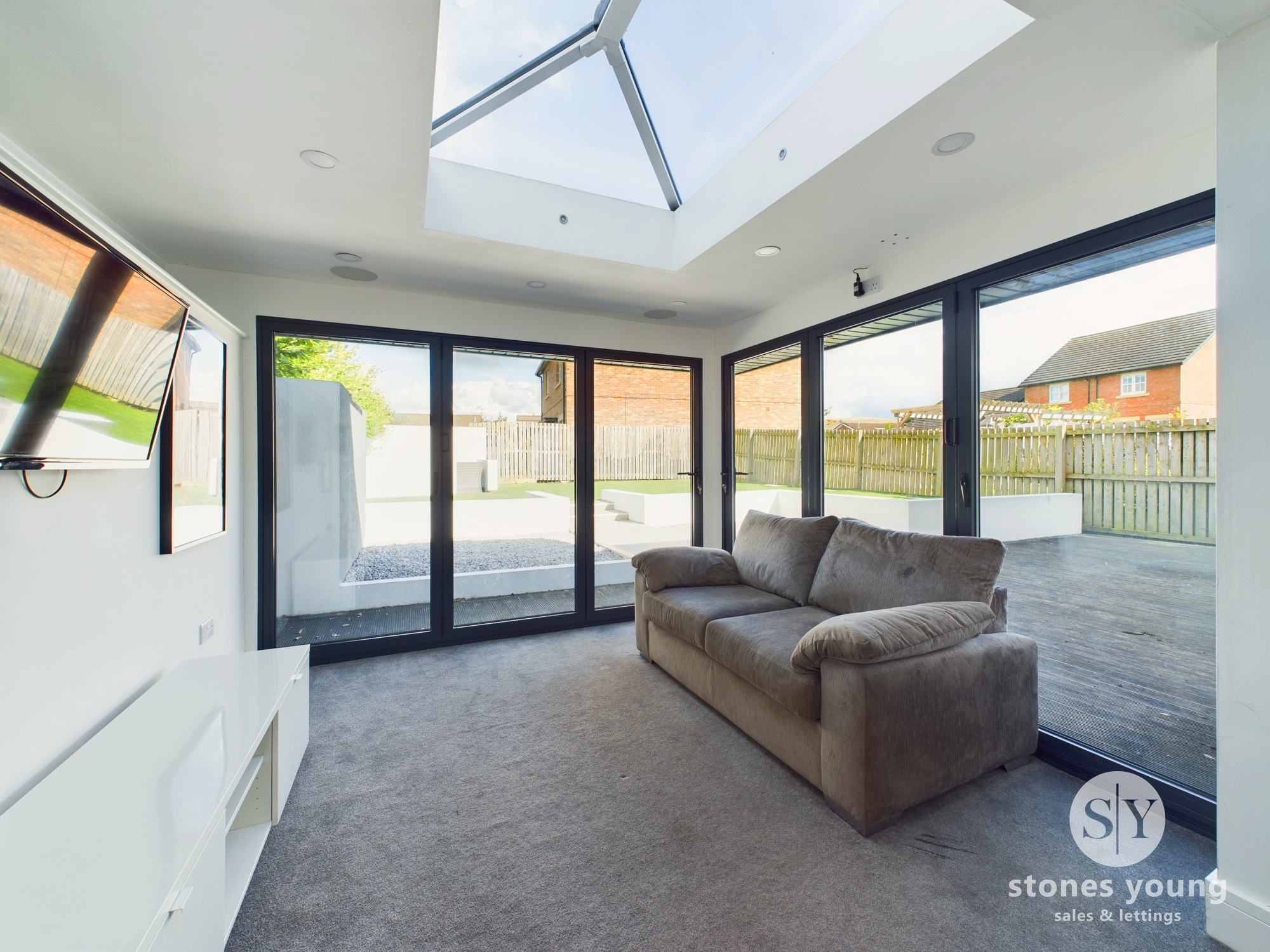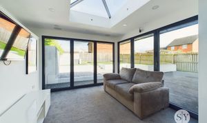 Vertical panelled radiator, carpet flooring, recessed spotlighting, recessed ceiling speakers, television point, two sliding bi-fold opening doors, lantern style feature roof window, uPVC double glazed windows.