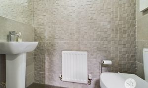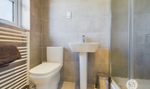3-pce white suite comprising shower enclosure, sliding glazed doors, pedestal wash basin, low level w.c., tiled walls, tiled flooring, white ladder style radiator, recessed spotlighting, extractor fan, shaver point, uPVC double glazed frosted window.