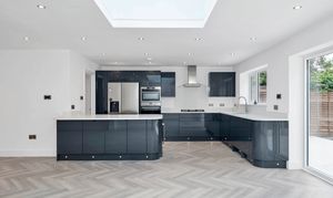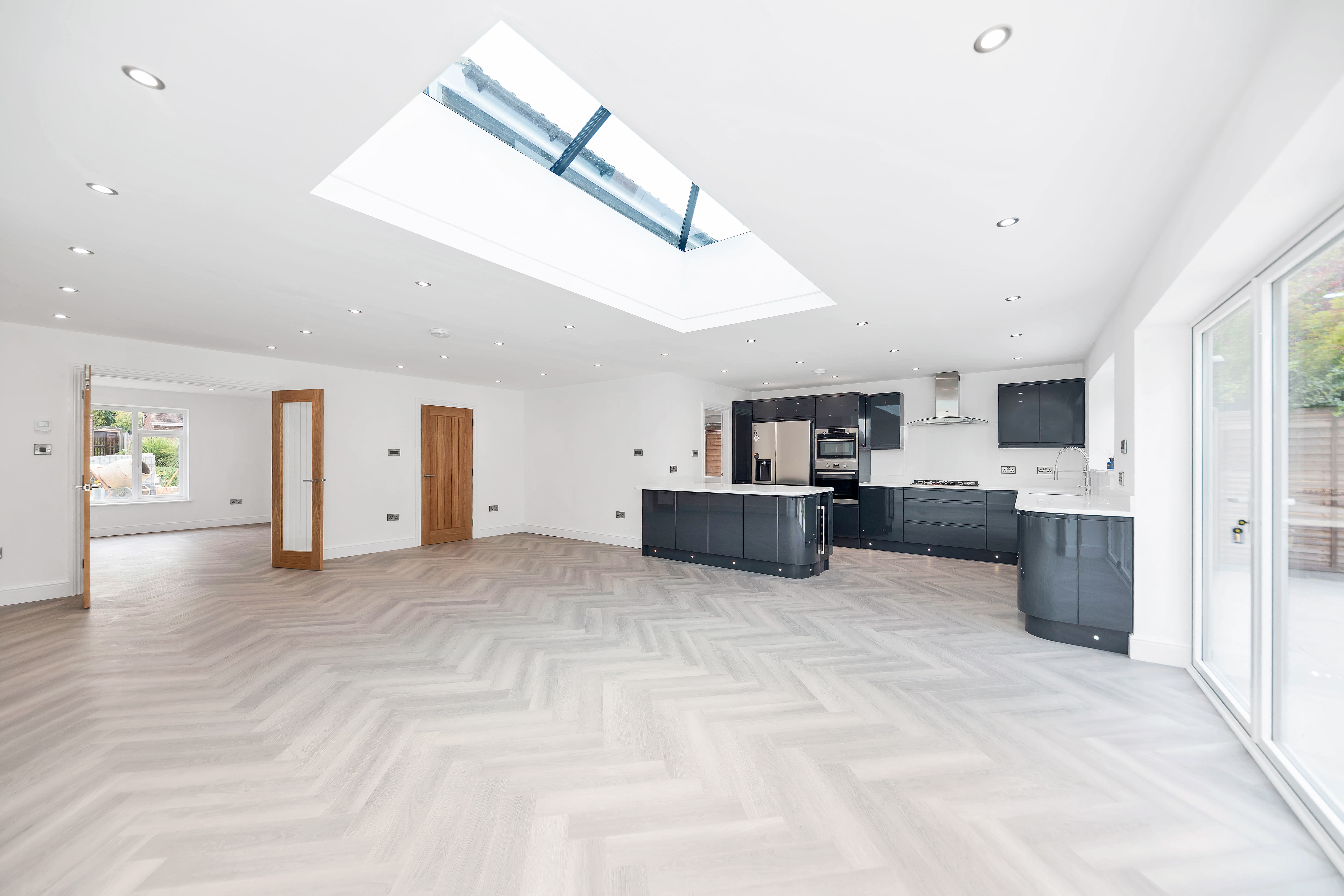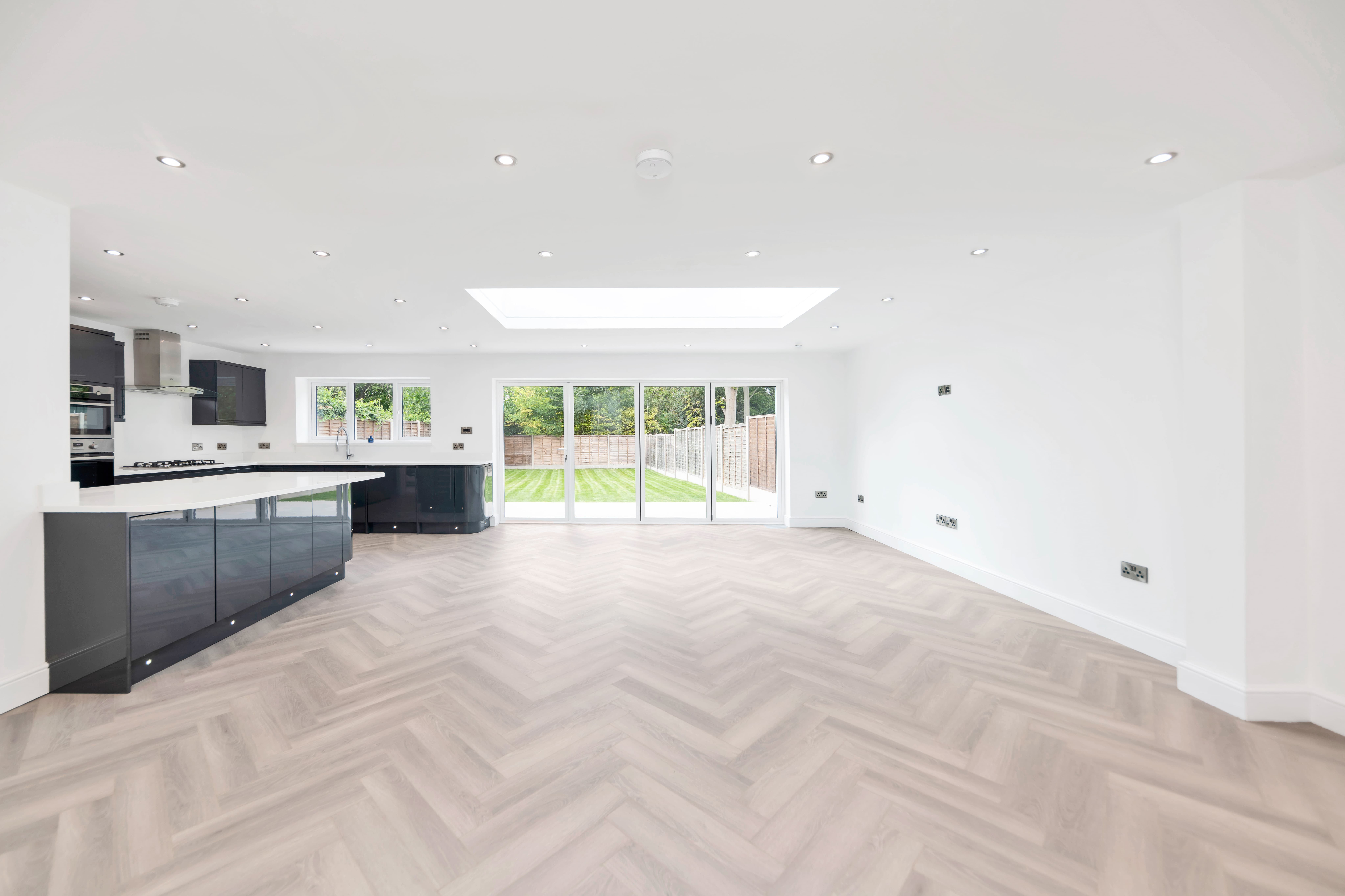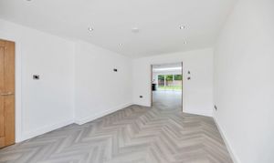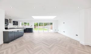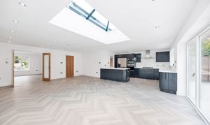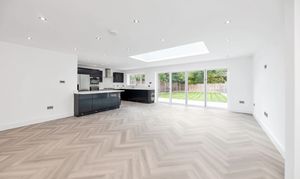 The kitchen/dining room is wonderfully open-plan, enjoying windows and bi-fold doors leading out onto a garden terrace, making it a fantastic entertaining space. There is lovely parquet wood flooring, inset lighting, a roof lantern and vast amounts of space for lounge, dining and storage furniture.