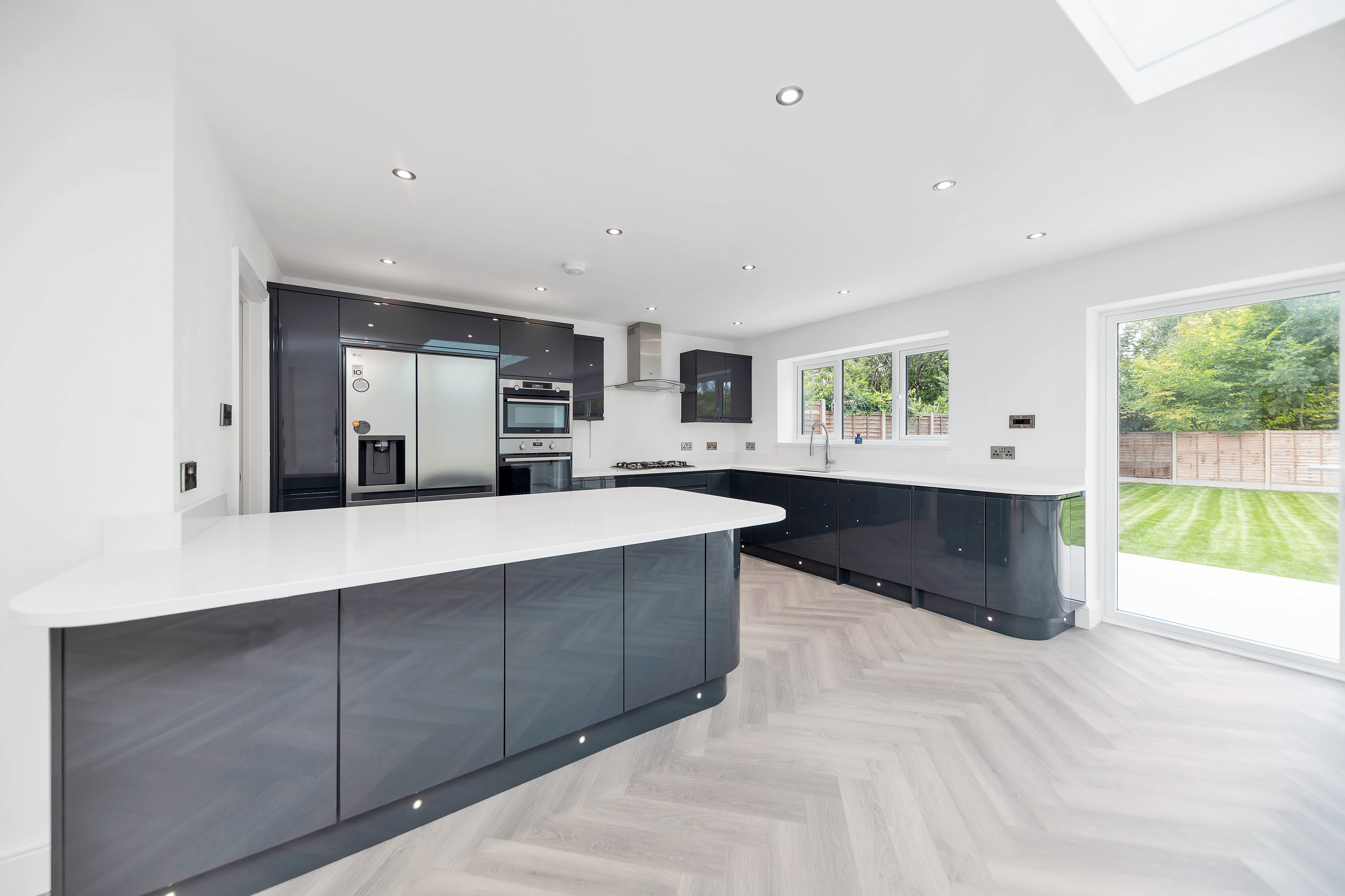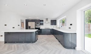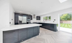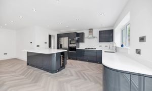 In the kitchen area, there is an extensive range of modern gloss base and wall units, composite worktops, a large island/breakfast bar, an integrated oven, microwave, gas hob, extractor hood, wine cooler and dishwasher, and space for an American fridge/freezer and other small kitchen appliances. The utility room provides further storage, access to the side of the house, and space for laundry appliances.