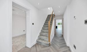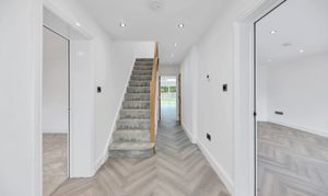 This well-presented property offers a pleasant and tidy frontage, space for potted plants, access to the rear of the property, and a brand new driveway with a brick wall to the front. Upon stepping inside, the entrance hallway is bright, wide and beautifully decorated, alluding to the high standard of renovation seen throughout. It enjoys parquet wood flooring, inset lighting, integrated storage, room for furniture, and access through to the downstairs living space, including a cloakroom WC.