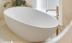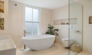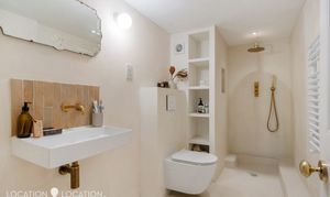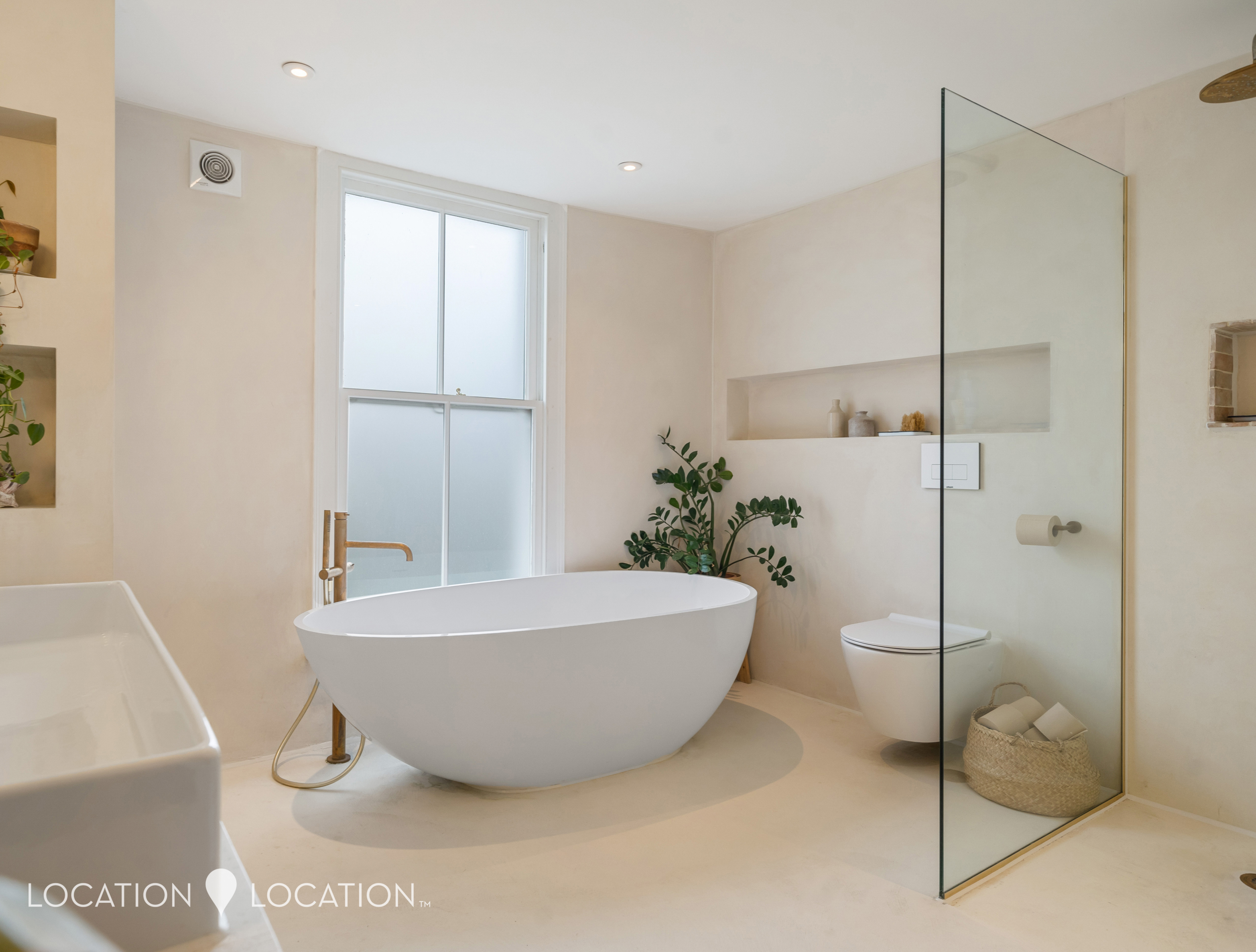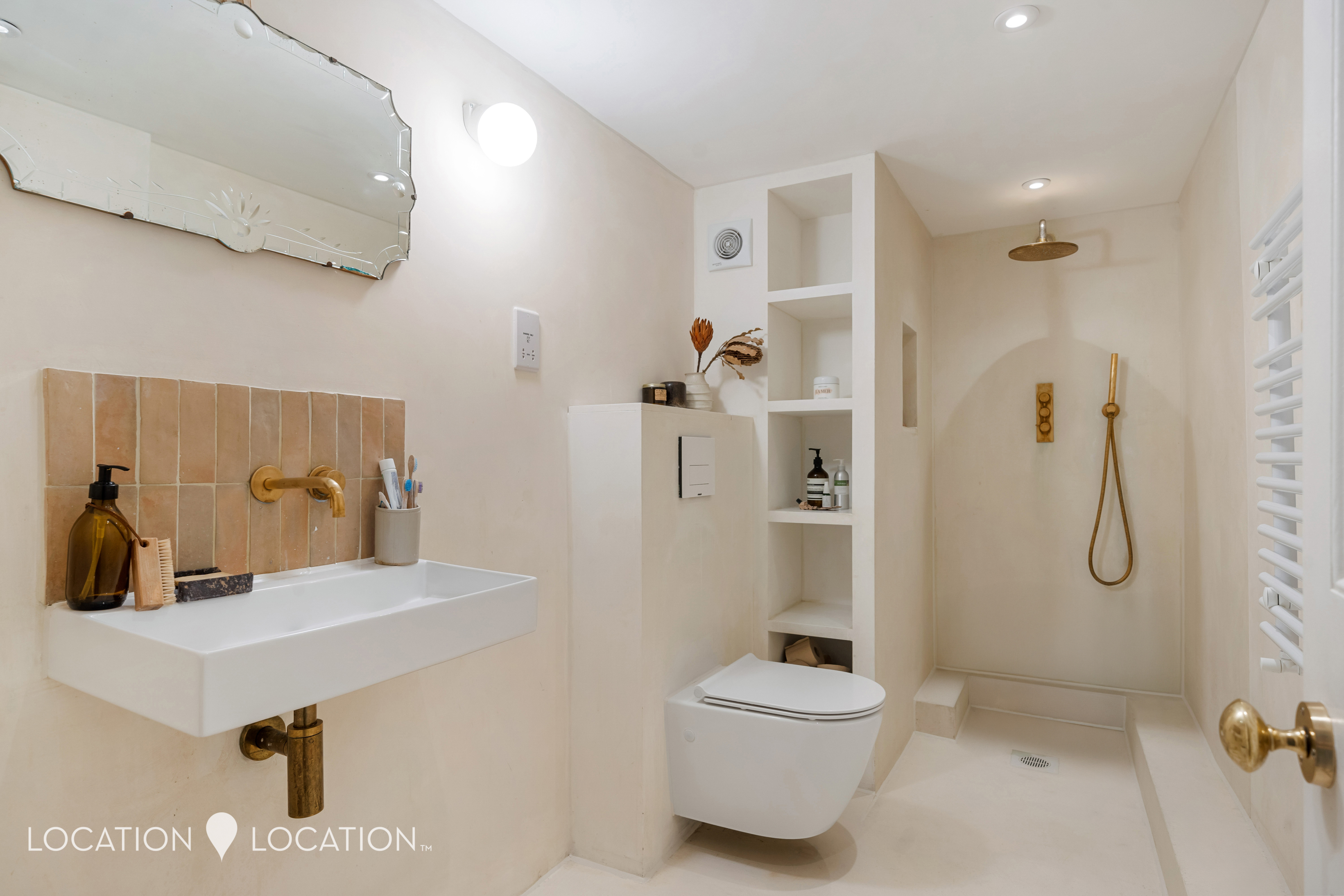 The upper floors offer four further bedrooms, a beautiful four-piece bathroom suite with micro-cement and handmade Moroccan tiles, an extra shower room, and a handy utility room, too.