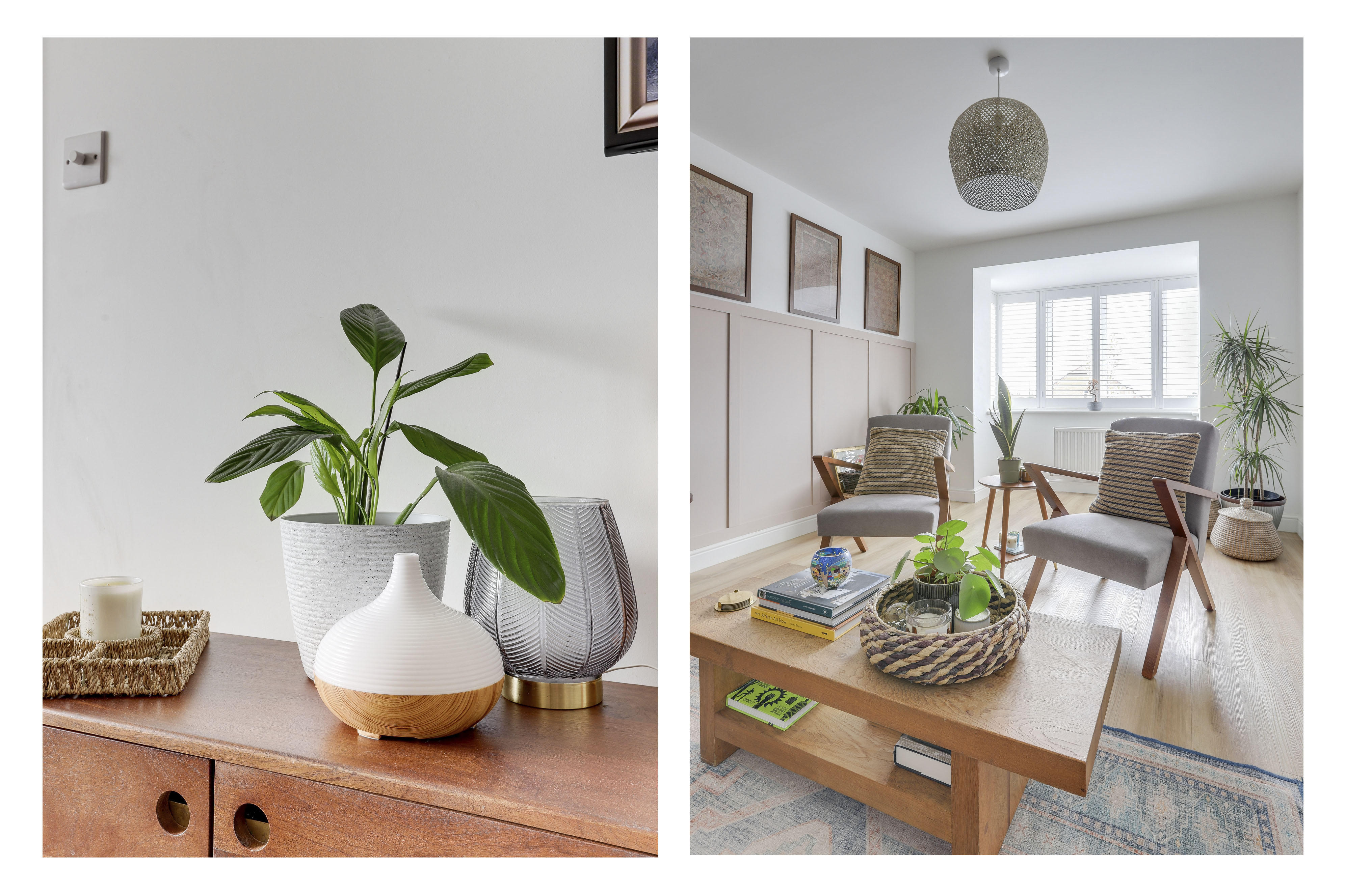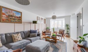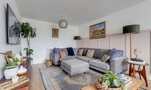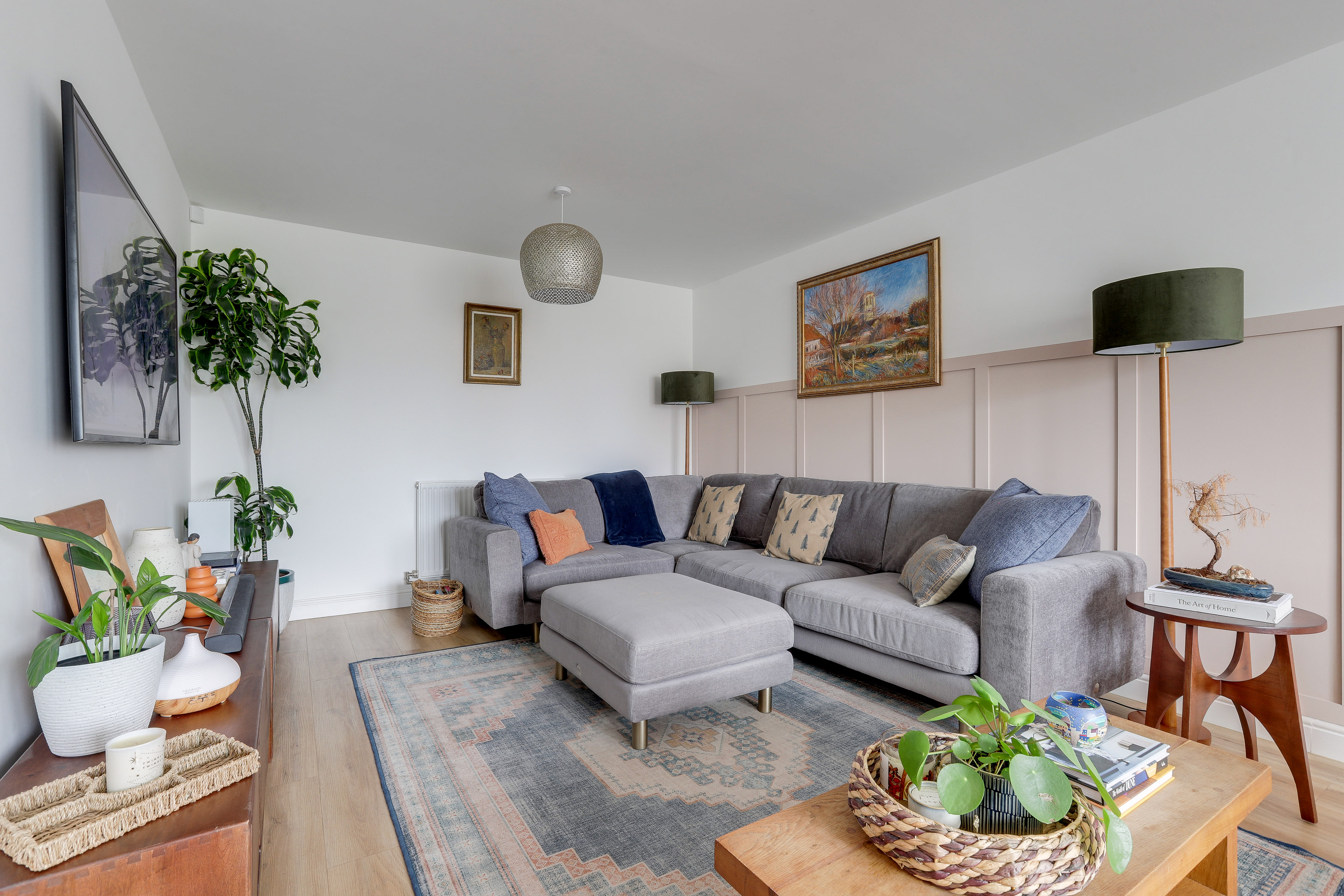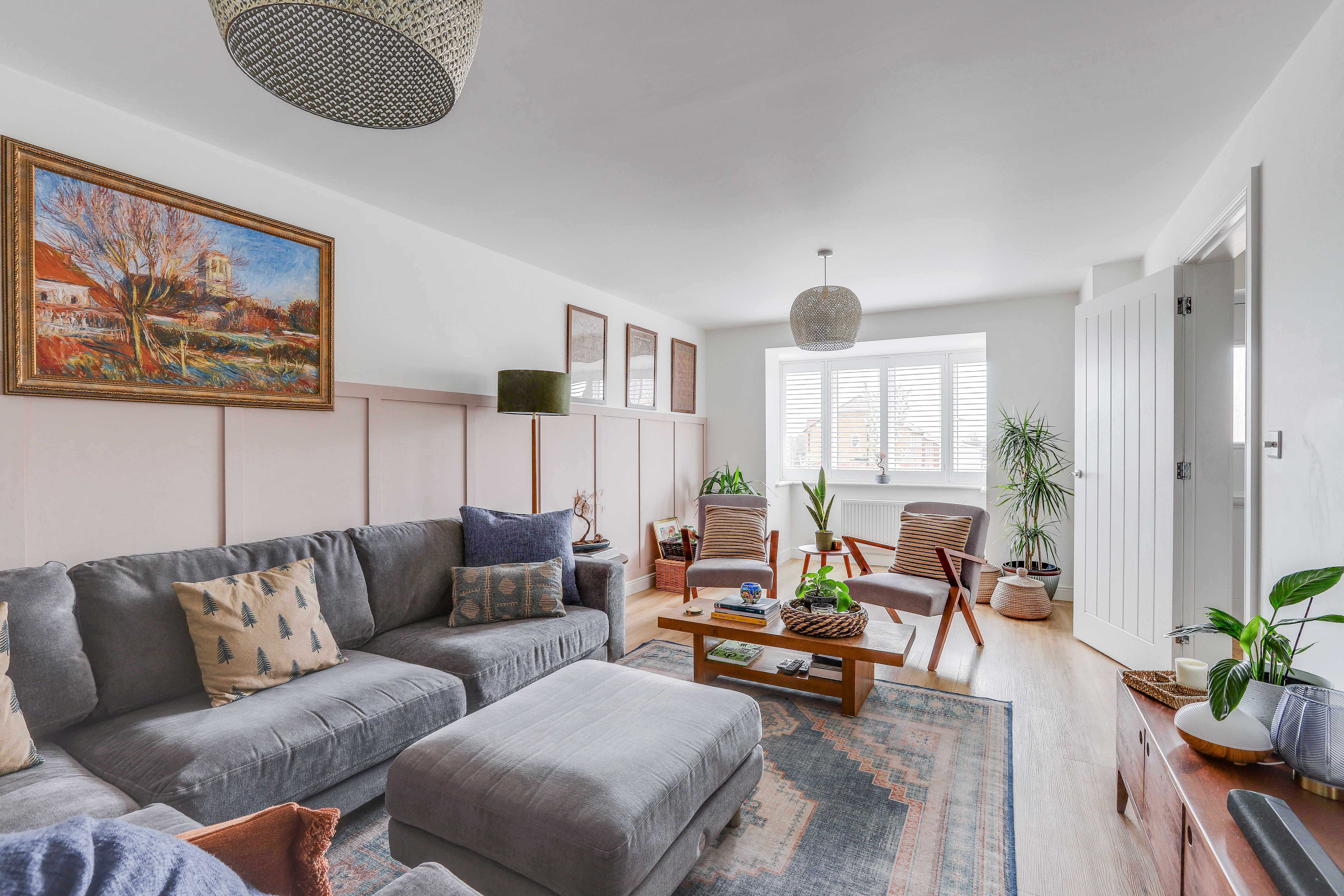 The living room has a UPVC double-glazed square bay window with bespoke fitted wooden shutters to the front elevation, Moduleo LVT flooring, a panelled feature wall, two radiators, an ethernet port, and a TV point.