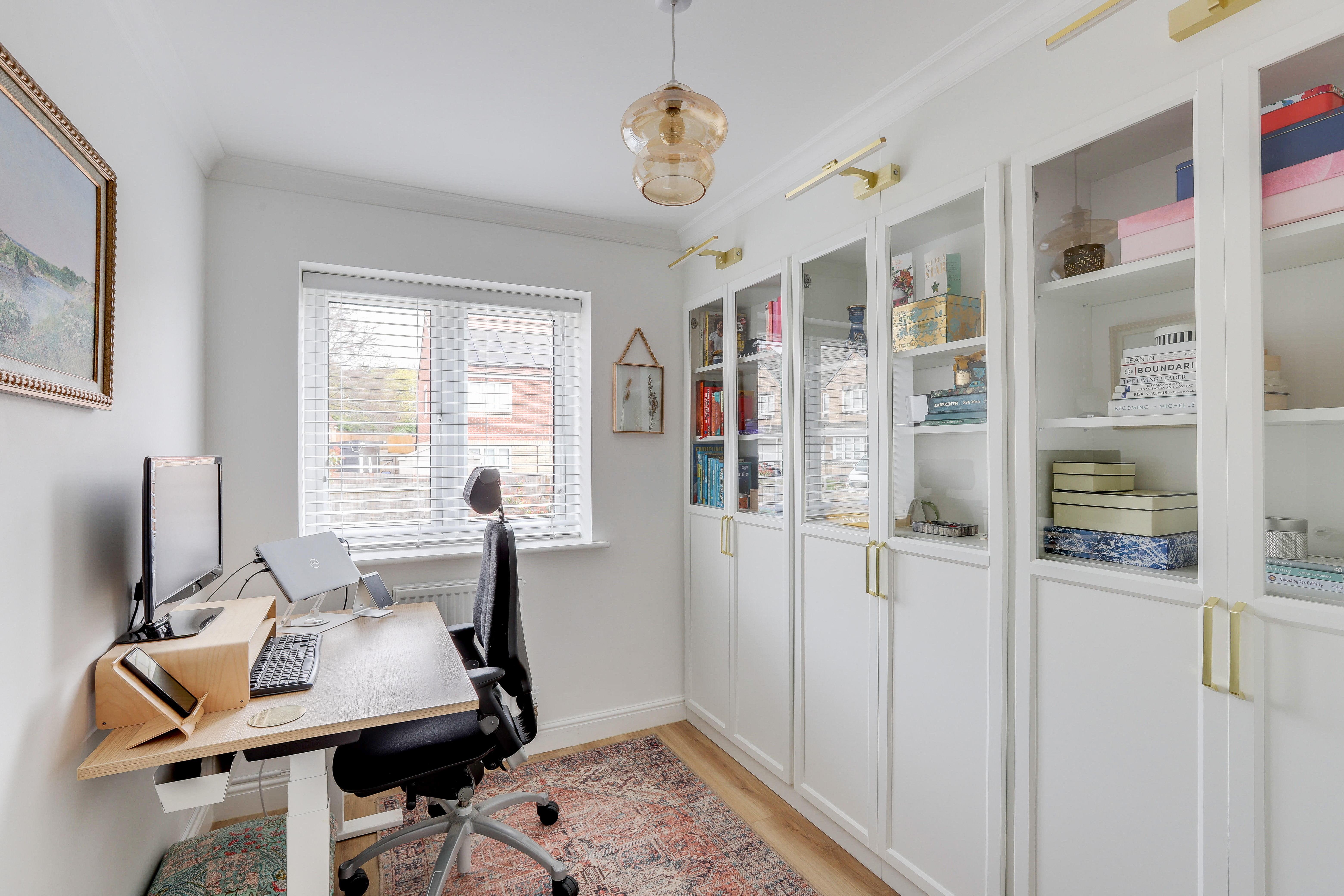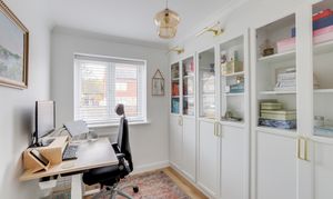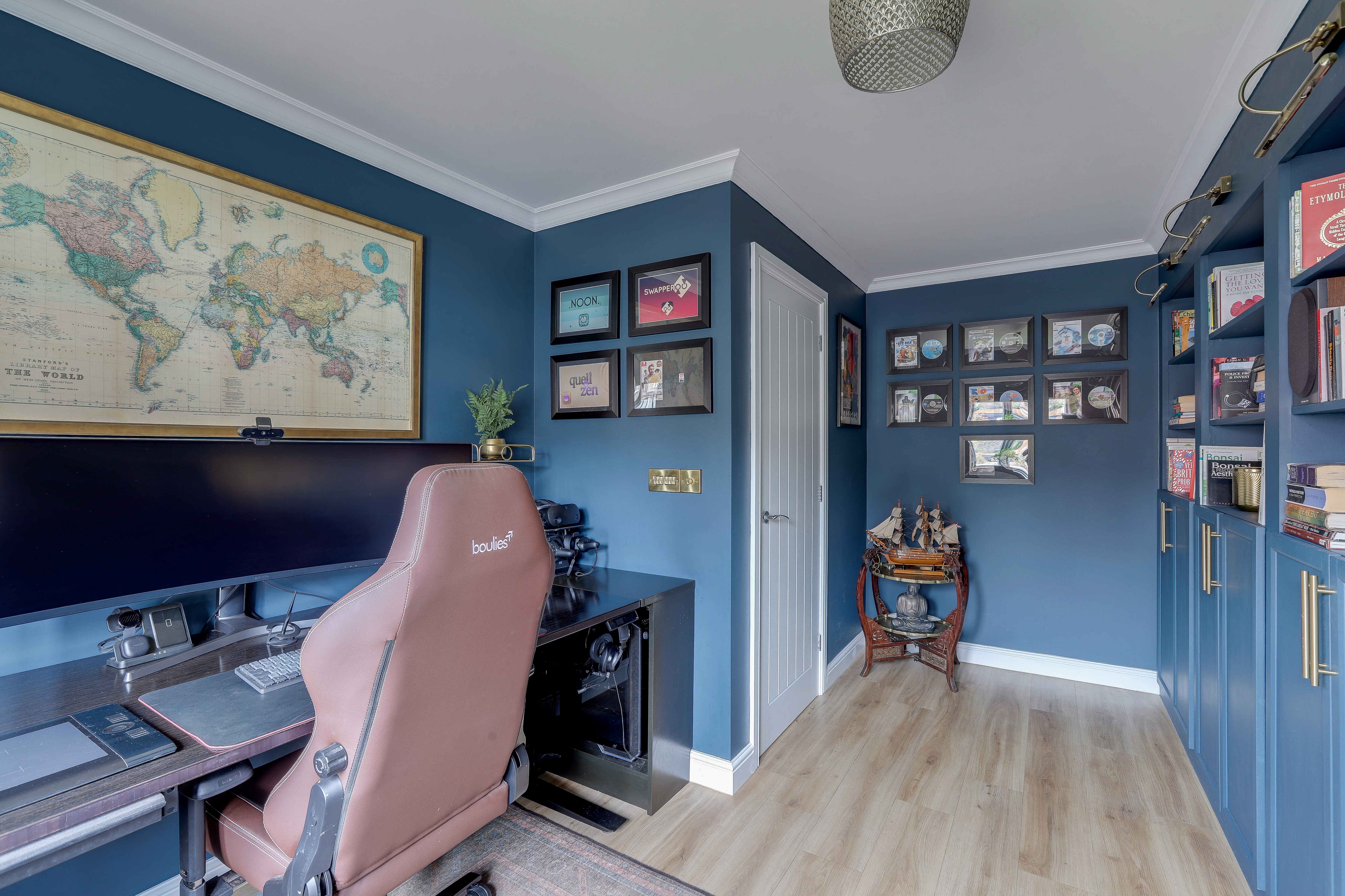 The fourth bedroom has a UPVC double-glazed window to the rear elevation, Moduleo LVT flooring, coving to the ceiling, a radiator, an ethernet port, and wall-to-wall bespoke built-in storage with shelving, wall-mounted picture lights and various cupboards.