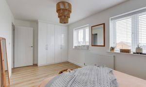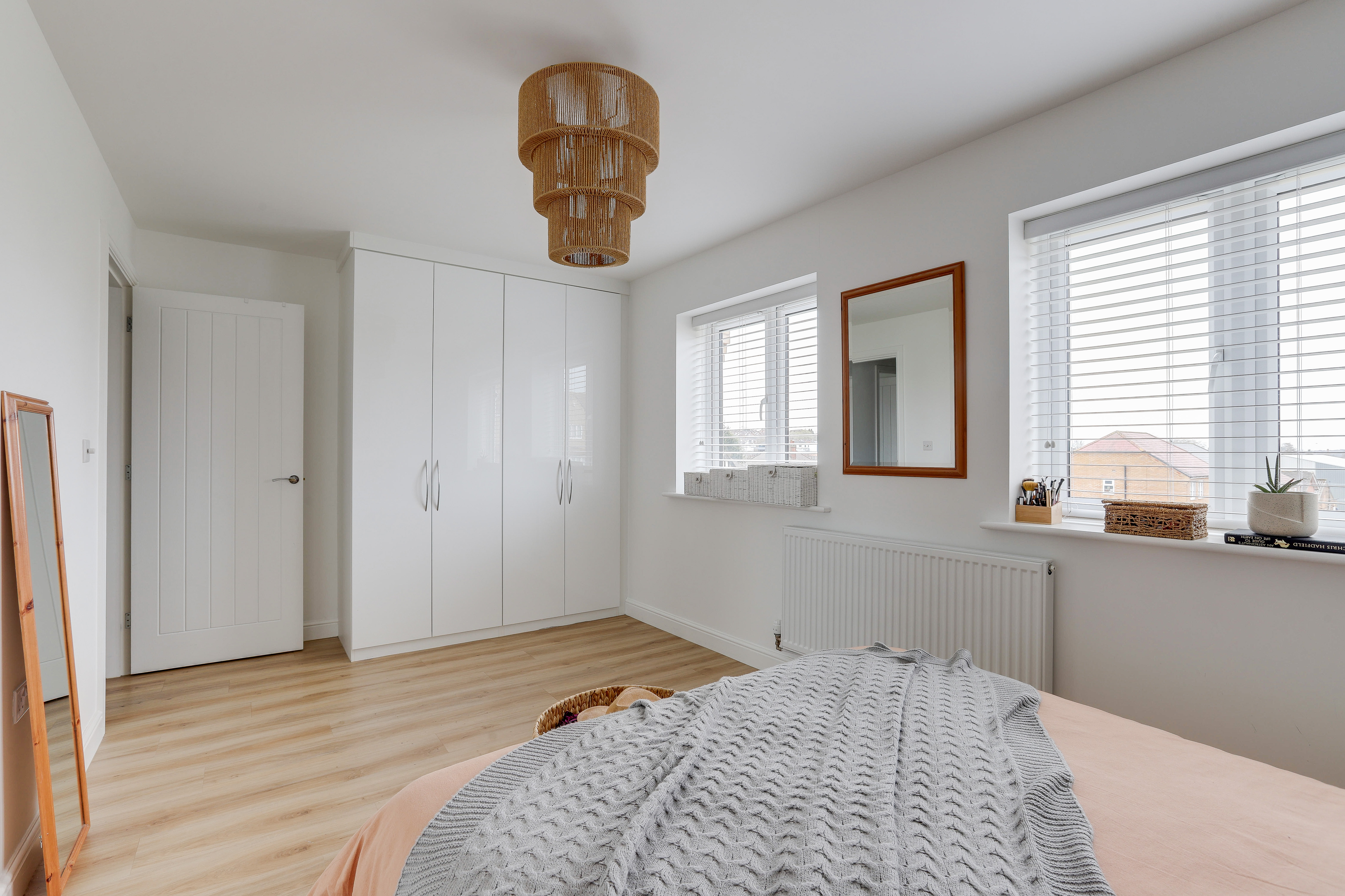 The second bedroom has two UPVC double-glazed windows to the front elevation, Moduleo LVT flooring, a radiator, and a fitted quadruple wardrobe.