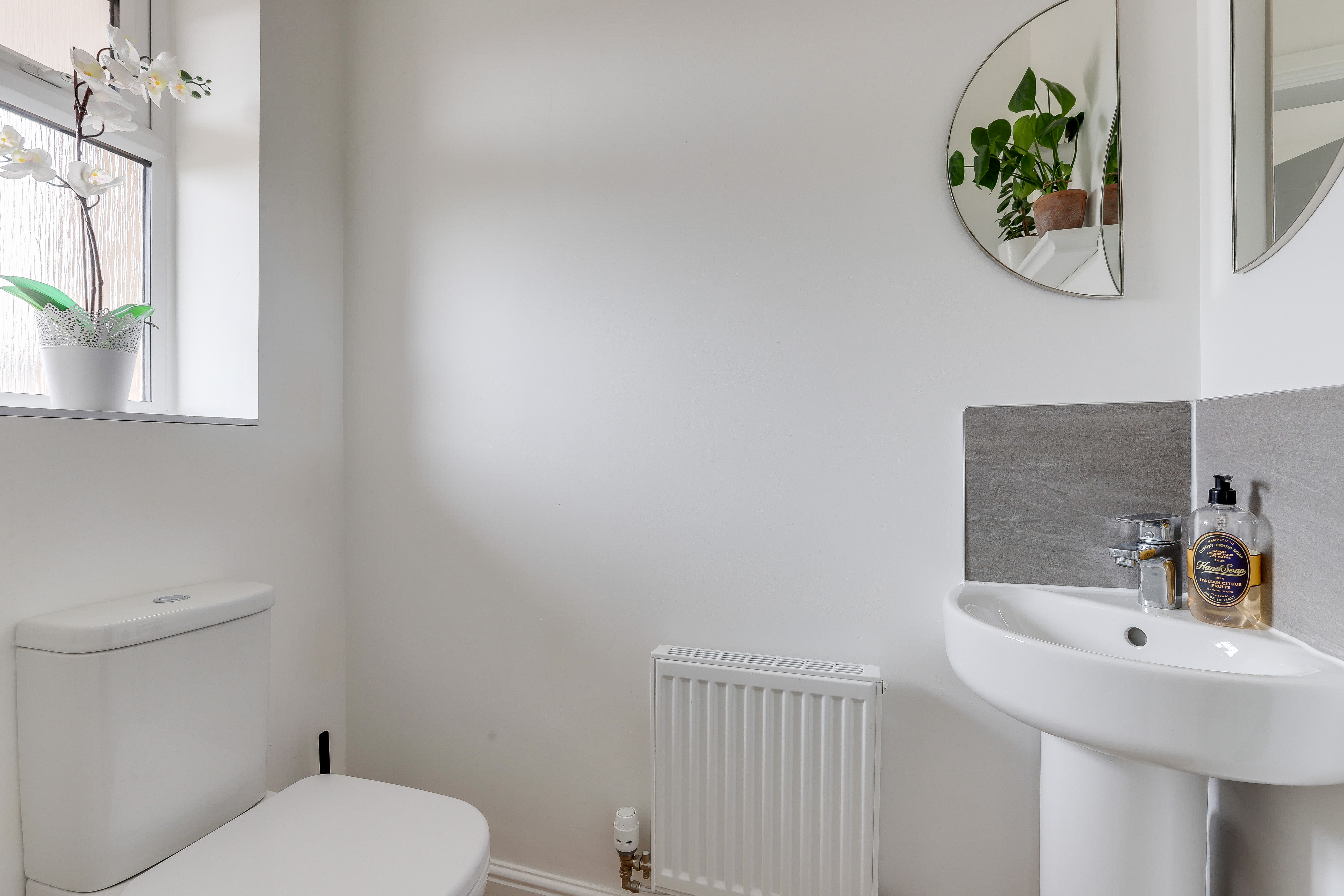 This space has a low-level flush WC, a pedestal wash basin, tiled splashback, Moduleo LVT flooring, a radiator, an extractor fan, and a UPVC double-glazed obscure window to the front elevation.