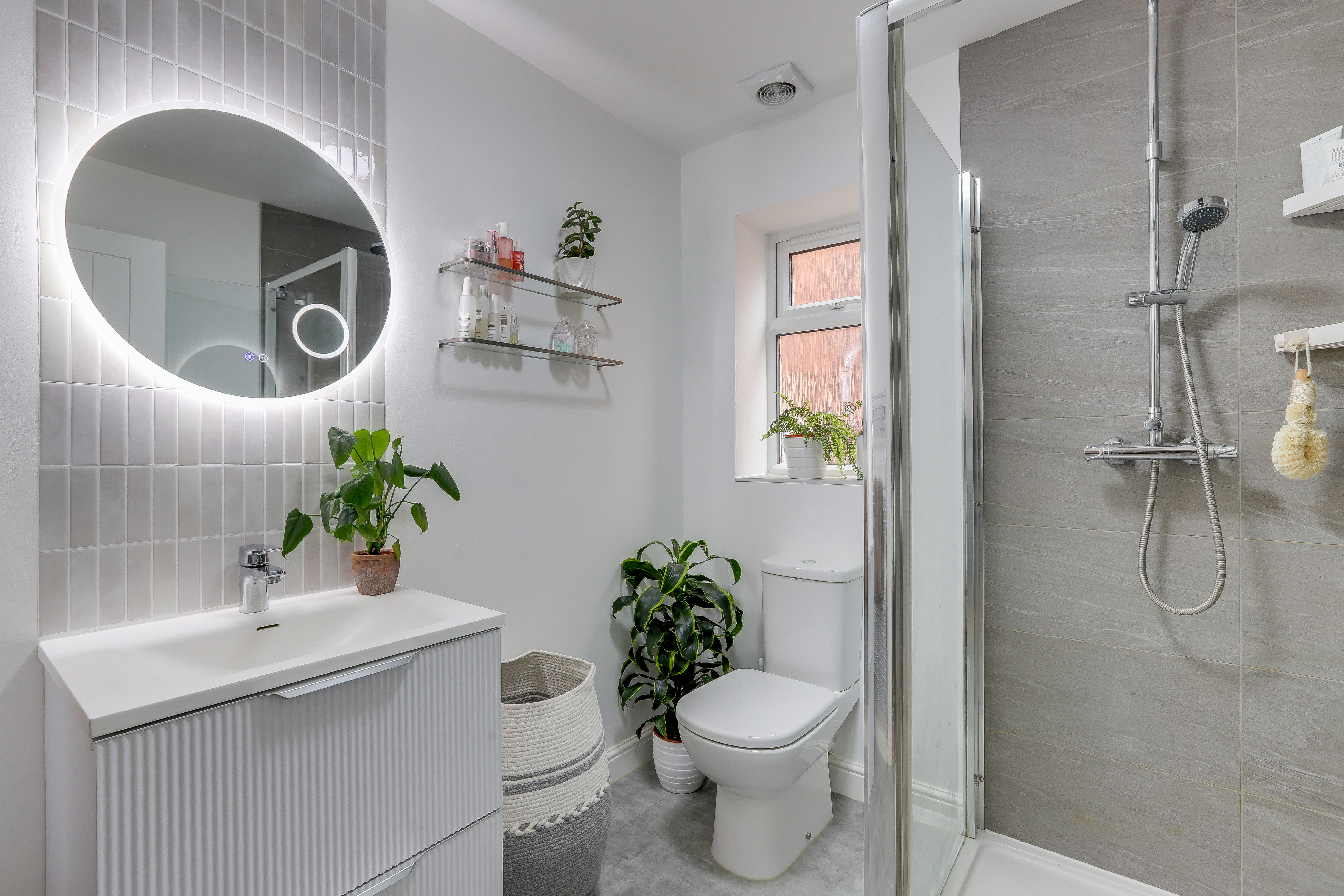 The en-suite has a low-level dual flush WC, a vanity unit with a stone wash basin, a wall-mounted electric mirror with touch-sensors, an electrical shaving point, a shower enclosure with a mains-fed rainfall shower, partially tiled walls, Moduleo LVT flooring, a chrome heated towel rail, an extractor fan, and a UPVC double-glazed obscure window to the side elevation.