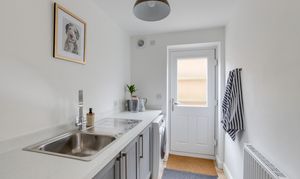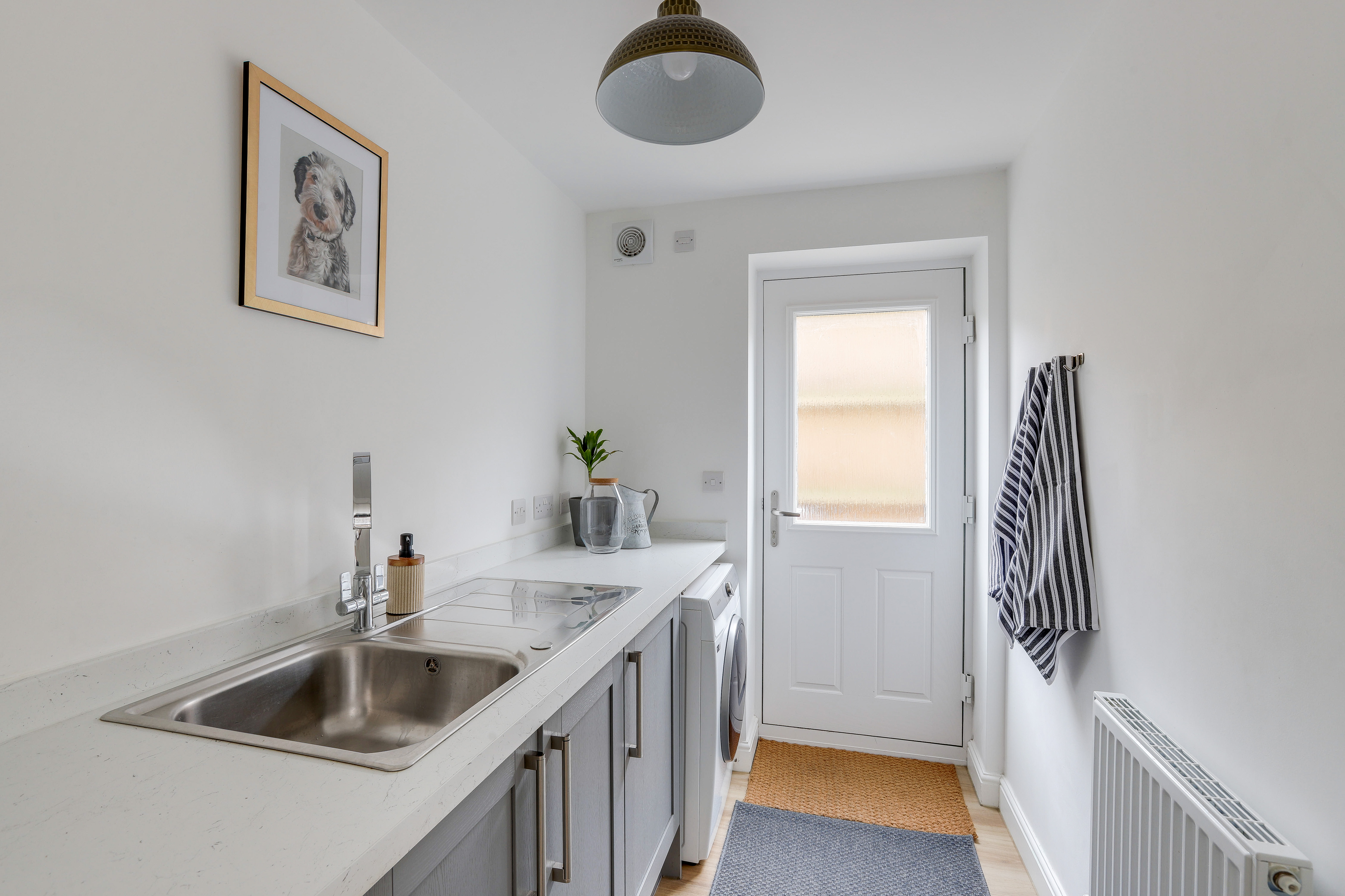 The utility room has fitted shaker-style base units with a worktop, a stainless steel sink with a swan-neck mixer tap and drainer, space and plumbing for a washing machine, space for a tumble-dryer, a radiator, Moduleo LVT flooring, an extractor fan, and a single composite door providing side access.