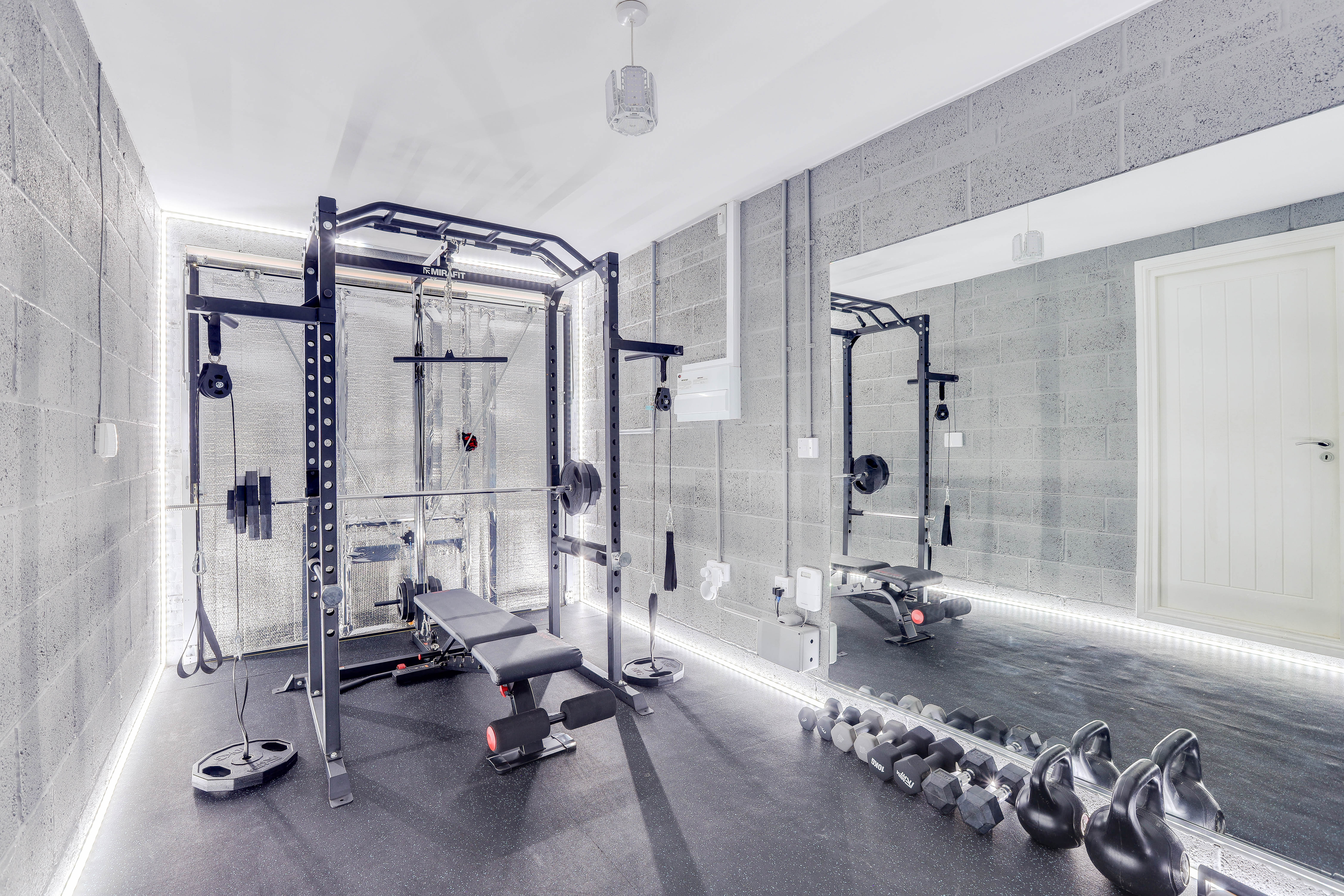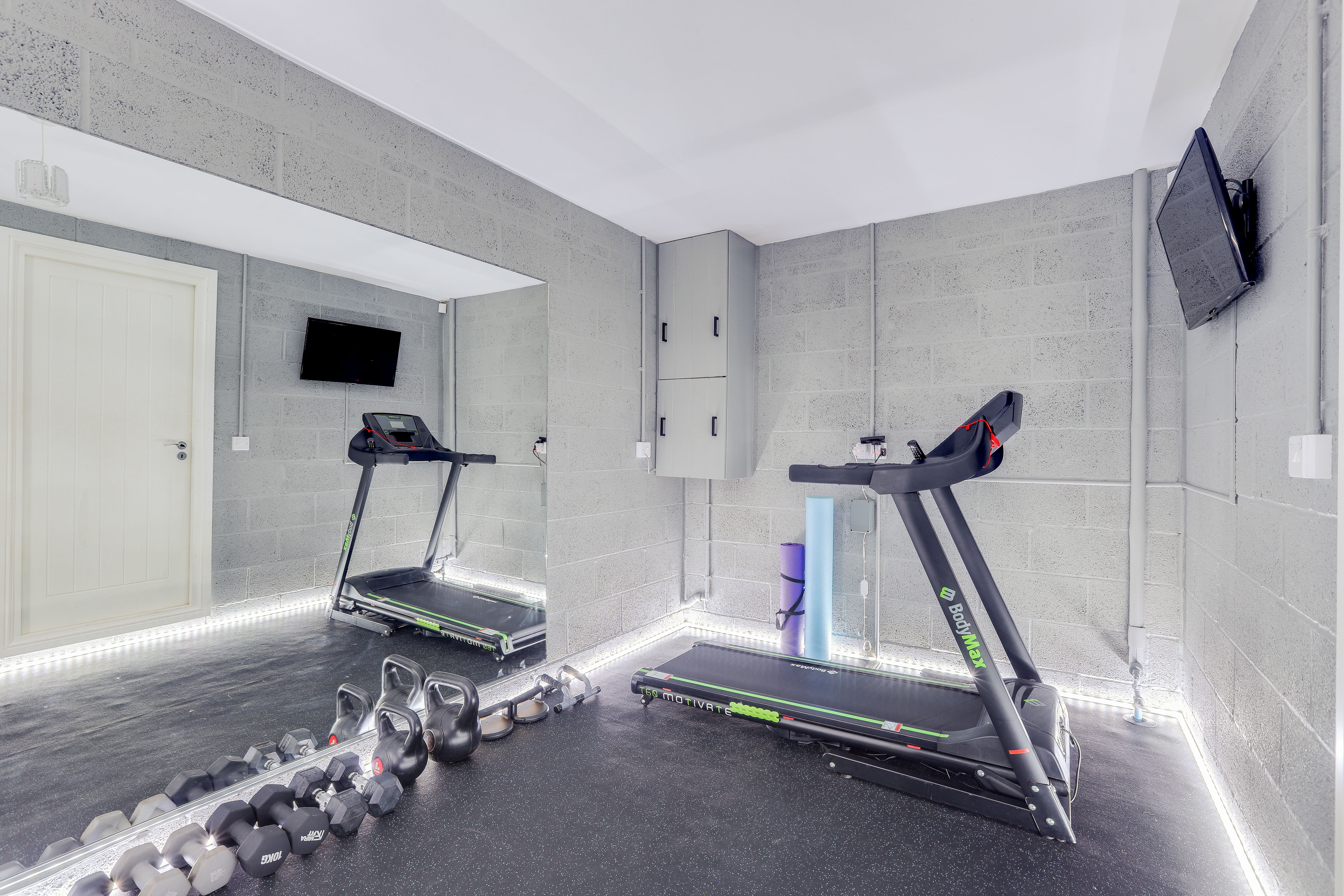 The garage, which is currently being used as a gym, has soft flooring, a large wall-mounted mirror, LED strip lights, power points, an internet ONT, an insulated up-and-over door, and a wall-mounted alarm panel.
