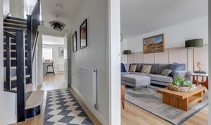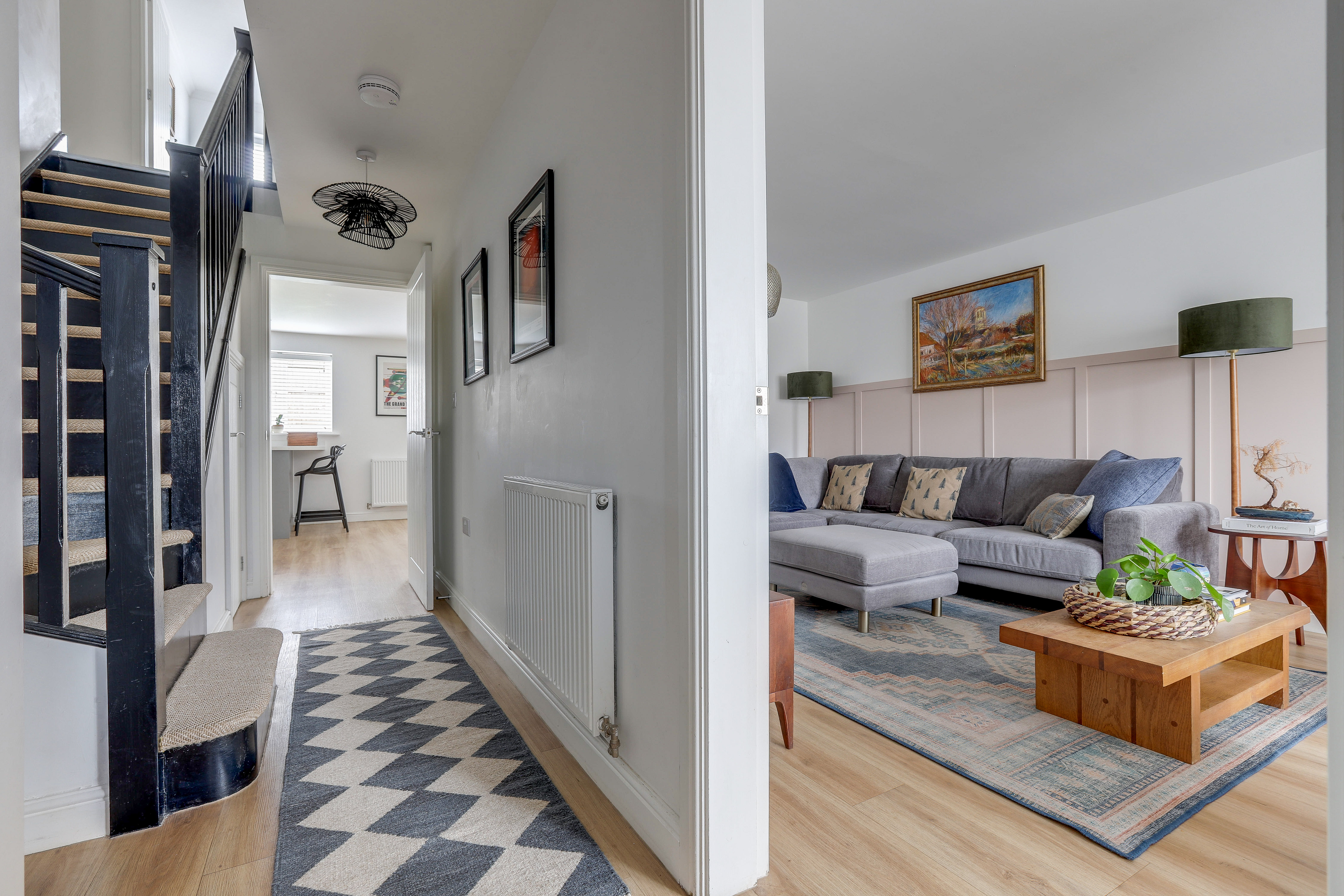 The entrance hall has Moduleo LVT flooring, a radiator, a black-painted staircase with light-coloured carpeted treads, a wall-mounted alarm, access to the garage, and a single composite door providing access into the accommodation.