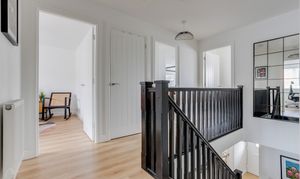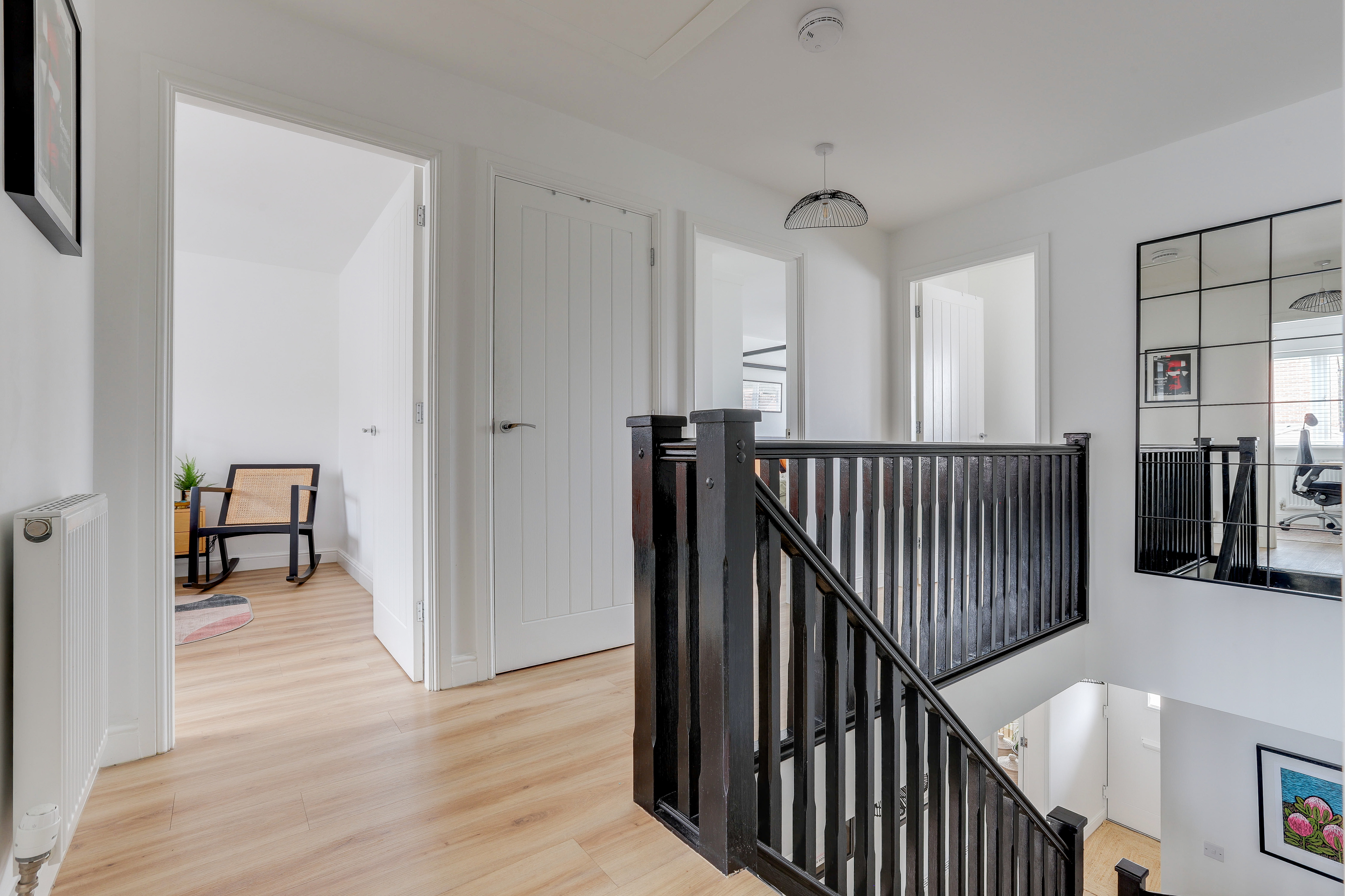 The landing leads to the first-floor rooms, and has Moduleo LVT flooring, a radiator, an in-built airing cupboard, and access to the boarded loft (with lighting and power) via a drop-down ladder.