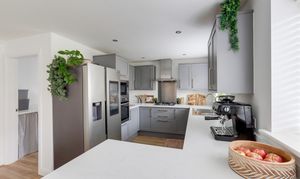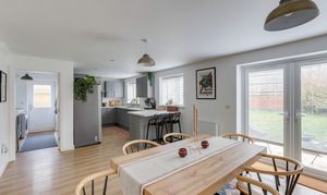 The kitchen has a range of fitted shaker-style base and wall units with a wrap-around worktop and breakfast bar, a stainless steel sink and a half with a swan neck mixer tap and drainer, an integrated oven, an integrated microwave, a four ring gas hob with an extractor hood and stainless steel splashback, an integrated dishwasher, space for an American-style fridge freezer with plumbing, recessed spotlights, Moduleo LVT flooring, an open plan dining area, two radiators, and double French doors with integral blinds opening out to the rear garden.