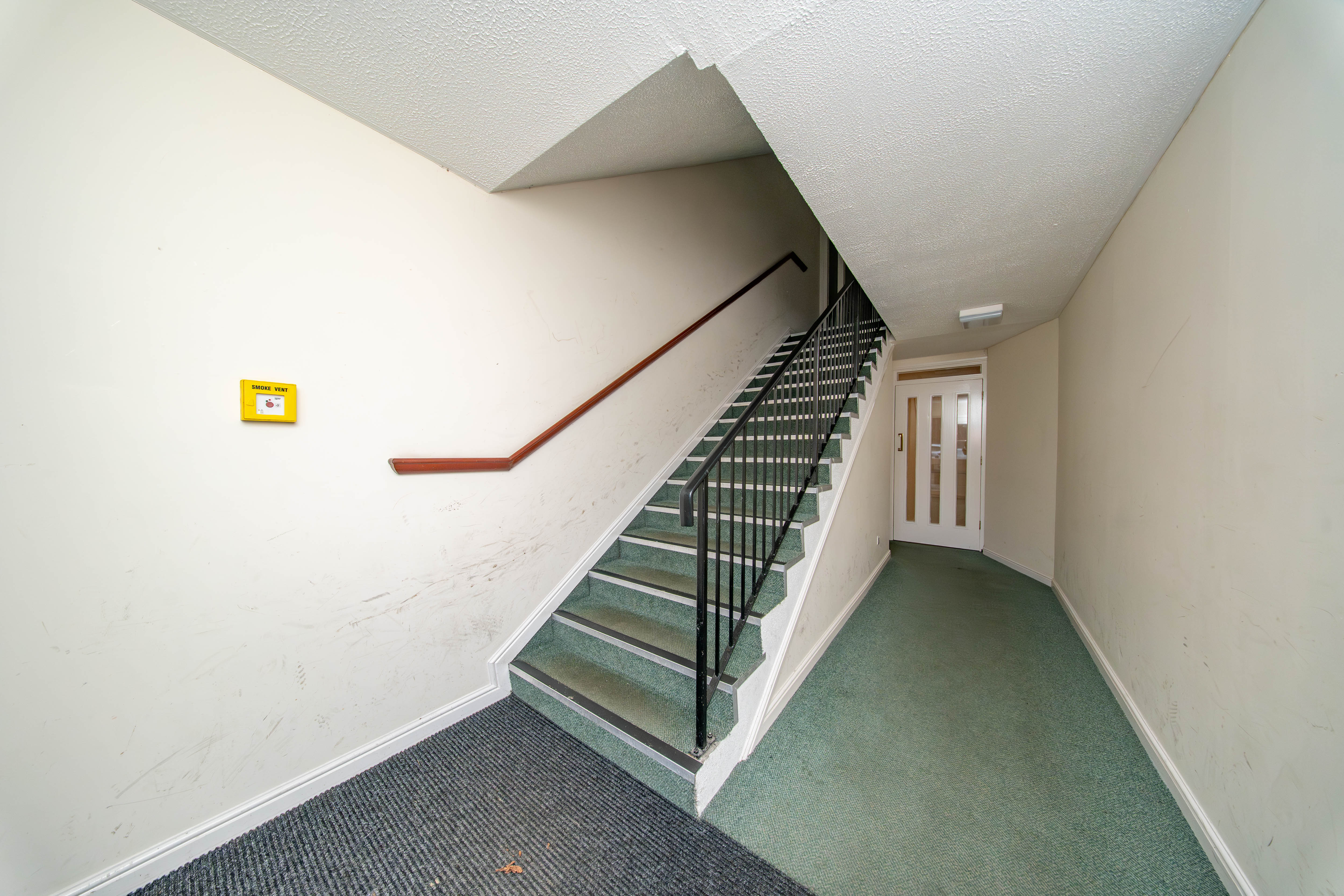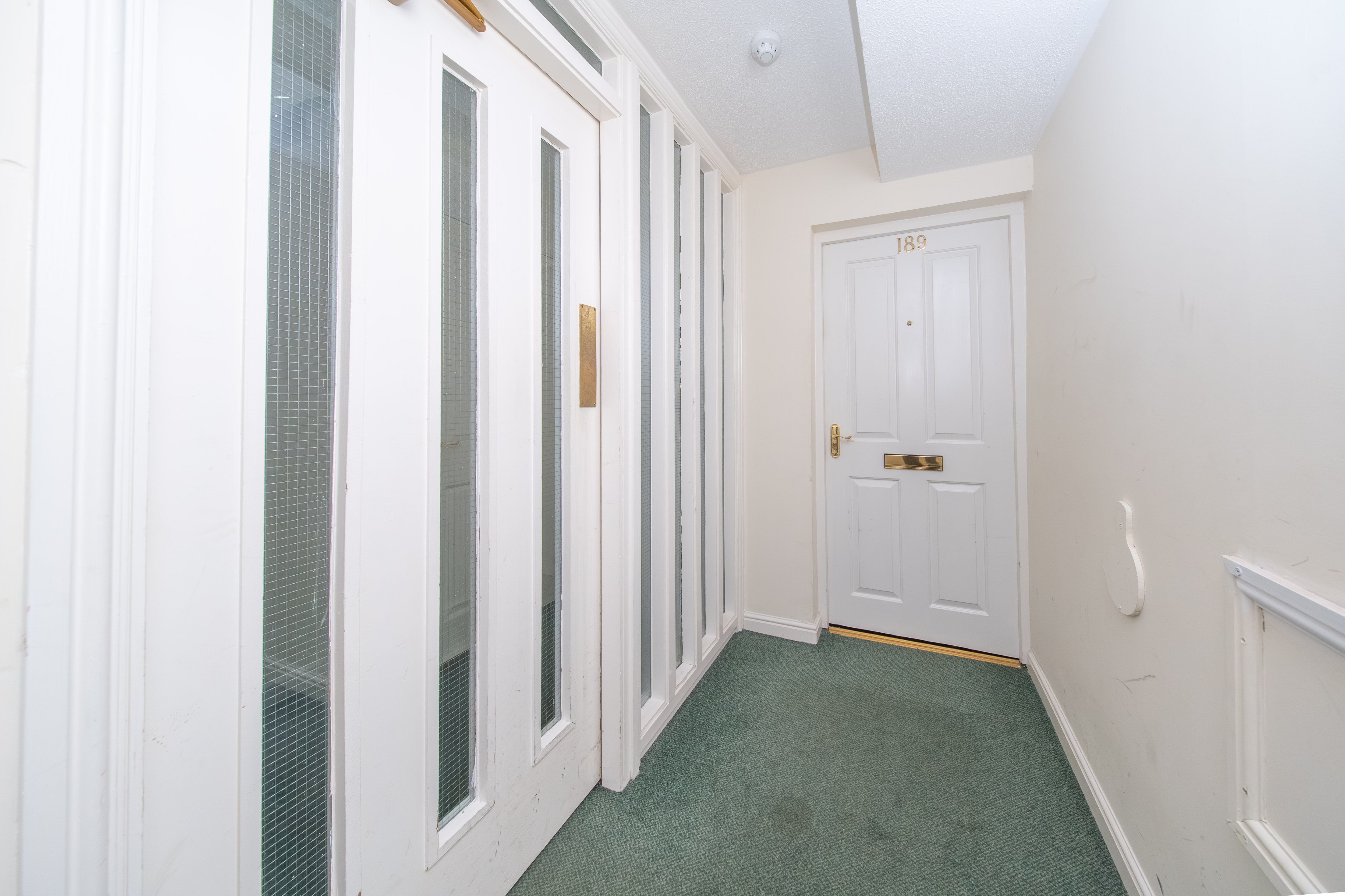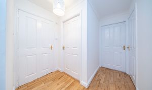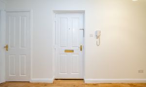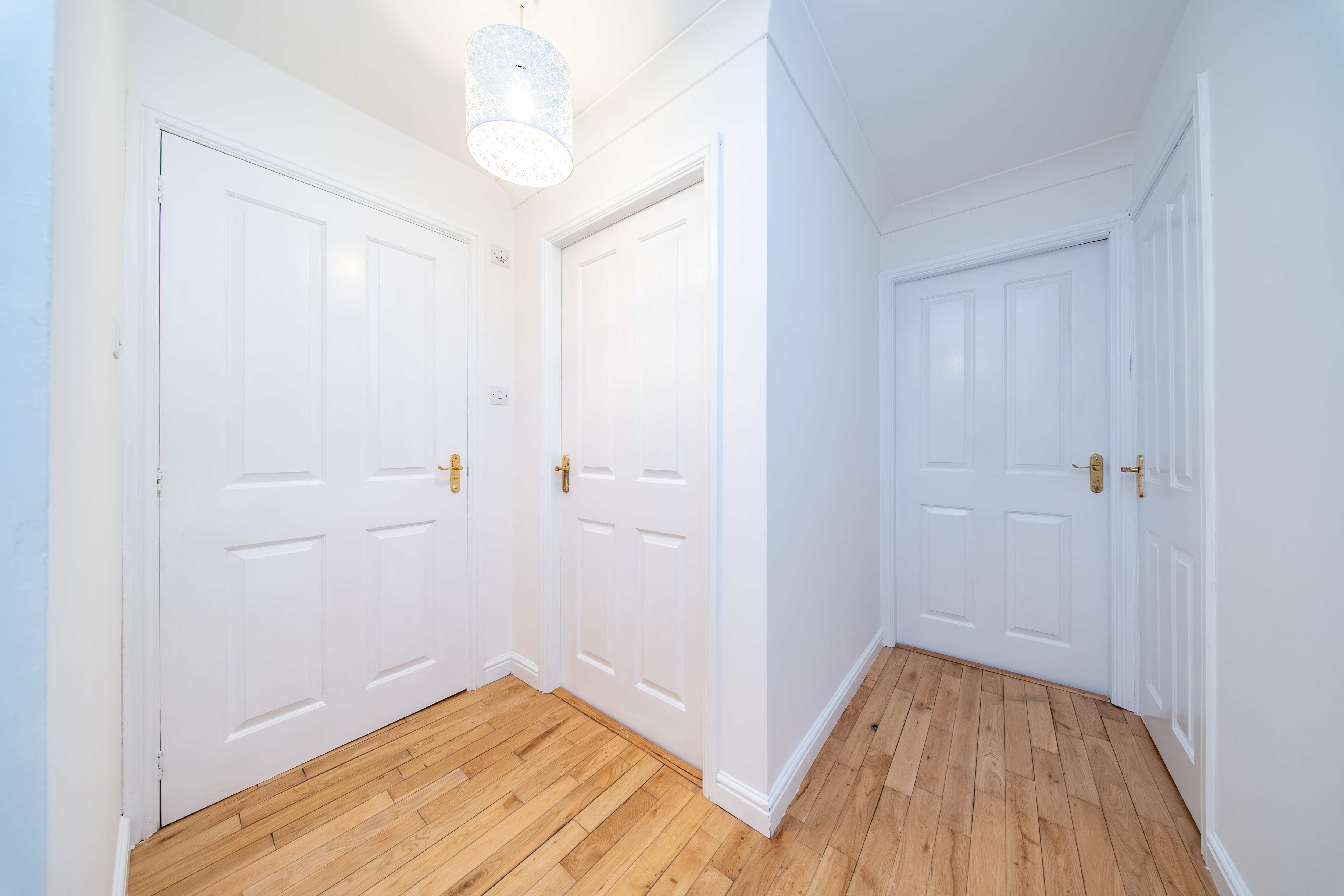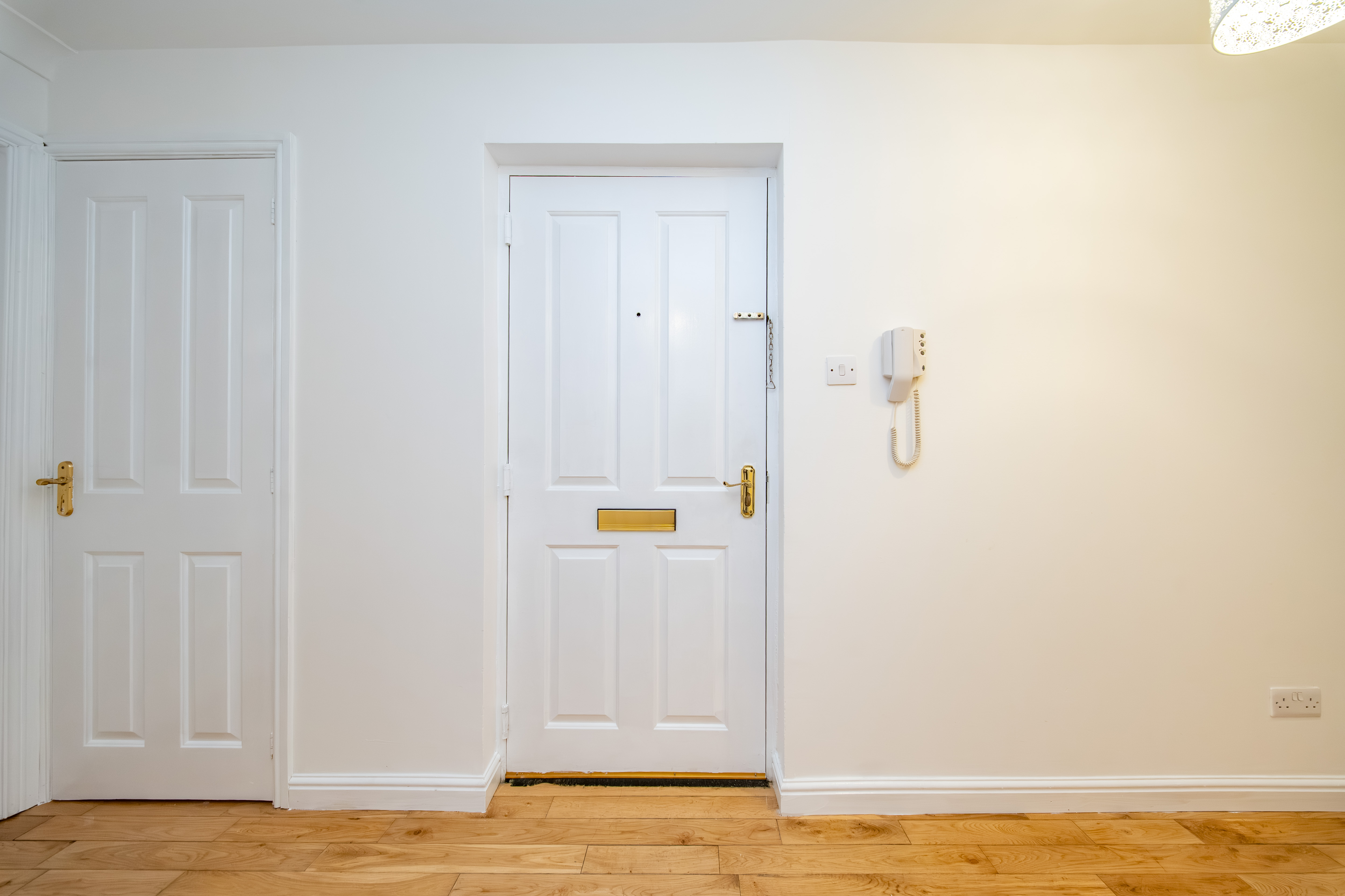 Entry to the building is via a secure wooden and glass door, opening into a carpeted communal corridor that leads to the property’s own wooden entrance door. The contemporary style is immediately apparent, with crisp white painted walls and soft carpeting underfoot.
