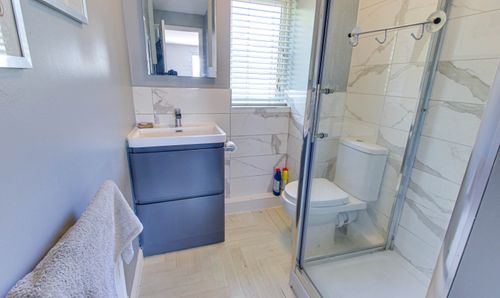 Rear facing upvc window, three piece bathroom suite, splash back tiles and heated towel rails.