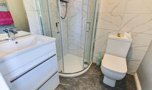 Cubicle shower, sink unit, WC, heated towel rail and marble effect splash backs.